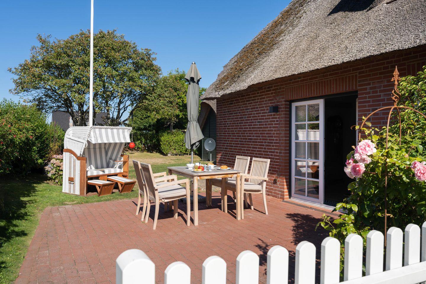Unser Reethus verfügt über zwei Wohnungen mit separaten Eingängen. Jede Wohnung verfügt über einen Gartenanteil inklusive einer Terrasse und einem Strandkorb.