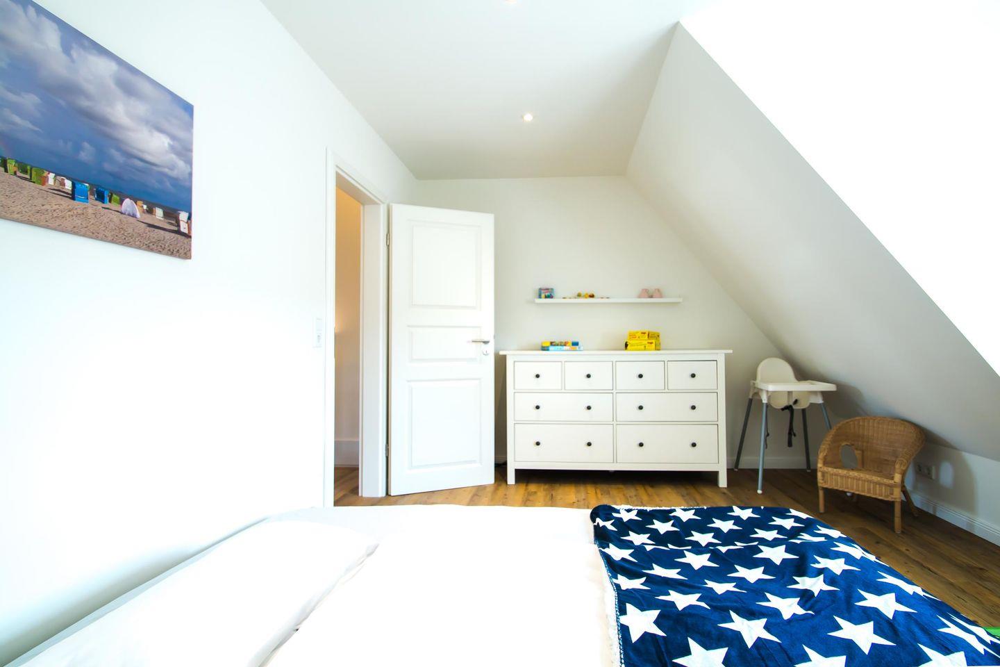 Im Obergeschoss befinden sich die beiden Schlafzimmer sowie ein weiteres Bad mit bodengleicher Dusche. Dieses ist zum Teil in das große Schlafzimmer integriert. Im kleineren Schlafzimmer befindet sich neben dem Einzelbett auch eine Schlafcouch.