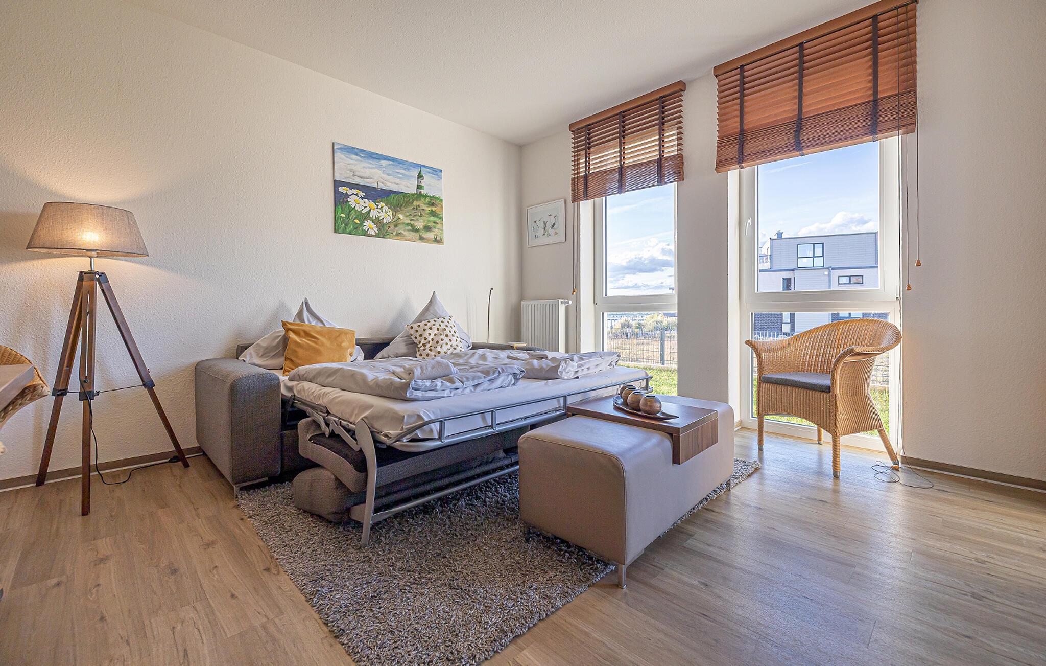 Et særligt plus: I nabobygningen finder I et eksklusivt pool- og wellnessområde, som kan benyttes gratis. Dyk ned i det behageligt tempererede vand med udsigt over Østersøen, eller slap af i saunaen.