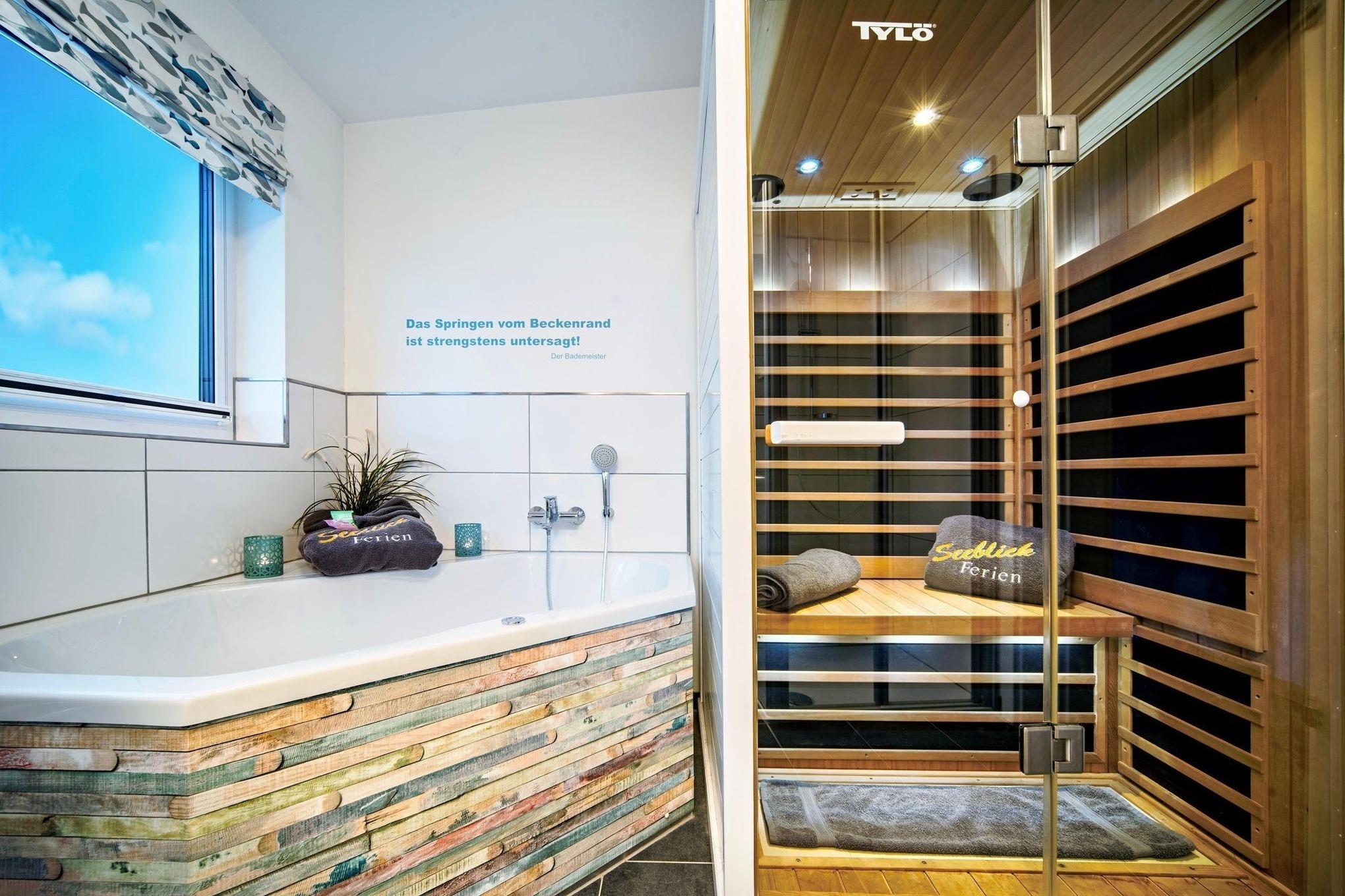 Das Obergeschoss bietet zudem ein vollausgestattetes Bad mit Whirlpoolwanne, bodengleicher Dusche, Infrarotsaunakabine mit LED-Farblichttherapie und HiFi-System mit Anschluss für MP3-Player, USB, Radio und Lautsprecher – ein wahrer Wellnessbereich mit Blick auf das Wasser und das ganze mit samtweichem Wasser, denn das Haus verfügt über eine Entkalkungsanlage.