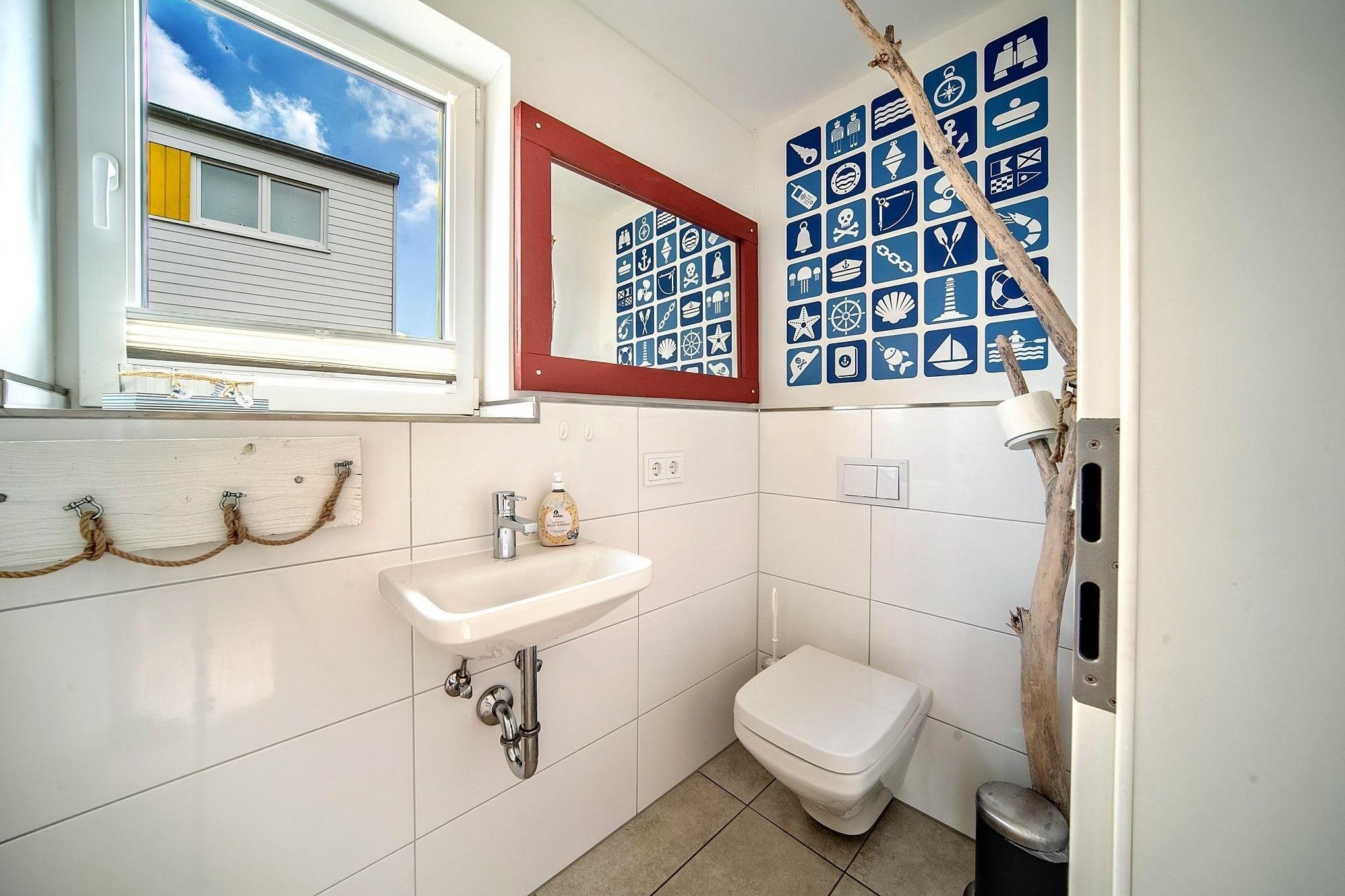 Der offene Wohn- und Essbereich im Erdgeschoss des Ferienhauses bietet Ihnen einen herrlichen Blick auf den Segel- und Sportboothafen des Ostseeresorts Olpenitz. Die bodentiefen Fenster lassen viel Licht herein und schaffen eine lichtdurchflutete Atmosphäre, die zum Verweilen einlädt. Nehmen Sie Platz auf dem roten Echtledersofa und lassen Sie sich von den Seemannsdetails umgeben, die für eine gemütliche und maritime Atmosphäre sorgen.