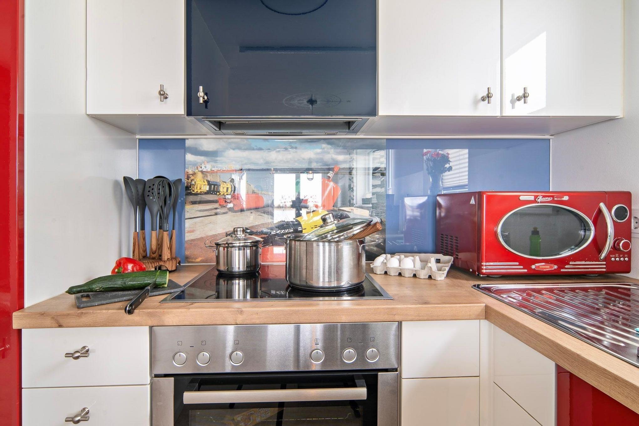 In der farbenfrohen und vollausgestatteten Küche können Sie gemeinsam mit Ihren Liebsten köstliche Mahlzeiten zubereiten und dabei den Blick auf das Wasser genießen. Lassen Sie sich von der inspirierenden Umgebung zu kulinarischen Kreationen hinreisen und verbringen Sie genussvolle Stunden am Esszimmertisch.