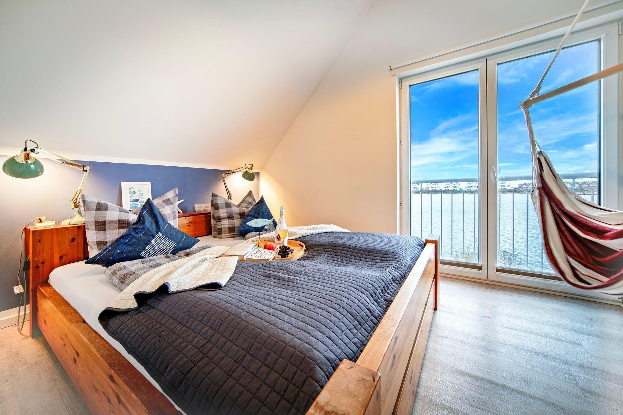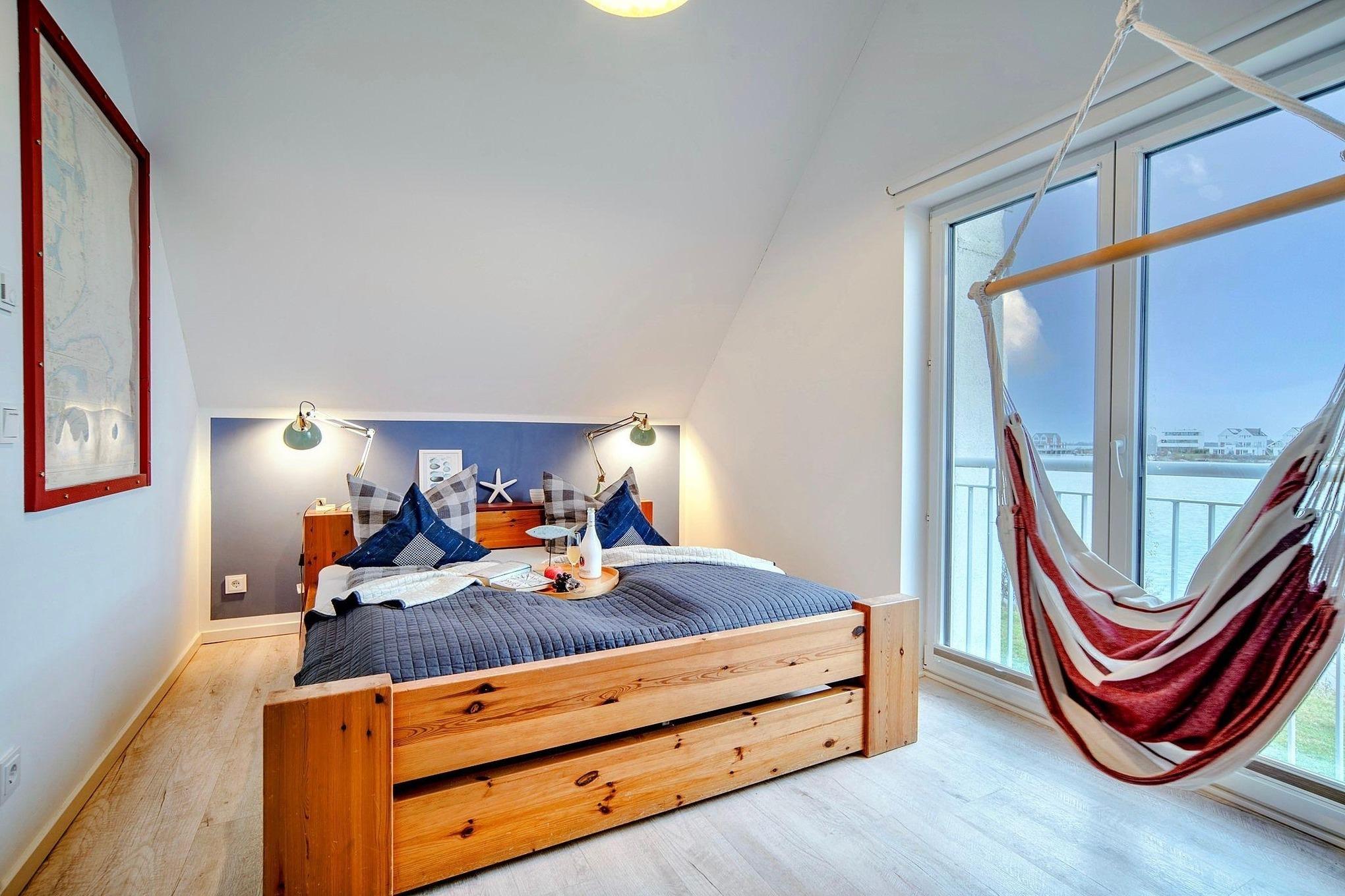 Im Obergeschoss des Ferienhauses finden Sie zwei Schlafzimmer vor, die zum Träumen einladen. Der Masterbedroom verwöhnt Sie mit einem komfortablen Doppelbett und einem atemberaubenden, direkten Wasserblick. Mit einem CD Player für Ihre Lieblingsmusik beginnen Sie den Tag. Das zweite Schlafzimmer verfügt über zwei Einzelbetten, die bei Bedarf auch zu einem Doppelbett umfunktioniert werden können, sowie ein hochwertiges Schrankbett.