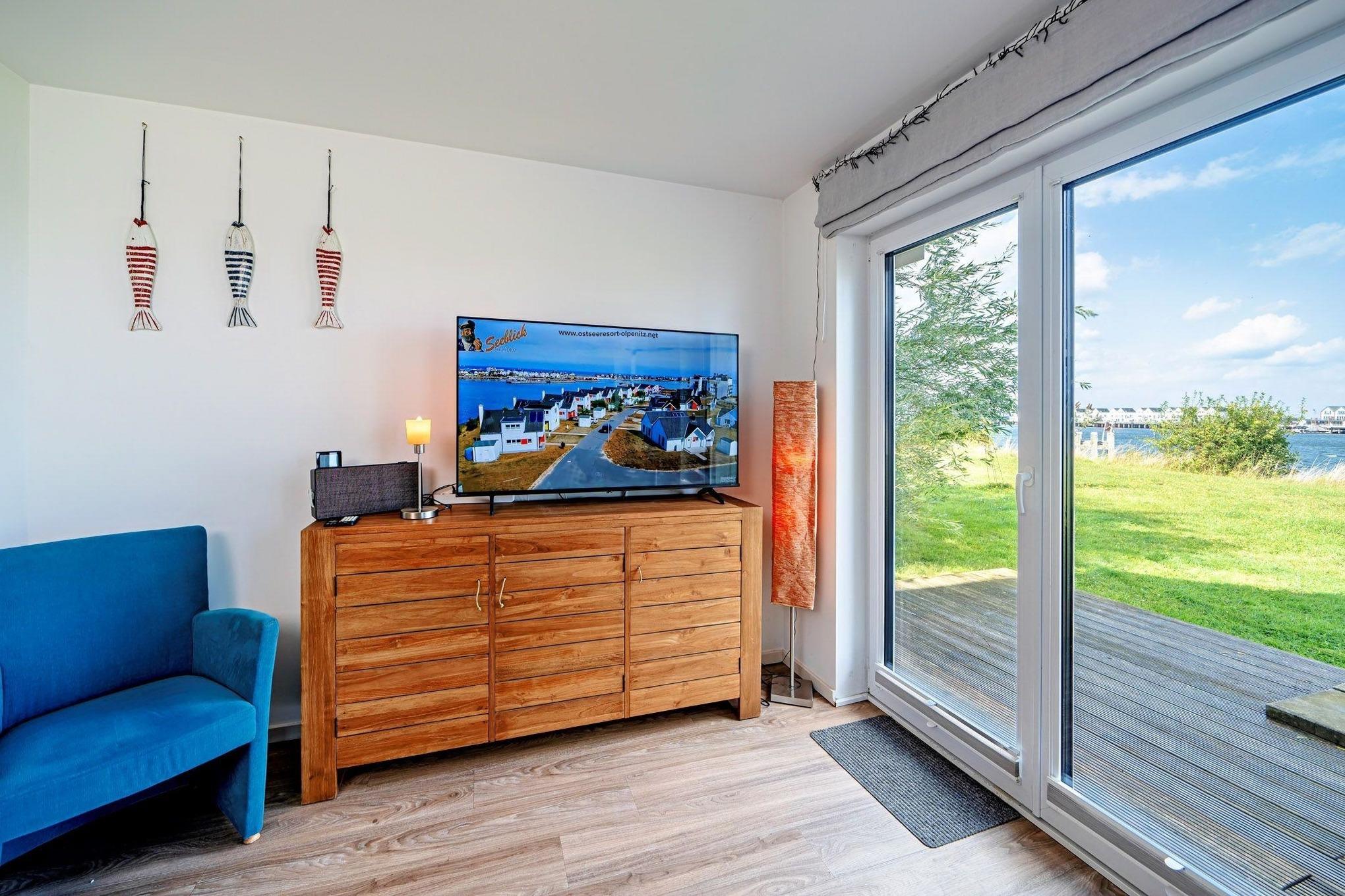 Der offene Wohnbereich im Erdgeschoss ist der perfekte Ort, um den Blick auf das glitzernde Wasser zu genießen. Ob beim gemeinsamen Essen oder bei einem gemütlichen Kaminabend im Wohnzimmer – hier erleben Sie Ostsee-Feeling pur.
