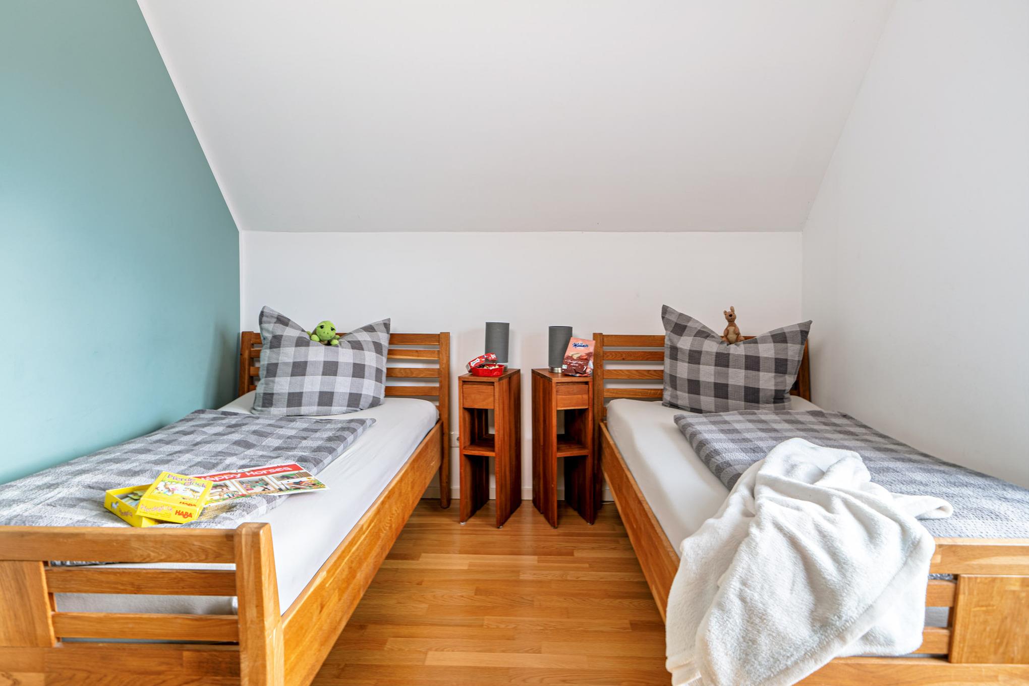 Im ersten Obergeschoss erwartet Sie ein Ruhebereich mit beeindruckendem Meerblick. Das Hauptschlafzimmer ist mit einem komfortablen Boxspringbett ausgestattet, während im zweiten Schlafzimmer zwei Einzelbetten zur Verfügung stehen. Für unsere kleinsten Gäste stellen wir gerne ein Babybett bereit.