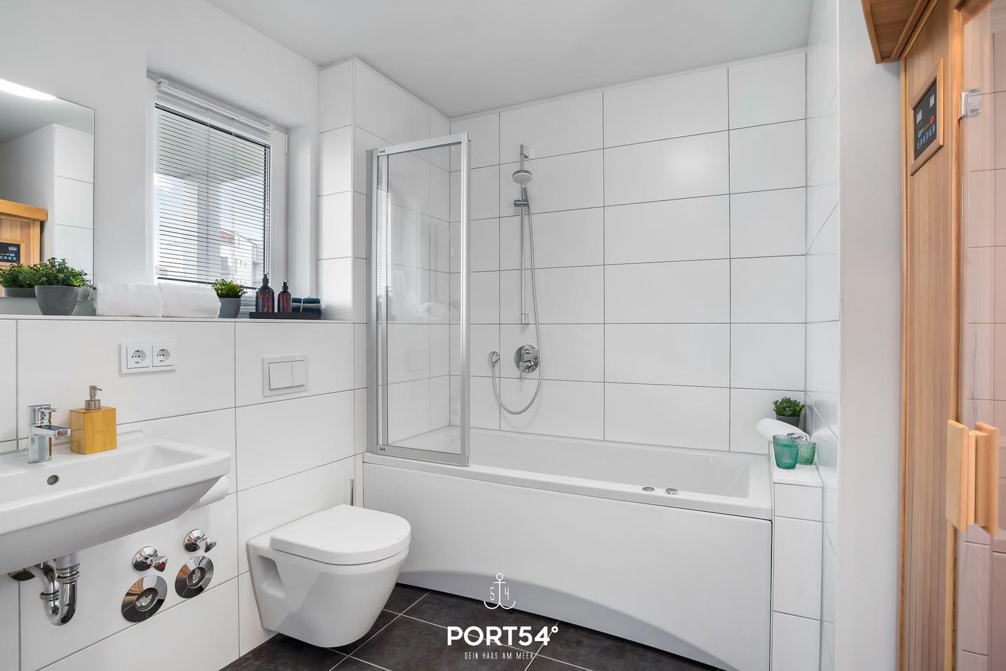 Das moderne Badezimmer verfügt über eine Infrarot-Sauna und eine Whirlwanne, in der Du es Dir zu jeder Jahreszeit gemütlich machen kannst. Die möblierte Terrasse ist perfekt für einen entspannten Grillabend im Sommer.