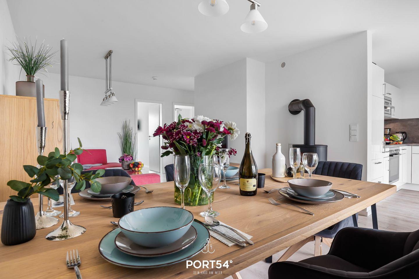 Die Wohnung bietet auf 82 qm neben zwei Schlafzimmern einen Wohn- und Essbereich mit angrenzender, offener Küche sowie ein Badezimmer. Die lichtdurchflutete Wohnung ermöglicht Dir einen Urlaub mit bis zu fünf Personen. Neben zwei Doppelbetten (180x200 cm) steht Dir eine gemütliche Schlafcouch im Wohnbereich zur Verfügung. Hier kannst Du ebenso gesellige Abende vor dem Kamin verbringen. Die voll ausgestattete, moderne Küche bietet sich alternativ für gemeinsame Kochabende an.