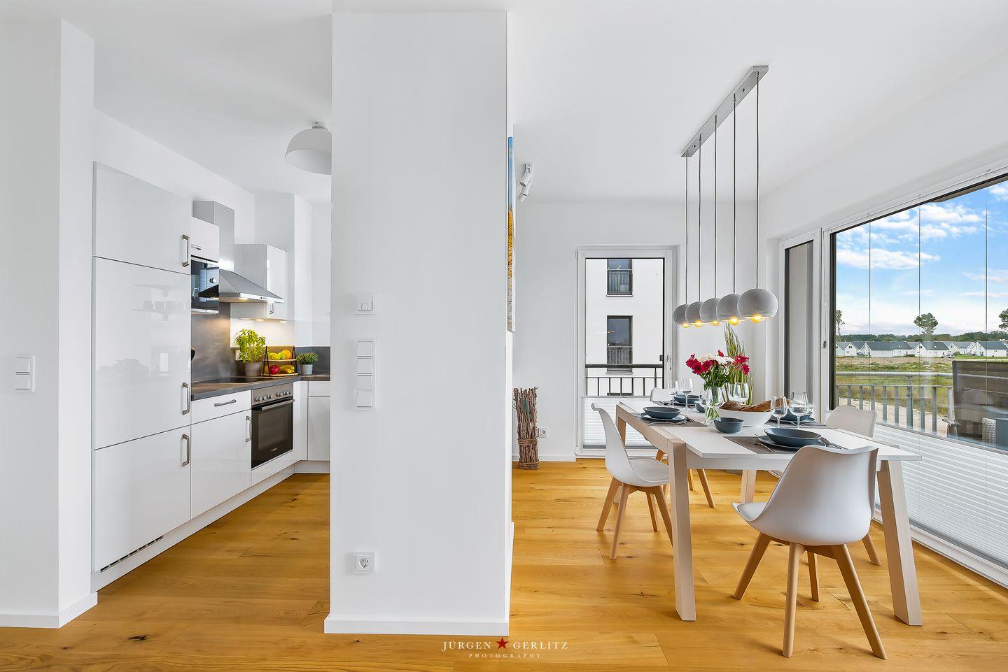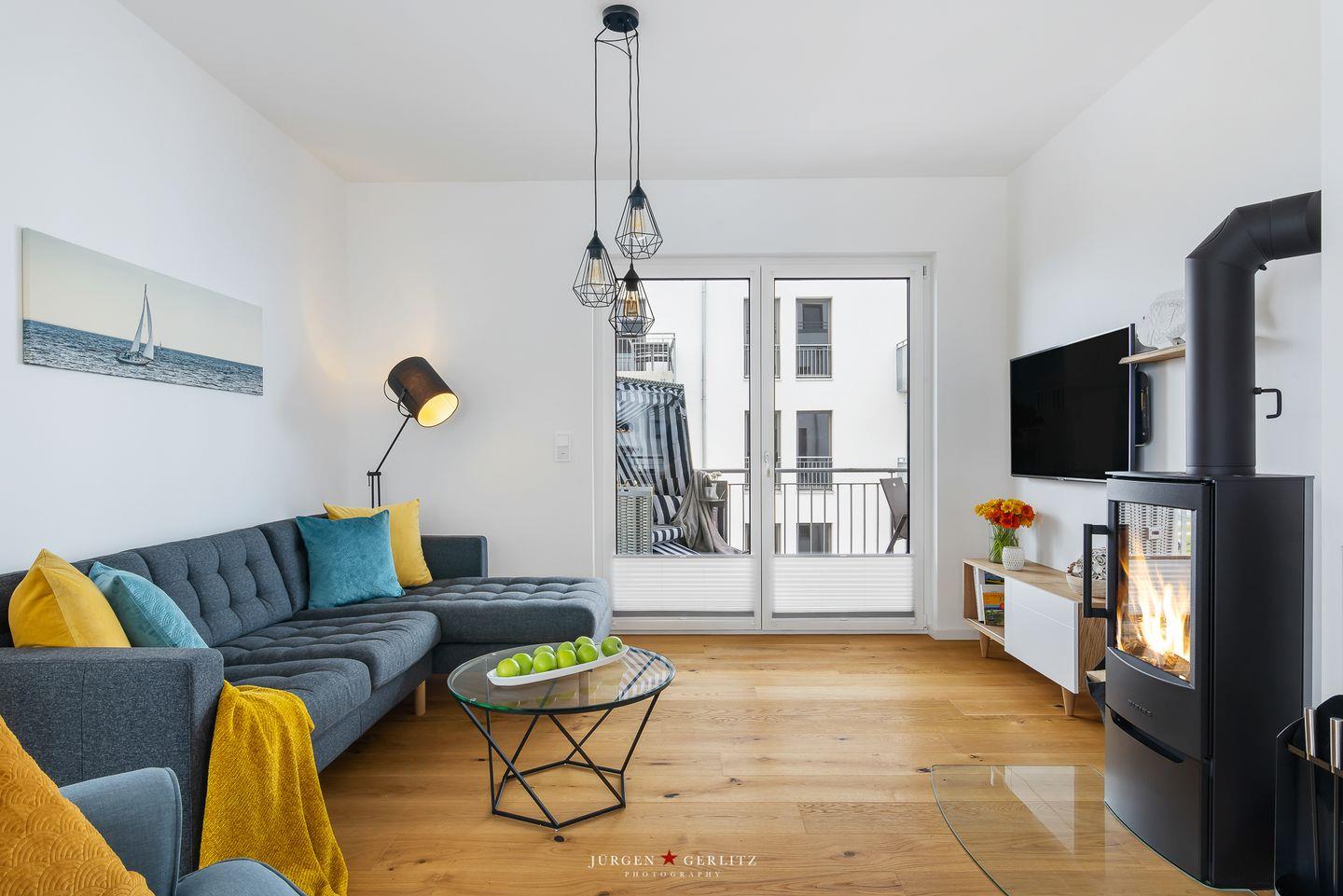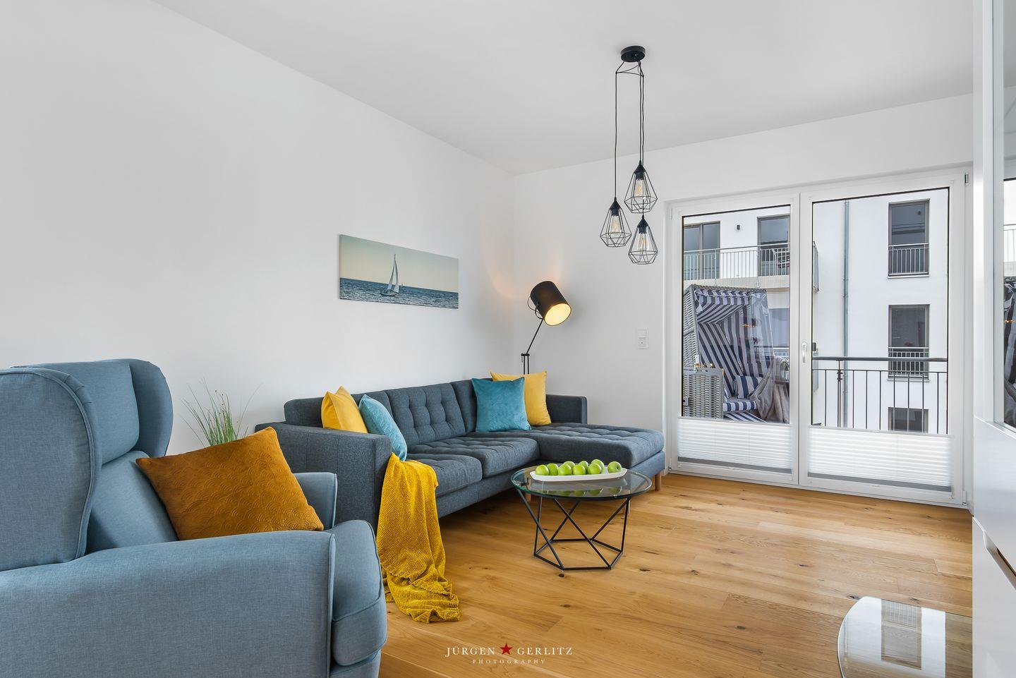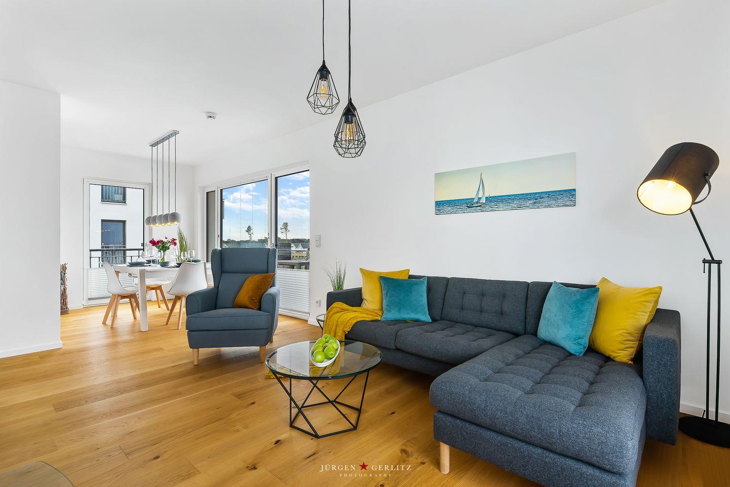 Tauchen Sie ein in das einzigartige Urlaubsfeeling der Ferienwohnung "Ocean's 16", die auf großzügigen 78m² pure Erholung verspricht. Das gesamte Apartment ist barrierearm gestaltet und mit hochwertigem Echtholz-Parkett ausgestattet, das eine warme und gemütliche Atmosphäre schafft. Der offene Wohn-/Essbereich ist nicht nur modern, sondern dank bodentiefer Fenster auch lichtdurchflutet und bietet Zugang zu gleich zwei Balkonen. Hier können Sie entspannte Momente genießen und die frische Meeresbrise auf sich wirken lassen. Ein weiteres Highlight in diesem Bereich ist der einladende Kamin, der für gemütliche Abende sorgt, perfekt zum Zurücklehnen und Entspannen. Die hochwertige Küche ist mit allem ausgestattet, was das Herz begehrt, um gemeinsam mit Ihren Liebsten leckere Gerichte zu zaubern. Das Apartment beherbergt zwei moderne Schlafzimmer: In einem erwartet Sie ein komfortables Doppelbett, im anderen zwei Einzelbetten, die bei Bedarf zu einem weiteren Doppelbett arrangiert werden können. Beide Schlafzimmer sind mit Plissees ausgestattet. Das moderne Badezimmer beeindruckt mit einer großzügigen, ebenerdigen Dusche, die den Morgen erfrischend starten lässt. Eine Waschmaschine steht ebenfalls zur Verfügung, sodass auch längeren Aufenthalten nichts im Wege steht. Und das Beste: Auch Ihr Vierbeiner ist hier herzlich willkommen! Das absolute Highlight des Apartments sind zweifellos die beiden Balkone, von denen aus Sie eine atemberaubende Aussicht auf das Wasser, die Kapitänsinsel und den Hafen genießen können. Hier erleben Sie Sonnenaufgänge und -untergänge in einer Kulisse, die Ihre Sinne verzaubern wird.