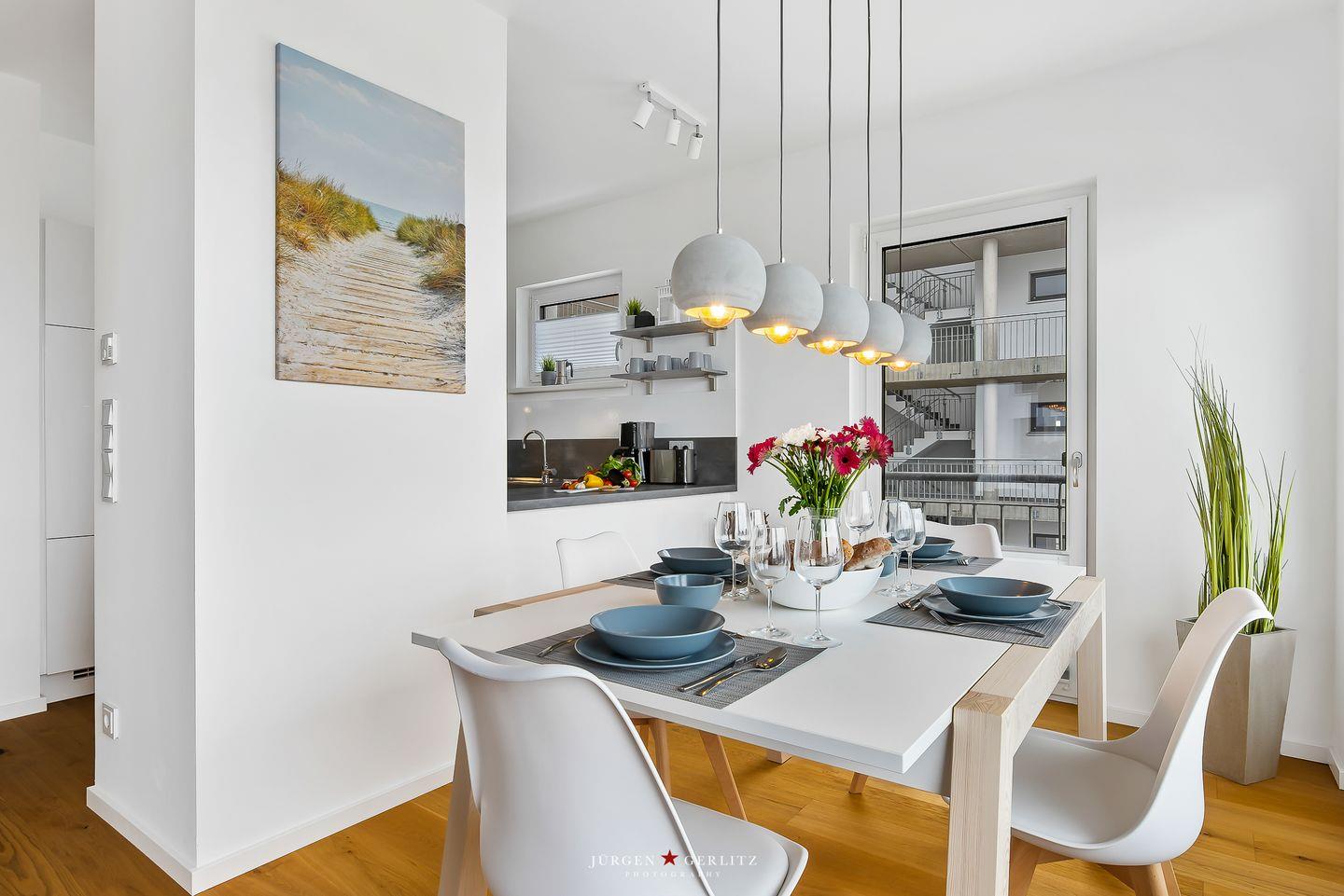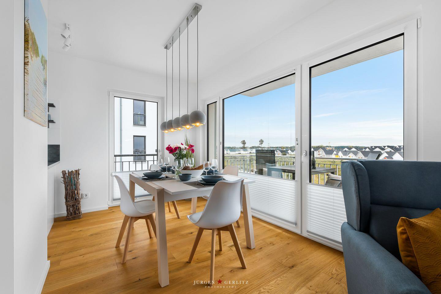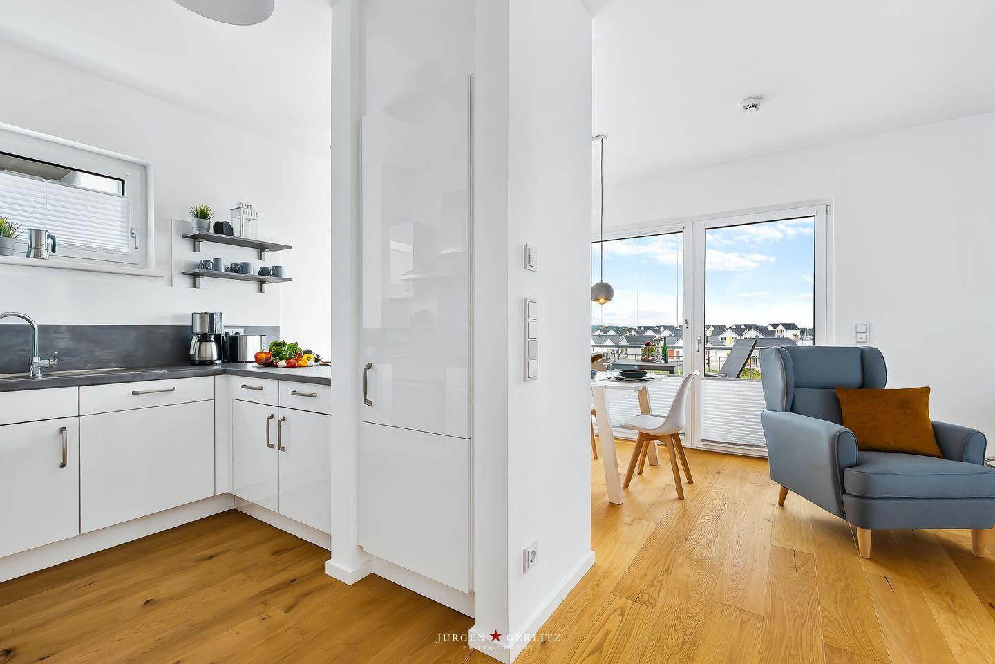 Tauchen Sie ein in das einzigartige Urlaubsfeeling der Ferienwohnung "Ocean's 16", die auf großzügigen 78m² pure Erholung verspricht. Das gesamte Apartment ist barrierearm gestaltet und mit hochwertigem Echtholz-Parkett ausgestattet, das eine warme und gemütliche Atmosphäre schafft. Der offene Wohn-/Essbereich ist nicht nur modern, sondern dank bodentiefer Fenster auch lichtdurchflutet und bietet Zugang zu gleich zwei Balkonen. Hier können Sie entspannte Momente genießen und die frische Meeresbrise auf sich wirken lassen. Ein weiteres Highlight in diesem Bereich ist der einladende Kamin, der für gemütliche Abende sorgt, perfekt zum Zurücklehnen und Entspannen. Die hochwertige Küche ist mit allem ausgestattet, was das Herz begehrt, um gemeinsam mit Ihren Liebsten leckere Gerichte zu zaubern. Das Apartment beherbergt zwei moderne Schlafzimmer: In einem erwartet Sie ein komfortables Doppelbett, im anderen zwei Einzelbetten, die bei Bedarf zu einem weiteren Doppelbett arrangiert werden können. Beide Schlafzimmer sind mit Plissees ausgestattet. Das moderne Badezimmer beeindruckt mit einer großzügigen, ebenerdigen Dusche, die den Morgen erfrischend starten lässt. Eine Waschmaschine steht ebenfalls zur Verfügung, sodass auch längeren Aufenthalten nichts im Wege steht. Und das Beste: Auch Ihr Vierbeiner ist hier herzlich willkommen! Das absolute Highlight des Apartments sind zweifellos die beiden Balkone, von denen aus Sie eine atemberaubende Aussicht auf das Wasser, die Kapitänsinsel und den Hafen genießen können. Hier erleben Sie Sonnenaufgänge und -untergänge in einer Kulisse, die Ihre Sinne verzaubern wird.