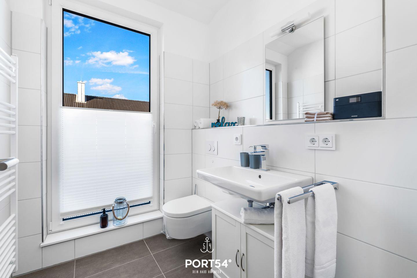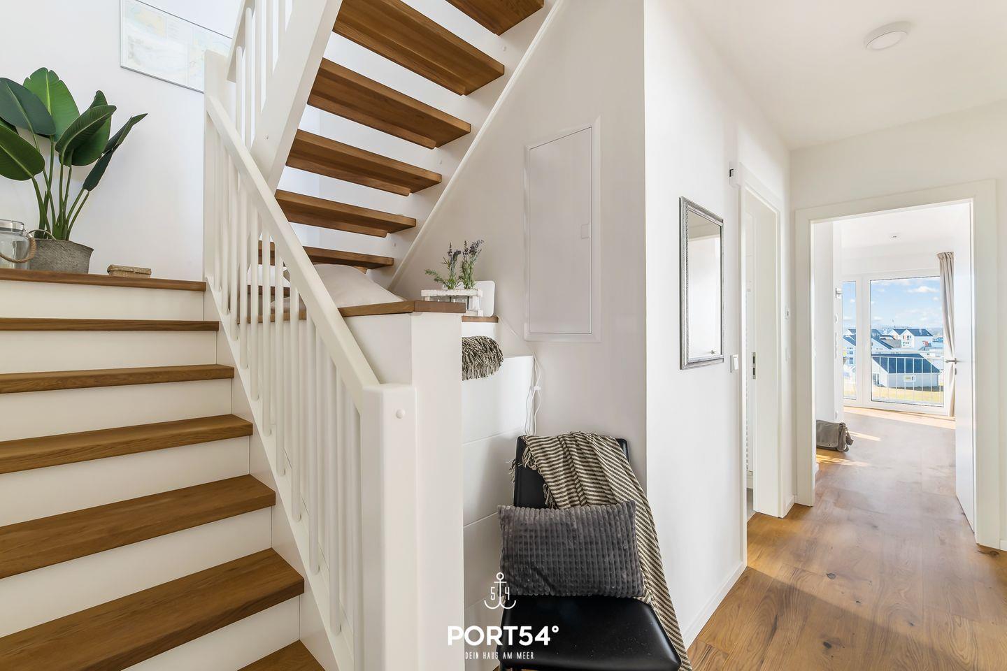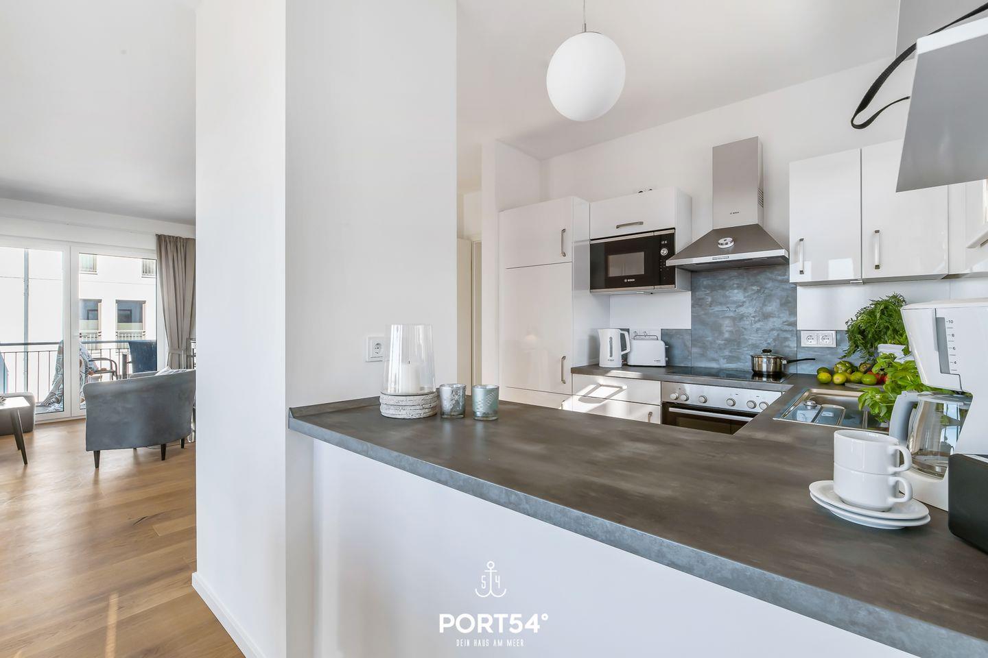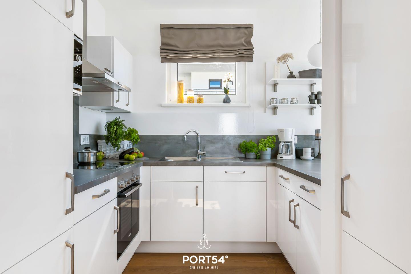 Im vierten Obergeschoss befindet sich ein weiterer, offen gestalteter Wohnbereich mit Zugang zur Dachterrasse. In diesem Bereich ist ein drittes Doppelbett integriert, sodass dort ein zusätzlicher Schlafplatz entsteht. Im Wohnbereich steht zudem eine Schlafcouch bereit, die Platz für zwei weitere Personen bietet. Ebenfalls befindet sich dort ein Kaminofen für gemütliche Stunden. Flachbild TVs in beiden Wohnbereichen bieten auch an regnerischen Tagen ein gutes Programm. Die hochwertige und moderne Küche ist mit allem ausgestattet, was im Alltag gebraucht wird. Neben einem Toaster und Wasserkocher steht eine Filterkaffeemaschine zur Verfügung. Im geräumigen Badezimmer im Obergeschoss befindet sich eine ebenerdige Dusche. Gerne können Sie auf Anfrage auch Ihre vierbeinigen Familienmitglieder mitnehmen. Das Highlight der Wohnung ist neben den zwei Balkonen im dritten Obergeschoss, die Dachterrasse im vierten Obergeschoss. Auf zwei Sonnenliegen kann man hier das Wetter genießen. Die Fasssauna ist perfekt, um nach einem ausgiebigen Spaziergang einfach mal zu entspannen & das natürlich auch mit Meerblick. Einer der Balkone verfügt über eine Sitzecke, der andere über einen kleineren Tisch mit zwei Stühlen. Ihren PKW können Sie auf dem zur Ferienwohnung gehörenden Parkplatz vor dem Apartmenthaus parken. Ein Aufzug im Gebäude bringt Sie in Ihre Wohnung im dritten Stock. Ein weiterer Zugang zum Aufzug befindet sich zudem im vierten Stock. Für Ihre Fahrräder gibt es einen abschließbaren Gemeinschaftsschuppen.