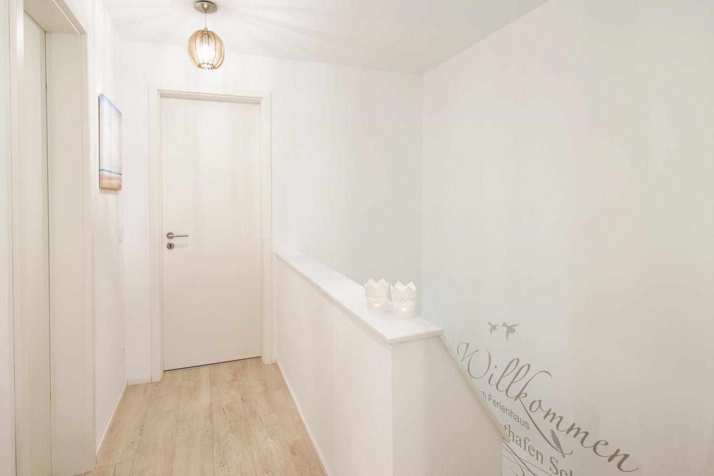 Nach Betreten befinden Sie sich im Wohn- und Essbereich mit Kamin. Die Küche ist voll ausgestattet. Im 1.OG sind die beiden Schlafzimmer. Highlights sind das Wellnessbad mit finnischer Sauna und die Dachterrasse, von der Sie einen tollen 360° Wasserblick haben. Stellplätze für 2 PKW und ein Fahrradschuppen sind vorhanden.