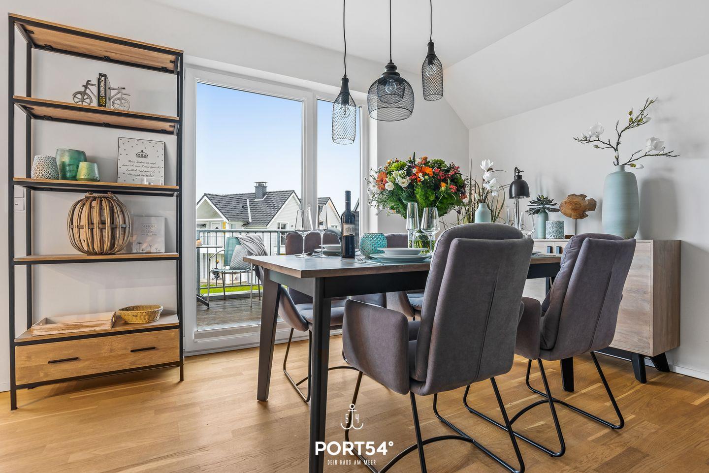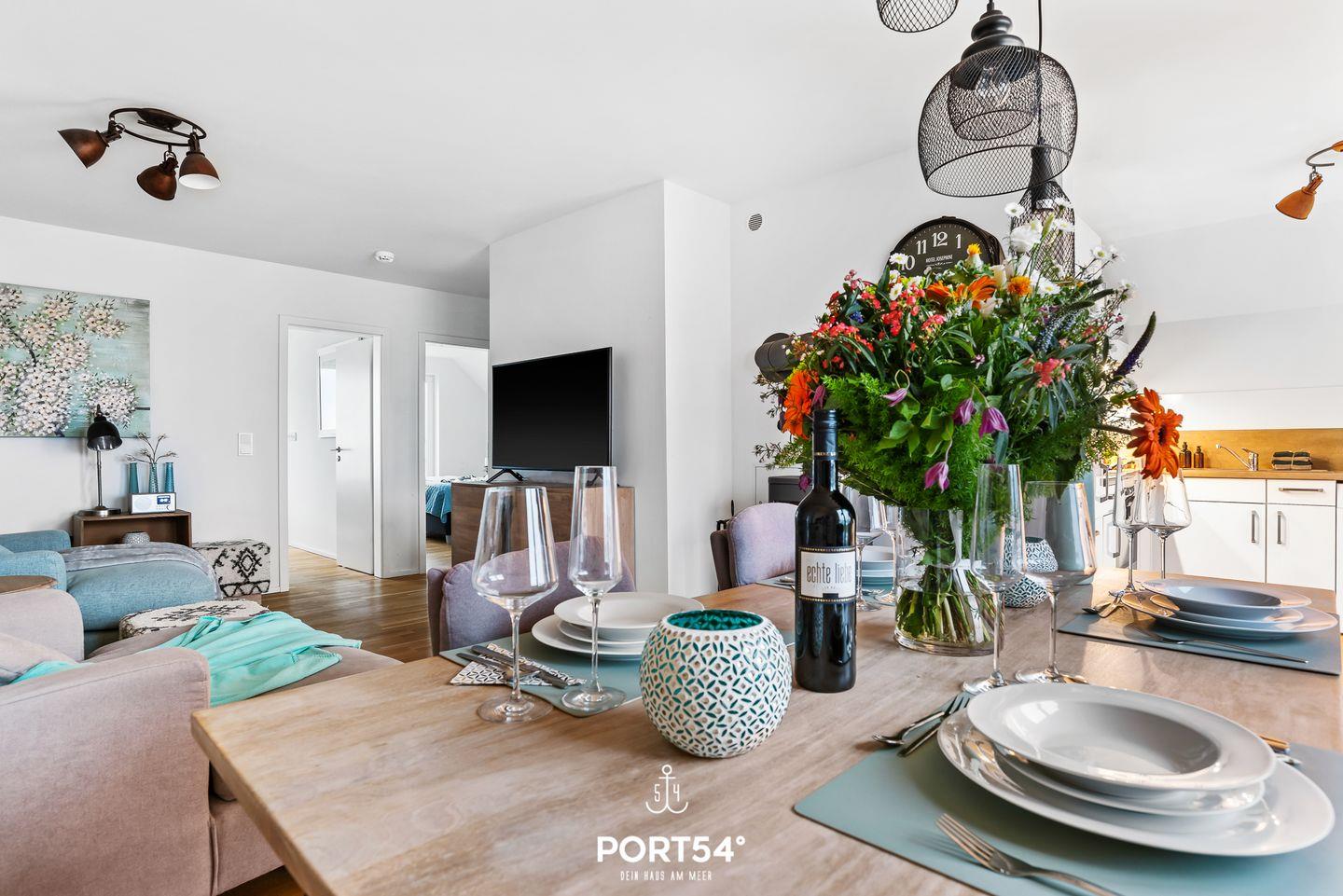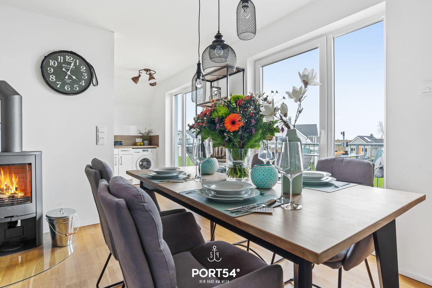 Die Unterkunft "Mein Ankerplatz 52" bietet einen unvergesslichen Urlaub mit Weit- und Meerblick. Im offen gestalteten Wohnzimmer mit Kamin und Zugang zum großzügigen, möblierten Balkon können Sie es sich auf der großen Couch gemütlich machen. Die Küche ist modern und voll ausgestattet, und bietet im angrenzenden Essbereich Platz für bis zu 4 Personen. Beide Schlafzimmer verfügen über Doppelbetten (180x200cm). Im Badezimmer erwartet Sie neben einer Whirlwanne mit Dusche auch eine Infrarot-Sauna. Hier können Sie den Alltagsstress vergessen und sich entspannen. Gerne dürfen Ihre vierbeinigen Familienmitglieder auf Anfrage mit Aufpreis mitreisen. Auf dem Balkon können Sie entspannen, dank des Elektro-Grill gesellige Abende zusammen verbringen und den Blick aufs Wasser genießen.