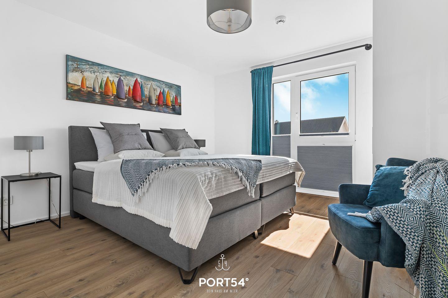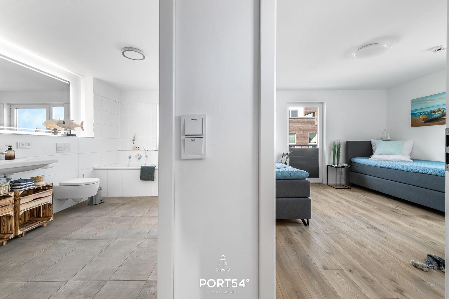 Die drei Schlafzimmer, zu finden in der ersten Etage, präsentieren sich als Oase der Erholung. Hochwertige Boxspringbetten laden Dich zu erholsamen Nächten ein, während ein TV und Verdunklungsmöglichkeiten für zusätzlichen Komfort sorgen. Zwei der Schlafzimmer verführen mit großzügigen Doppelbetten (180 × 200 cm), während das dritte Schlafzimmer mit zwei Einzelbetten (100 × 200 cm) und einem eigenen Balkon aufwartet – der perfekte Platz, um den Blick auf den malerischen Hafen von Olpenitz zu genießen. Ein Badezimmer mit Badewanne auf derselben Etage rundet Dein Wohlfühlerlebnis ab.