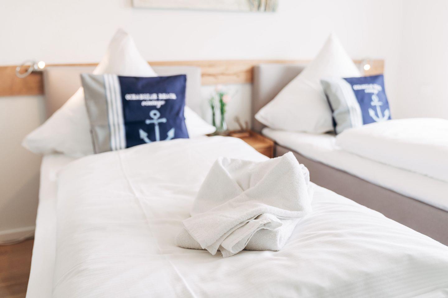 Ein Schlafzimmer ist mit einem Doppelbett (180x200 cm) ausgestattet, das zweite Schlafzimmer verfügt über zwei Einzelbetten (je 90x200 cm).