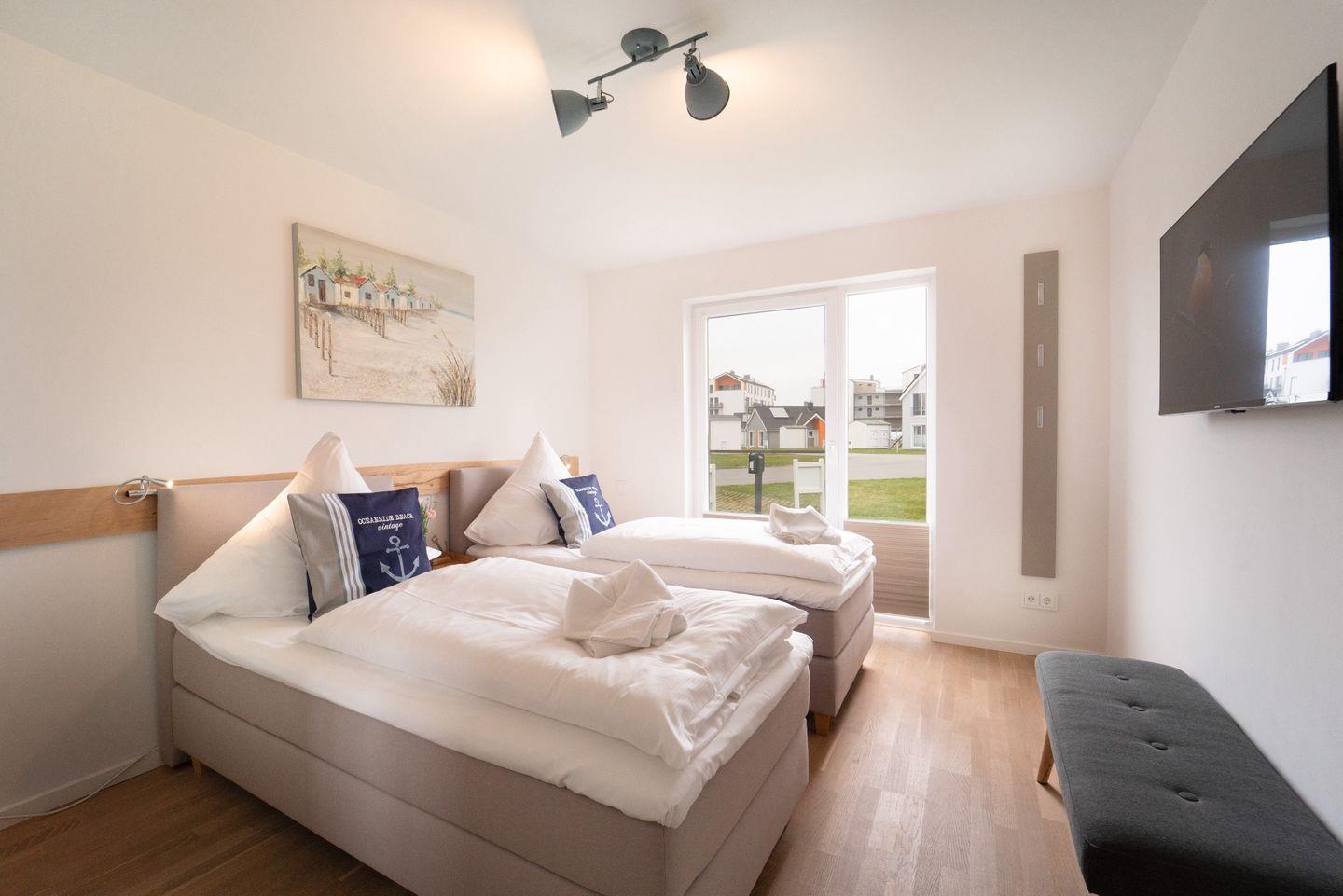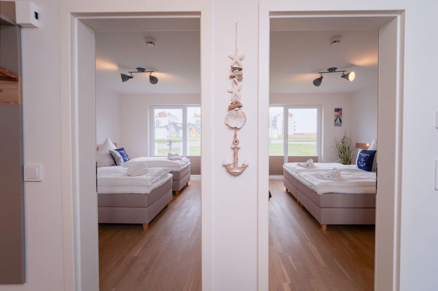In dieser modernen und gemütlich eingerichteten Wohnung fühlen Sie sich schnell wie Zuhause. Der "Heimathafen Schlei" bietet mit 2 Schlafzimmern und einem großen offenen Wohn-/Essbereich reichlich Platz für bis zu 4 Personen. Die exzellente Lage wie der fußläufig erreichbare Strand bringt sofort Entspannung pur, sodass der Alltag schnell in Vergessenheit gerät. Der große Wohn- und Essbereich ist modern eingerichtet und durch bodentiefe Fenster sehr hell. In der kalten Jahreszeit können Sie es sich dank der Fußbodenheizung in allen Räumen sowie vor dem Kamin im Wohnzimmer gemütlich machen. Die offene und hochwertige Küche lädt zu gemütlichen Kochabenden ein. Ein Schlafzimmer verfügt über ein Doppelbett (180x200cm), das zweite Schlafzimmer über 2 Einzelbetten (je 90x200cm). Beide Schlafzimmer verfügen über einen Flatscreen-TV und Verdunkelungsmöglichkeiten. Ihre Wertgegenstände können Sie sicher in dem dafür vorgesehenen Safe verwahren. Nach einem Spaziergang an der frischen Ostseeluft können Sie sich in der Infrarot-Sauna und in der Whirlwanne erholen. Abends können Sie den Tag wunderbar mit einem Glas Wein auf der Terrasse ausklingen lassen und die Sonne am Horizont untergehen sehen. Die Natur rundherum lädt zum Wandern und Radfahren ein, im Sommer blühen die Rapsfelder wunderschön und auch die Kinder kommen nicht zu kurz. Direkt am Haus gibt es 2 Parkplätze, eine Lademöglichkeit für E-Bikes und einen Fahrradschuppen.