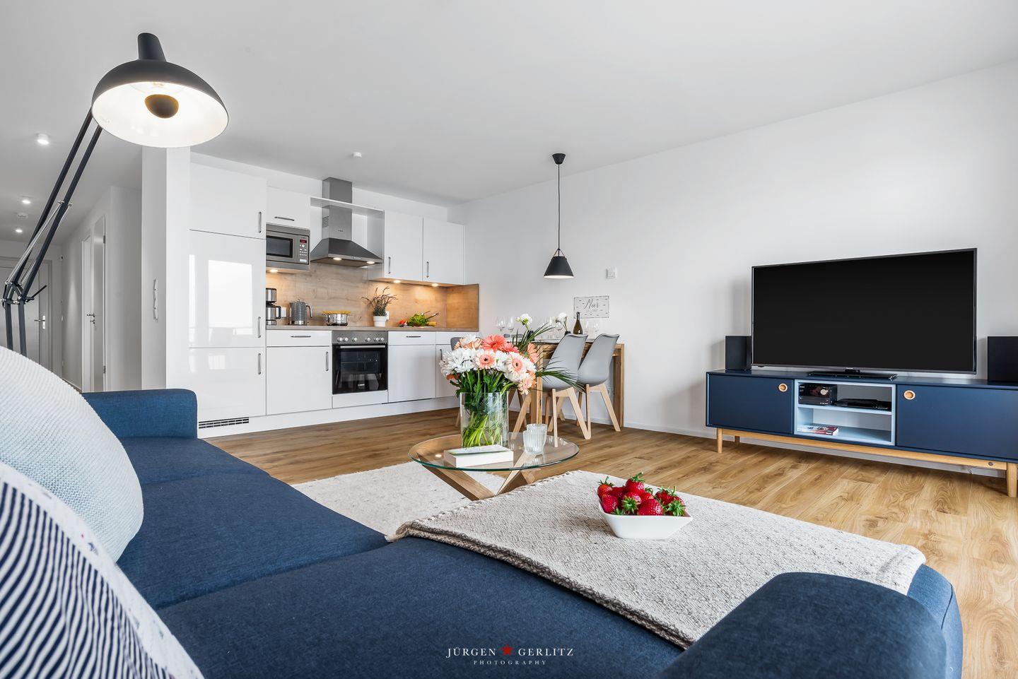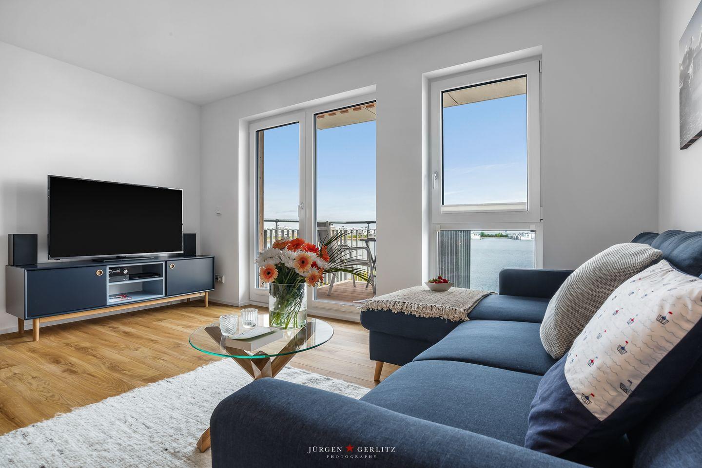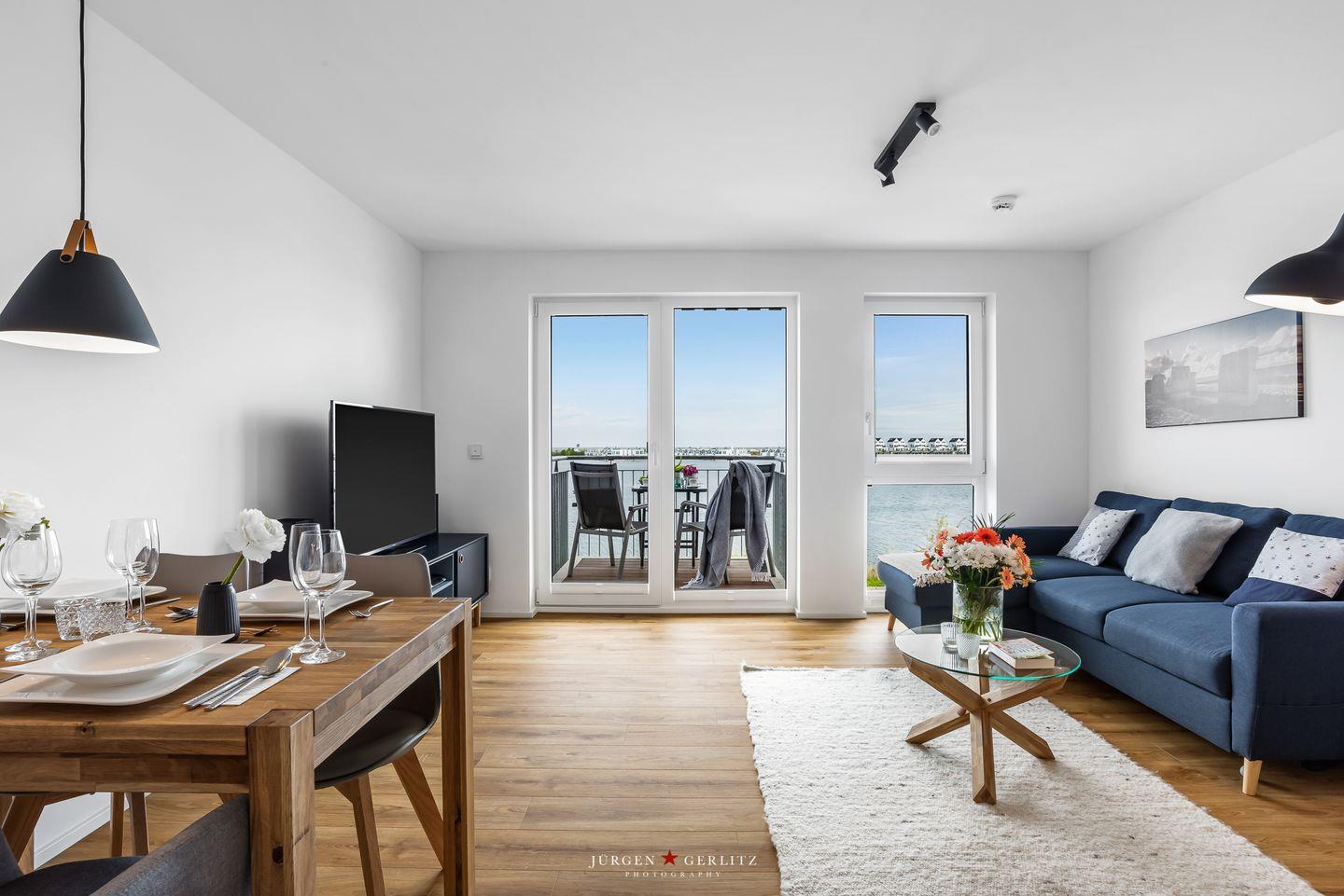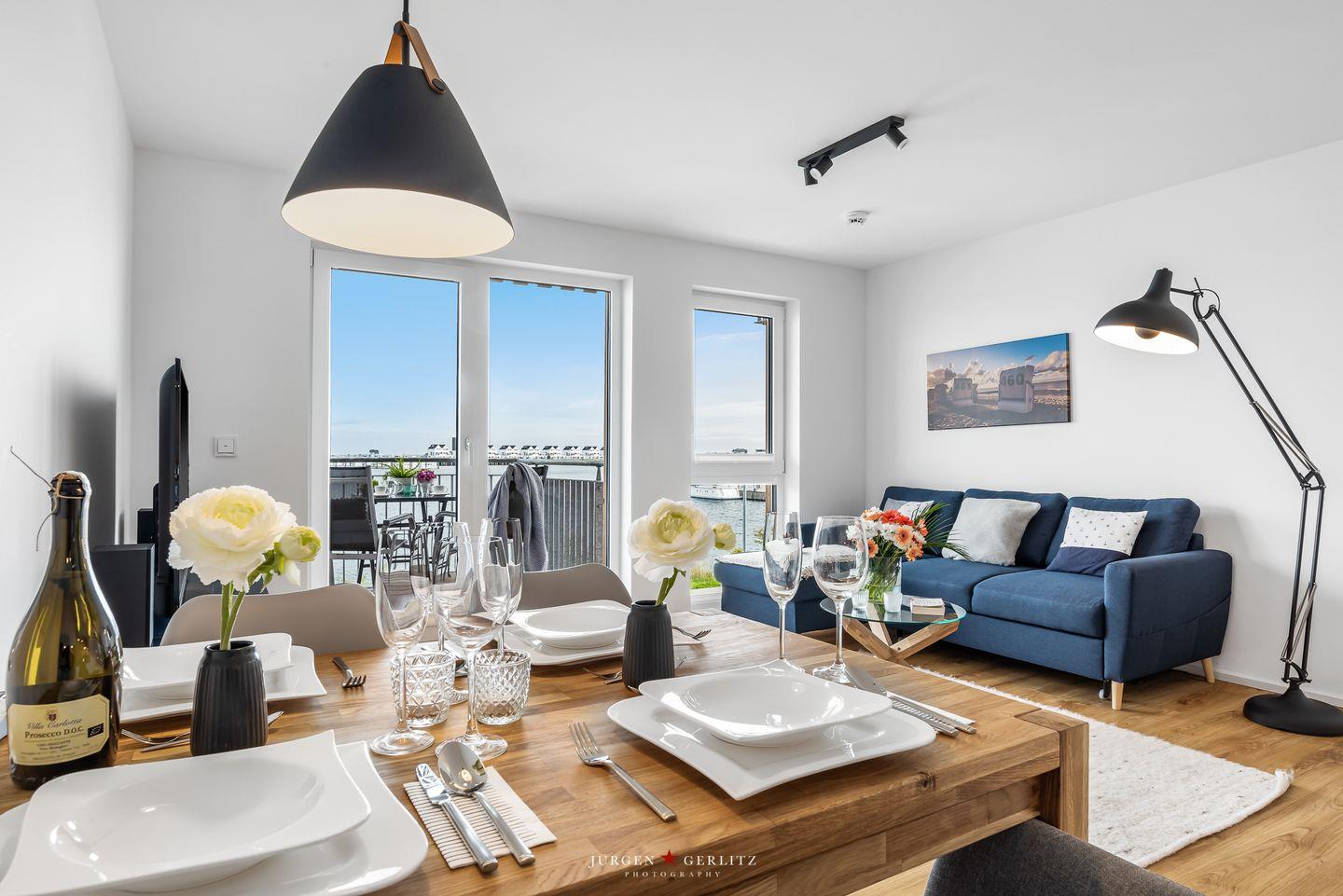 Willkommen im bezaubernden "Seeräubernest" – einer Oase der Entspannung und Eleganz im OstseeResort Olpenitz! Auf knapp 55m² bietet die Ferienwohnung einen atemberaubenden Blick auf den Hafen und die malerische Schlei. Der loftartig gestaltete Wohnbereich, lichtdurchflutet durch bodentiefe Fenster, verspricht eine einladende Atmosphäre. Hier erwartet Sie nicht nur eine gemütliche Couch, sondern auch eine moderne Küche und ein stilvoller Essbereich, die perfekt ineinander übergehen. Die komplett ausgestattete Küche lädt dazu ein, leckere Gerichte zu zaubern. In jedem Zimmer gibt es ein Fenster mit Fliegengitter, sodass Sie einen erholsamen Urlaub erleben können. Das Schlafzimmer ist ein wahrer Ruhepol, ausgestattet mit einem großzügigen Doppelbett (180x200cm), das himmlische Nächte verspricht. Für zusätzlichen Komfort bietet das bequeme Schlafsofa im Wohnzimmer eine weitere Schlafmöglichkeit. Verdunklungsmöglichkeiten in beiden Räumen sorgen für angenehme Nachtruhe. Im modernen Badezimmer erwartet Sie eine großzügige bodengleiche Dusche – eine wahre Wellnessoase. Das Highlight der Wohnung ist zweifellos der Balkon, der Ihnen einen malerischen Blick auf das Wasser bietet. Hier können Sie den Tag bei einem Glas Wein ausklingen lassen und die maritime Atmosphäre in vollen Zügen genießen.