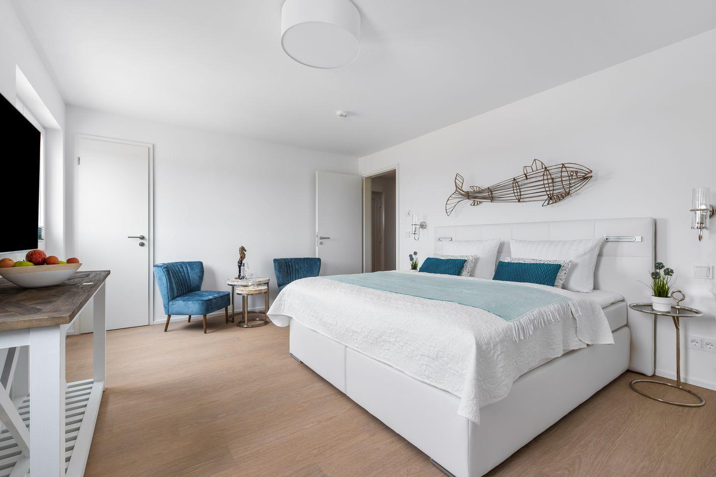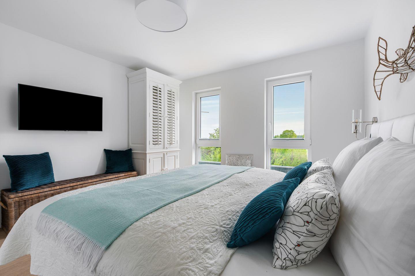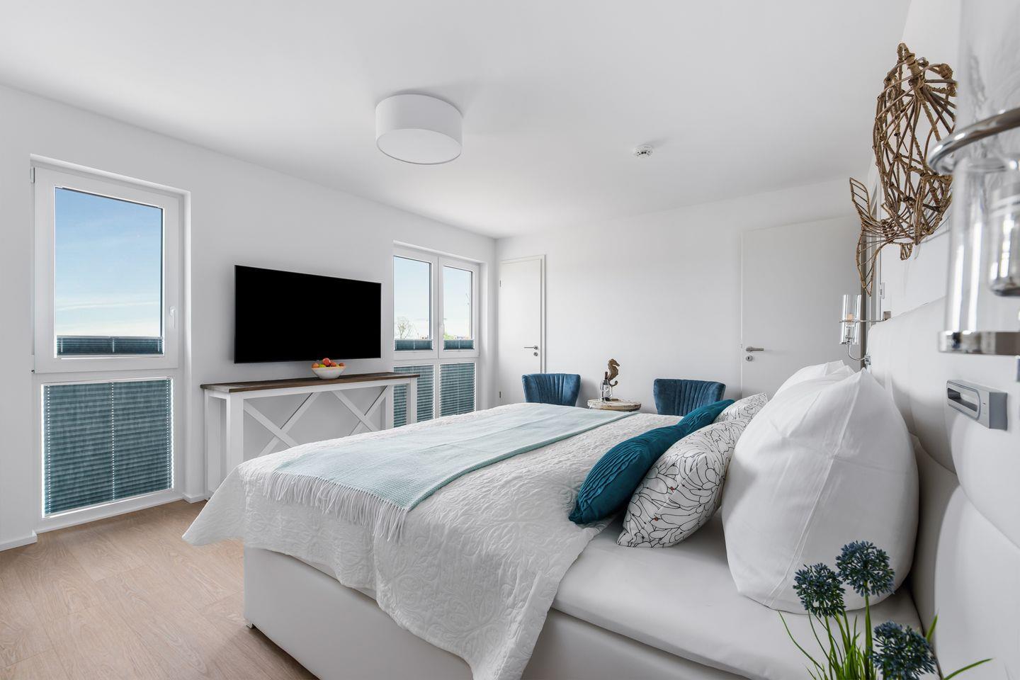Die Wohnung bietet Ihnen eine perfekt ausgestattete Küche, bodentiefe Fenster, einen Kamin & eine große Dachterrasse. Zwei Schlafzimmer, verfügen über Doppelboxspringbetten & das dritte über 2 Einzelbetten. In einem der beiden Badezimmer, erwarten Sie eine Dusche & eine Sauna & das zweite lädt zum Entspannen in der Badewanne ein. Bitte beachten Sie, dass der Aufbau des OstseeResort Olpenitz noch nicht abgeschlossen ist und es in der Nähe zu Bautätigkeiten kommen kann.