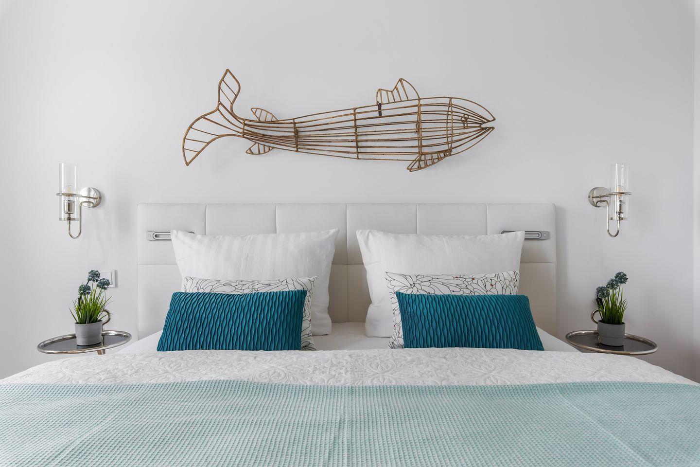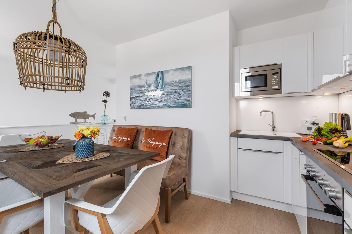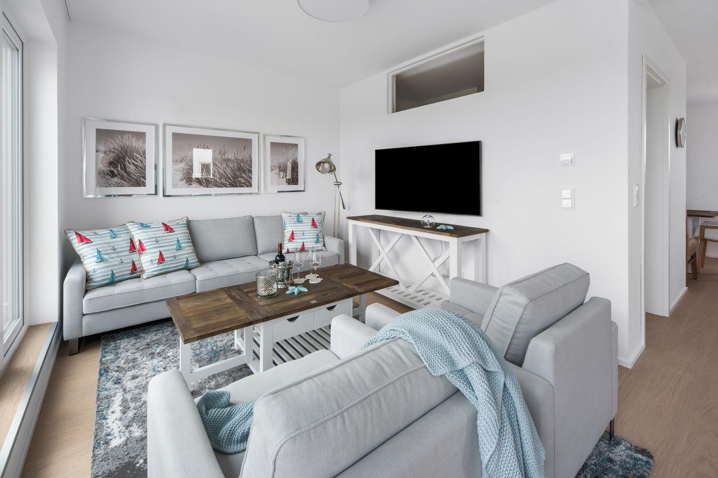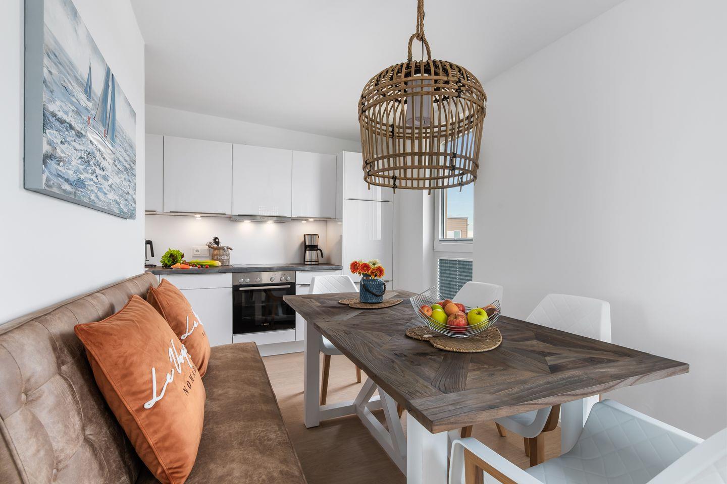 Die Wohnung bietet Ihnen eine perfekt ausgestattete Küche, bodentiefe Fenster, einen Kamin & eine große Dachterrasse. Zwei Schlafzimmer, verfügen über Doppelboxspringbetten & das dritte über 2 Einzelbetten. In einem der beiden Badezimmer, erwarten Sie eine Dusche & eine Sauna & das zweite lädt zum Entspannen in der Badewanne ein. Bitte beachten Sie, dass der Aufbau des OstseeResort Olpenitz noch nicht abgeschlossen ist und es in der Nähe zu Bautätigkeiten kommen kann.