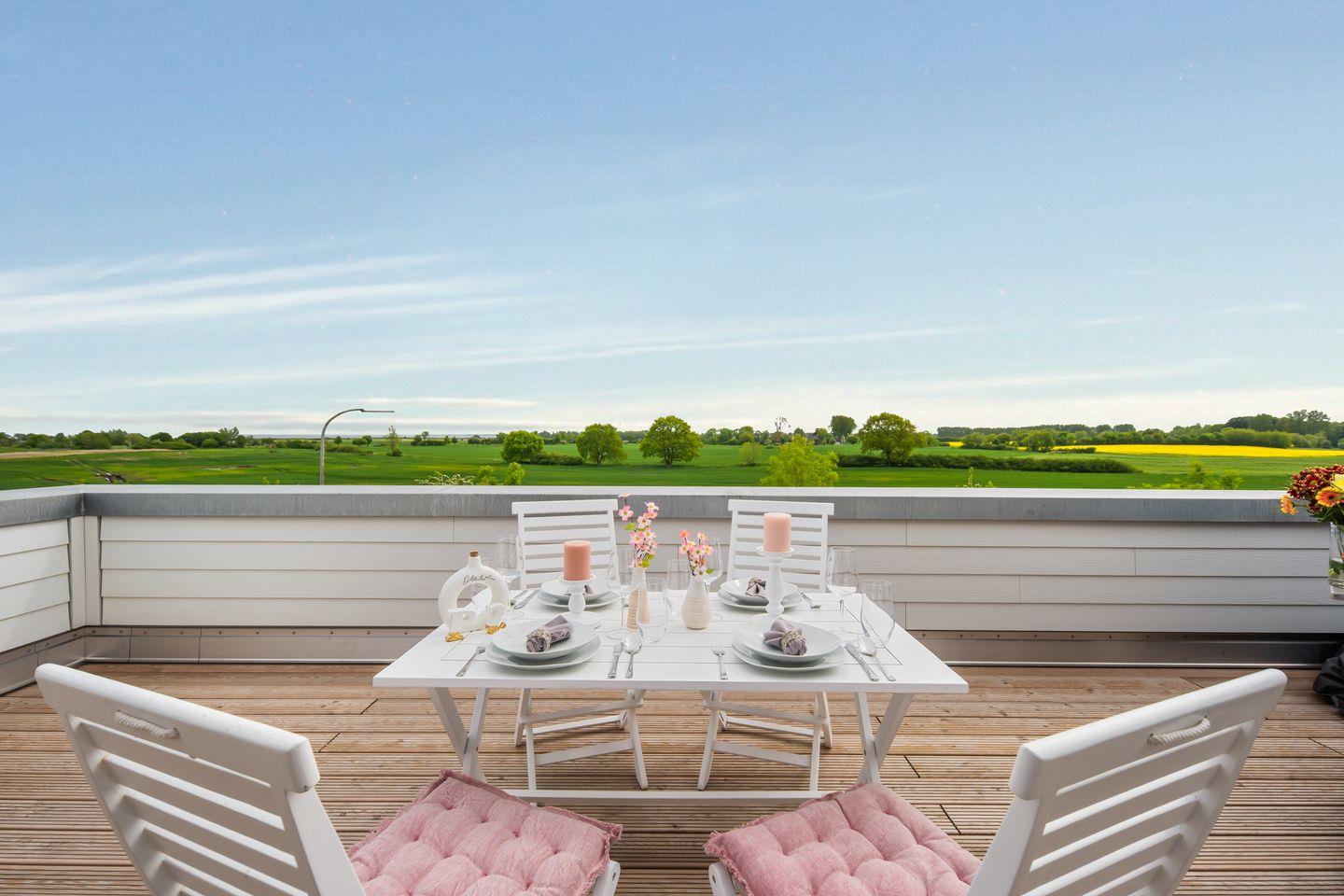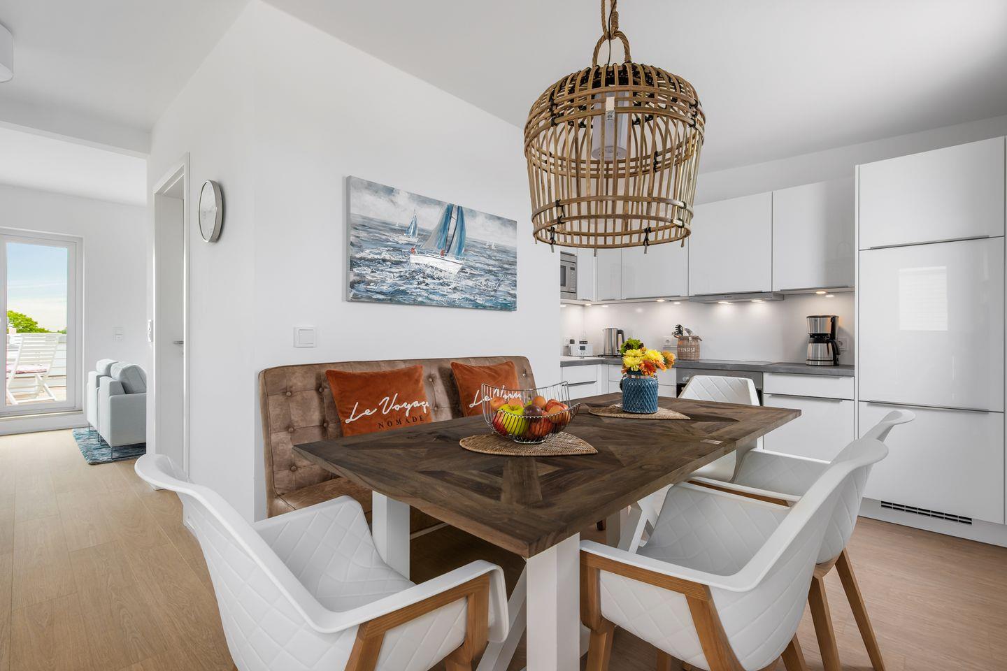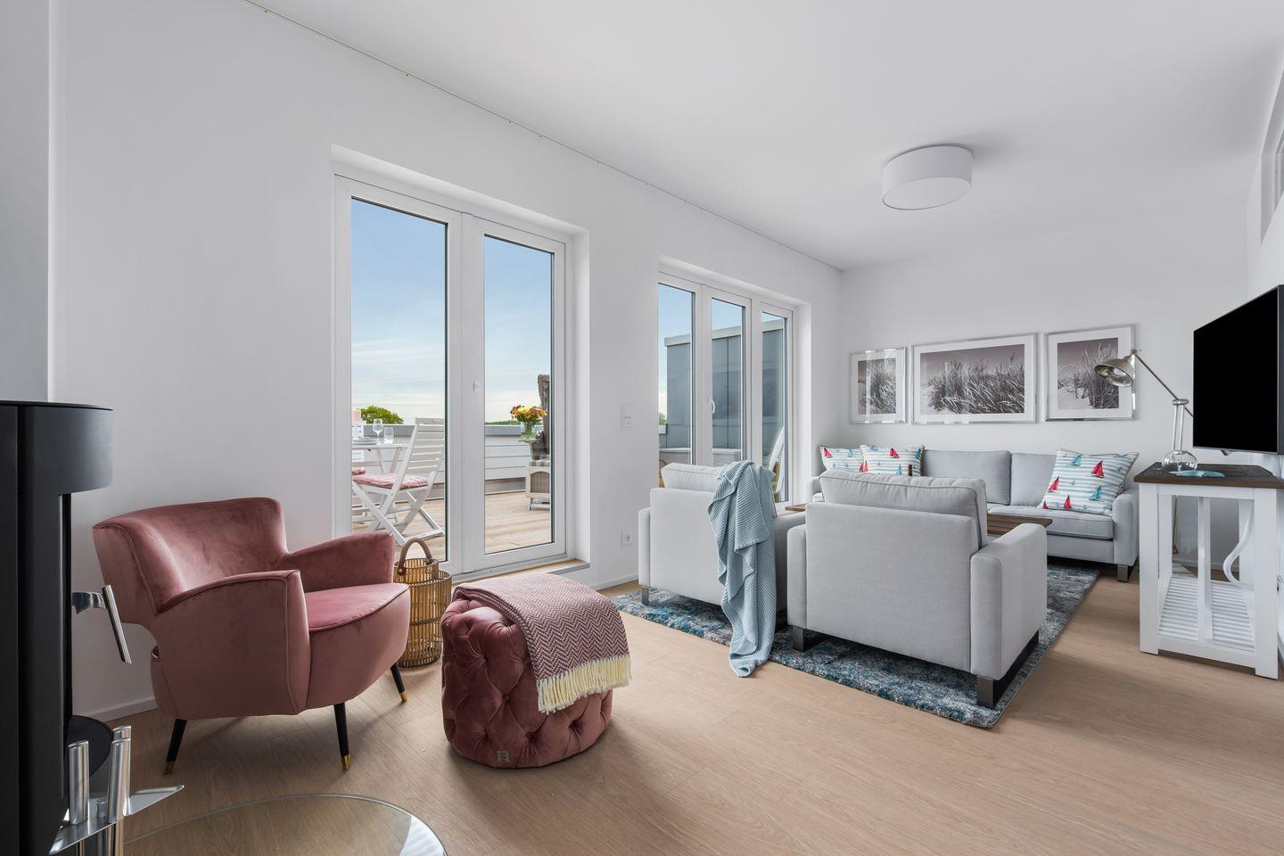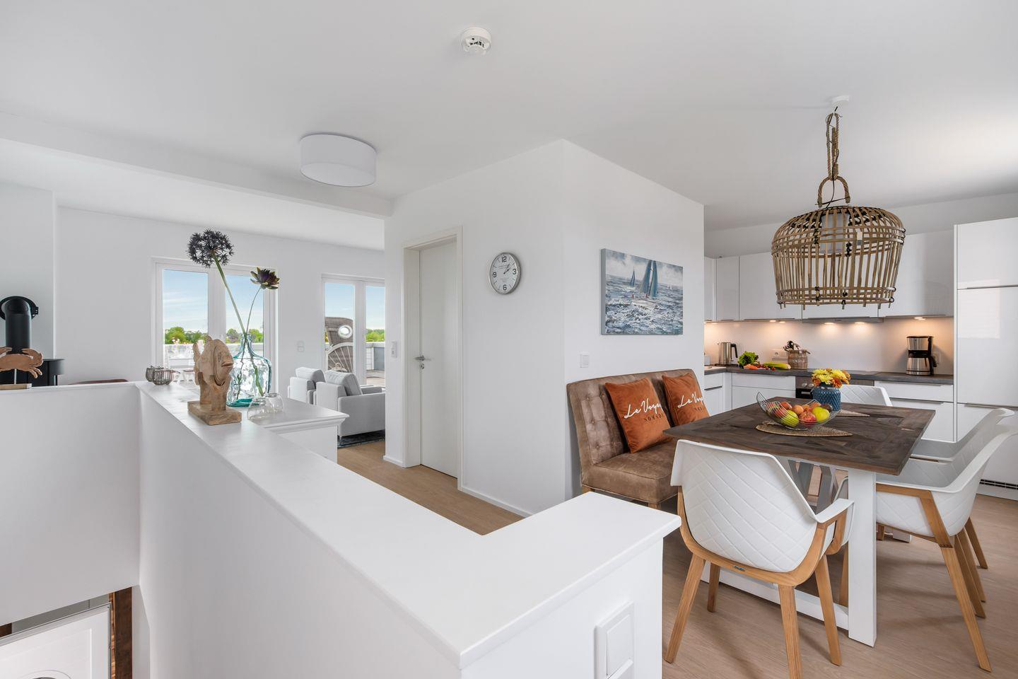 Die außergewöhnliche Ferienwohnung "Ausguck 34" bietet Ihnen auf 129m² über 2 Ebenen eine Urlaubsatmosphäre der Extraklasse. Das Mobiliar der Wohnung ist von der Marke "Rivera Maison", die für ein stilvolles Ambiente, Exklusivität und zeitlose Eleganz steht. Im großzügigen Wohnzimmer mit Kamin können Sie es sich gemütlich machen und das Prasseln des Feuers genießen. Die Küche ist modern und voll ausgestattet, sodass hier traumhafte Menüs zubereitet werden können. Es gibt 3 Schlafzimmer alle verfügen über einen TV. Davon sind 2 Zimmer mit jeweils einem großen Doppelbett (180x200cm) eingerichtet. Das andere Schlafzimmer hat 2 Einzelbetten (je 90x200cm). Die Wohnung verfügt über 2 Badezimmer. Das eine Bad liegt im 1.Obergeschoss und hat eine große Dusche und als Highlight eine Sauna. Hier kann nach langen Strandspaziergängen herrlich entspannt werden. Das andere Bad liegt im 2.Obergeschoss und ist mit einer Badewanne ausgestattet. Ihre Vierbeiner sind auf Anfrage & gegen Gebühr herzlich Willkommen. Das absolute Highlight der Wohnung ist die 28m² große Dachterrasse mit einem atemberaubenden "Ausguck" über ein unverbautes Naturschutzgebiet. Hier können Sie auf erstklassigen Terrassenmöbeln entspannen und im eigenen Strandkorb den Blick über die weitläufige Natur genießen. Ein PKW-Stellplatz ist vorhanden.