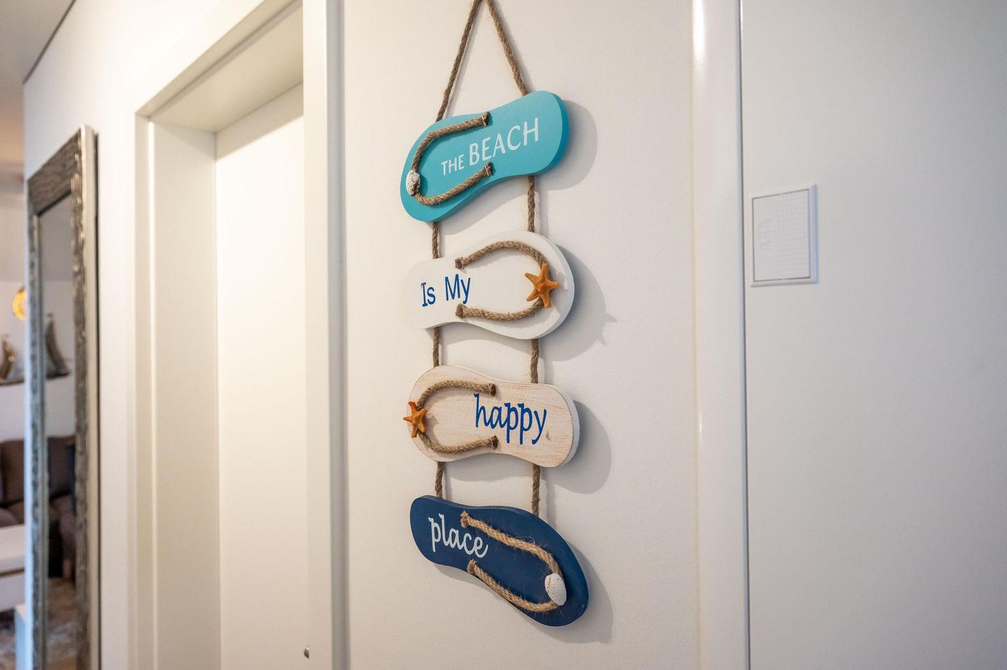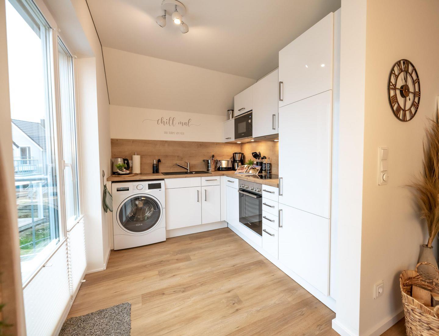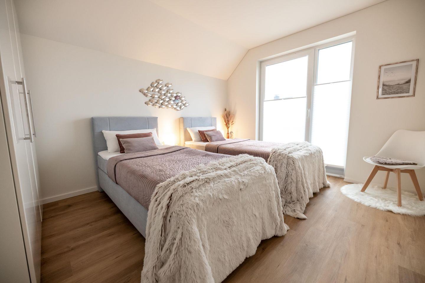 Eintreten und wohlfühlen. Diese Ferienwohnung bietet Platz für bis zu 5 Personen. "Chill mal" ist modern, stilvoll und sehr gemütlich, sie besticht durch zeitlose Eleganz und wurde mit viel Liebe zum Detail eingerichtet. Neben zwei Schlafzimmern, einem hellen und freundlichen Bad mit Infrarot-Sauna, einem sehr ansprechenden Wohn- und Essbereich, sowie einer vollausgestatteten Küche, bietet diese im Obergeschoss gelegene Wohnung einen voll möblierten Balkon. Das Wohnzimmer ist mit einer großzügigen Wohnlandschaft und einem großen Multimedia-Smart-TV eingerichtet - hyggelige Abende sind garantiert. Kostenfreies WLAN und Magenta-TV stehen Ihnen selbstverständlich zur Verfügung. In beiden Schlafzimmern finden Sie hochwertige Boxspringbetten. In einem Schlafzimmer ein Doppelbett (180x200cm) in dem anderen zwei Einzelbetten (90x200cm) die Sie jederzeit zu einem Doppelbett zusammenschieben können. Auch verfügen beide Schlafzimmer über Multimedia-Smart-TVs und ausreichenden Stauraum. Verdunklungsmöglichkeiten sowie Fliegengitter ermöglichen Ihnen eine angenehme Nachtruhe. Eine weitere Schlafmöglichkeit bietet das Schlafsofa im Wohnbereich. Die Küche ist von der Nespresso-Maschine über den Wasch-Trockner bis zur Spülmaschine mit allen erdenklichen modernen Annehmlichkeiten ausgestattet. Kochen und backen machen hier wirklich Spaß. Das lichtdurchflutete Bad bietet Ihnen eine große ebenerdige Dusche, einen Kosmetikspiegel und einen Handtuchheizkörper. Für Wellnessfeeling sorgt die eingebaute Infrarot-Sauna mit Soundanlage. Auch der Balkon lädt, mit einem Tisch und 6 Hochlehner-Stühlen, zum Chillen ein und der hochwertige Weber-Elektrogrill lässt auch Grillfreunde auf Ihre Kosten kommen. Jeder Raum verfügt über Plissees sowie Fliegengitter. Da die Wohnung Tier frei ist, fühlen sich auch Allergiker wohl. Auf dem Balkon können Sie den Tag in Ruhe ausklingen lassen und die schönen Sonnenuntergänge genießen. Für unsere kleinen Gäste stehen ein Kinderreisebett und ein Hochstuhl bereit. Direkt vor der Unterkunft parken Sie kostenfrei, eine E-Ladesäule steht Ihnen hier ebenso zur Verfügung.