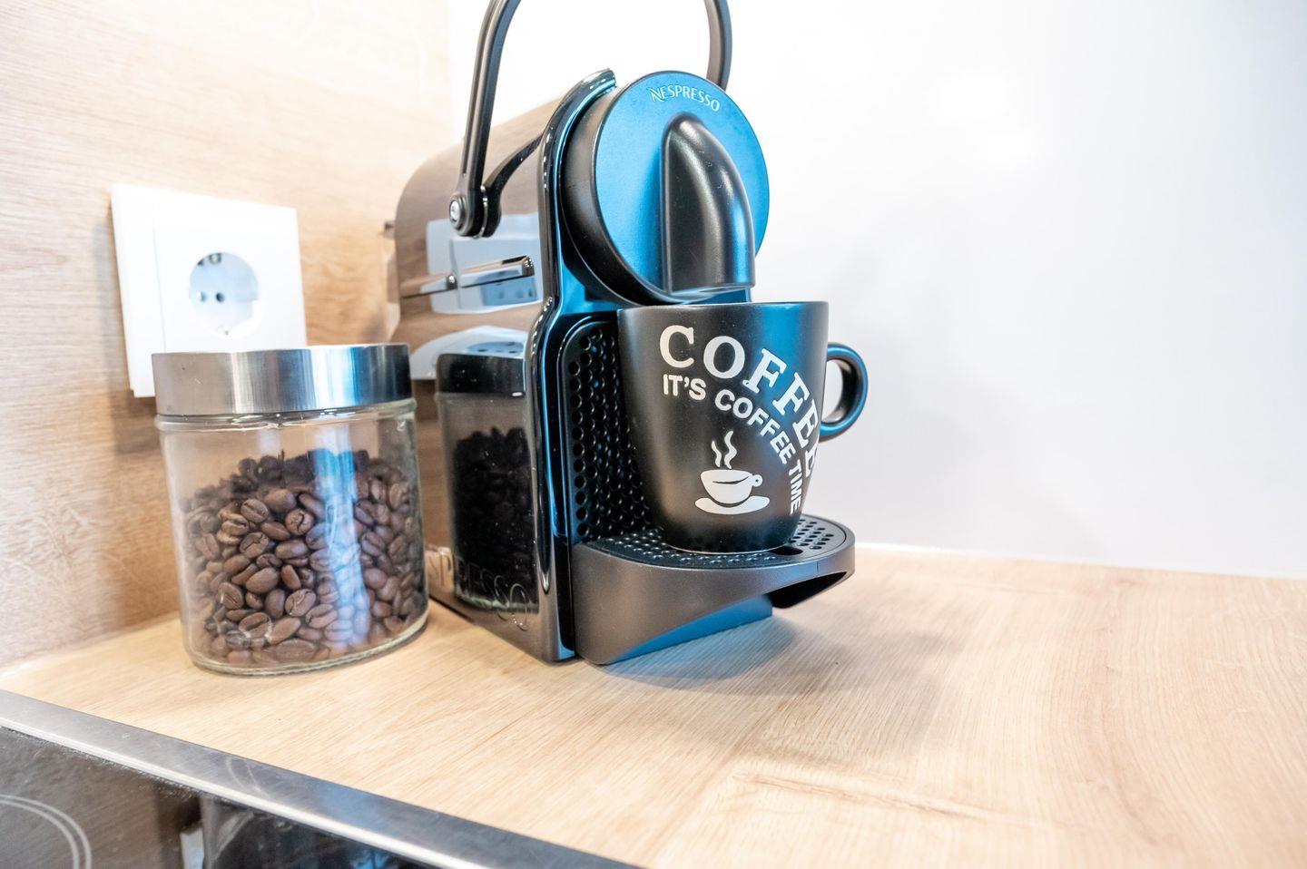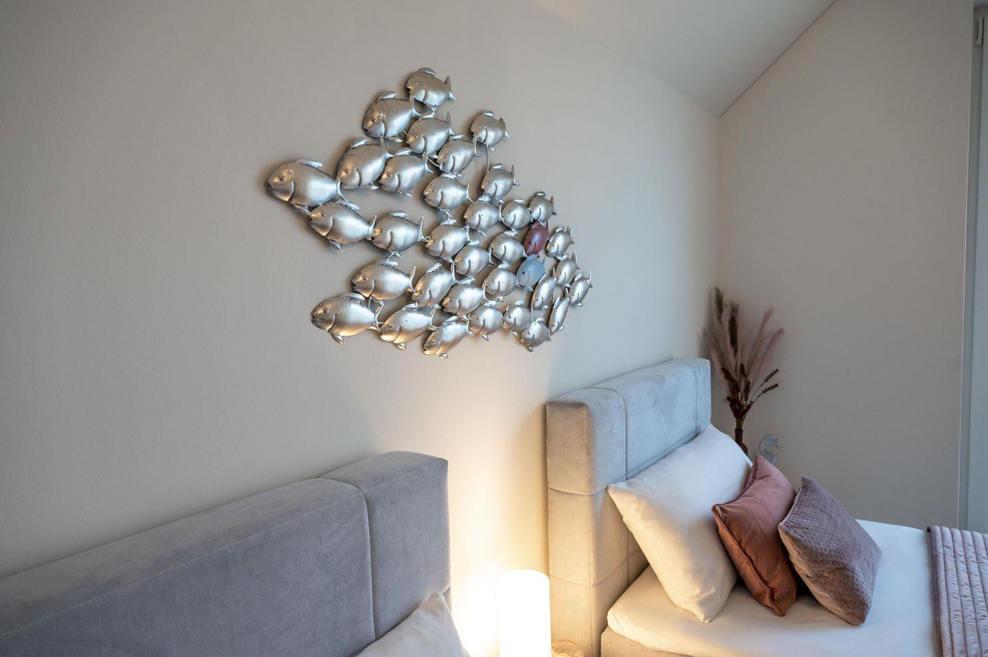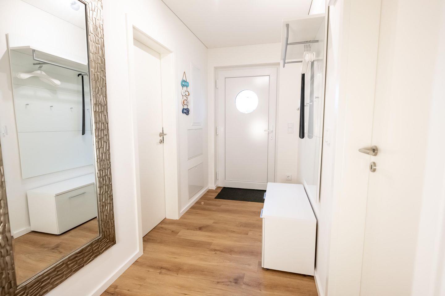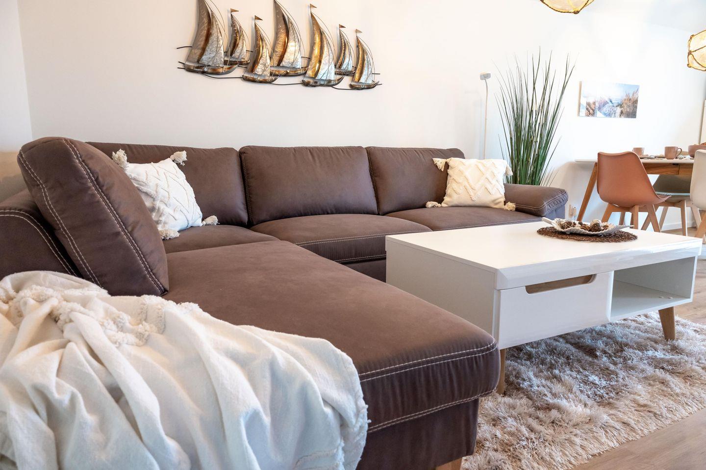 Eintreten und wohlfühlen. Diese Ferienwohnung bietet Platz für bis zu 5 Personen. "Chill mal" ist modern, stilvoll und sehr gemütlich, sie besticht durch zeitlose Eleganz und wurde mit viel Liebe zum Detail eingerichtet. Neben zwei Schlafzimmern, einem hellen und freundlichen Bad mit Infrarot-Sauna, einem sehr ansprechenden Wohn- und Essbereich, sowie einer vollausgestatteten Küche, bietet diese im Obergeschoss gelegene Wohnung einen voll möblierten Balkon. Das Wohnzimmer ist mit einer großzügigen Wohnlandschaft und einem großen Multimedia-Smart-TV eingerichtet - hyggelige Abende sind garantiert. Kostenfreies WLAN und Magenta-TV stehen Ihnen selbstverständlich zur Verfügung. In beiden Schlafzimmern finden Sie hochwertige Boxspringbetten. In einem Schlafzimmer ein Doppelbett (180x200cm) in dem anderen zwei Einzelbetten (90x200cm) die Sie jederzeit zu einem Doppelbett zusammenschieben können. Auch verfügen beide Schlafzimmer über Multimedia-Smart-TVs und ausreichenden Stauraum. Verdunklungsmöglichkeiten sowie Fliegengitter ermöglichen Ihnen eine angenehme Nachtruhe. Eine weitere Schlafmöglichkeit bietet das Schlafsofa im Wohnbereich. Die Küche ist von der Nespresso-Maschine über den Wasch-Trockner bis zur Spülmaschine mit allen erdenklichen modernen Annehmlichkeiten ausgestattet. Kochen und backen machen hier wirklich Spaß. Das lichtdurchflutete Bad bietet Ihnen eine große ebenerdige Dusche, einen Kosmetikspiegel und einen Handtuchheizkörper. Für Wellnessfeeling sorgt die eingebaute Infrarot-Sauna mit Soundanlage. Auch der Balkon lädt, mit einem Tisch und 6 Hochlehner-Stühlen, zum Chillen ein und der hochwertige Weber-Elektrogrill lässt auch Grillfreunde auf Ihre Kosten kommen. Jeder Raum verfügt über Plissees sowie Fliegengitter. Da die Wohnung Tier frei ist, fühlen sich auch Allergiker wohl. Auf dem Balkon können Sie den Tag in Ruhe ausklingen lassen und die schönen Sonnenuntergänge genießen. Für unsere kleinen Gäste stehen ein Kinderreisebett und ein Hochstuhl bereit. Direkt vor der Unterkunft parken Sie kostenfrei, eine E-Ladesäule steht Ihnen hier ebenso zur Verfügung.