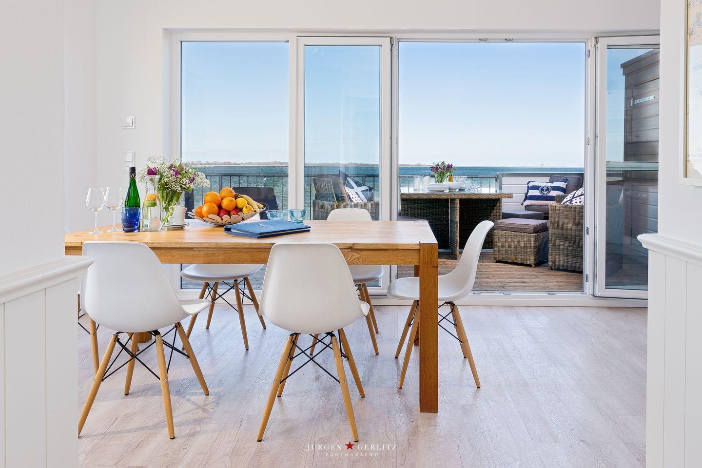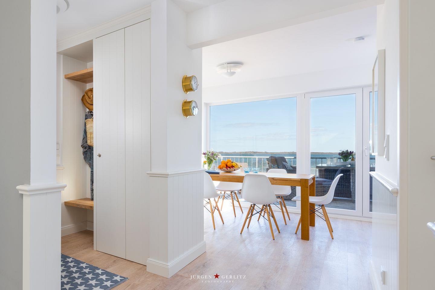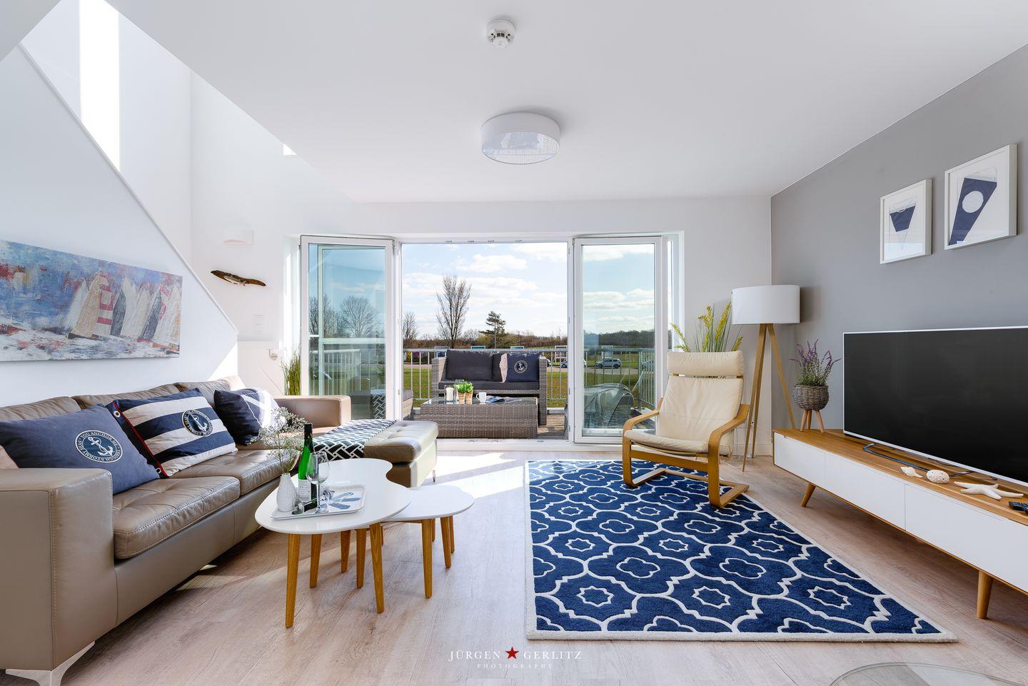 Herzlich willkommen in dieser exklusiven Ferienwohnung im OstseeResort Olpenitz, nur 20 Meter vom Wasser entfernt, direkt am Ufer des Ostseearms Schlei. Die Wohnung erstreckt sich über zwei Etagen (1. und 2. Obergeschoss) und wurde mit ausgewählten Luxusmöbeln im skandinavischen Stil ausgestattet. Bereits beim Betreten werden Sie von einer einladenden Atmosphäre empfangen. Die Panoramafenster im Essbereich, im Schlafzimmer und im großzügigen Badezimmer eröffnen Ihnen einen atemberaubenden Panoramablick auf vorbeiziehende Segelboote und die malerische Schleimündung. Die großartige Terrasse bietet den perfekten Ort, um sich zu entspannen und den Blick auf das Wasser zu genießen. Auch aus den Panoramafenstern des Wohnzimmers erleben Sie die Schönheit der Umgebung. Ein Kamin verleiht dem Wohnbereich nicht nur Gemütlichkeit, sondern sorgt auch für eine warme und einladende Atmosphäre. Zusätzlich steht Ihnen ein zweiter Balkon zur Verfügung, der einen Blick ins Grüne ermöglicht. Im Dachgeschoss erwartet Sie das absolute Highlight dieser Wohnung: Ein Wellnessbad, das mit Whirlpool, Regendusche und einer privaten finnischen Glas-Sauna mit Blick auf das Wasser beeindruckt. Hier können Sie sich nach einem ereignisreichen Tag perfekt entspannen und den Alltag hinter sich lassen. Auf derselben Etage befinden sich auch die beiden Schlafzimmer, die mit komfortablen Doppelbetten, großzügigem Stauraum und traumhaften Ausblicken aufs Wasser oder ins Grüne punkten.