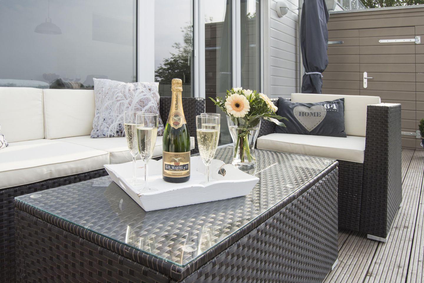 Genießen Sie einen unvergesslichen 180-Grad Panorama-Blick vom Yachthafen Maasholm über die ein- und ausfahrenden Schiffe auf der Schlei bis zur Lotseninsel bei Schleimünde! Traumhafte Ferienwohnung mit großer Terrasse und Sauna in Ostseenähe für 6 Personen. Das "Bootshaus" ist eine hochwertig ausgestattete Ferienwohnung im skandinavischen Stil. Es befindet sich im Erdgeschoss einer Doppelhaushälfte im ruhigsten Teils des OstseeResorts am Ende einer Sackgasse. Beim Betreten der Wohnung gelangen Sie rechter Hand in den gemütlichen offenen Wohn- und Küchen-Bereich, von dem Sie einen fantastischen Ausblick auf die Schlei und die zahlreichen Wasservögel genießen können. Ebenfalls befindet sich dort der Zugang auf die große Terrasse, wo in den Sommermonaten eine Lounge-Möbel-Gruppe für Sie bereitsteht. Die Küche lässt keine Wünsche offen: neben dem Herd mit Ceranfeld und Dunstabzug, Backofen, Mikrowelle, Geschirrspülmaschine sowie einem Kühlschrank mit Gefrierfach, stehen Ihnen hier auch eine Kaffee- und Nespresso-Maschine, Wasserkocher und Toaster sowie eine umfangreiche Auswahl an Koch- und Essgeschirr für Groß & Klein zur Verfügung. Am großen Esstisch haben 6 Personen Platz. Der Wohnbereich bietet Ihnen ein gemütliches Sofa. Unser Lieblingsplatz ist ein gemütlicher Ohrensessel mit Leselampe, die beliebig positioniert werden kann. Ein Flachbild-TV ist in den Ausblick integriert und lässt sich flexibel in Richtung Sofa oder Ess-Bereich ausrichten. Vom Eingangsflur abgehend finden Sie darüber hinaus zwei gemütliche Schlafzimmer, die jeweils über ein komfortables Doppelbett, großzügigen Schrankraum für Ihre Garderobe, Verdunkelungs-Plissees und Insektenschutz-Türen verfügen, durch die Sie eine weitere Terrasse betreten können. Eines der beiden Schlafzimmer verfügt über einen zweiten Flachbild-TV am Fußende des Betts. In der Nähe aller drei Betten können Sie Ihr Smartphone oder unseren kabellosen Bluetooth Lautsprecher an einer USB-fähigen Steckdose aufladen. Darüber hinaus steht Ihnen auch eine Musikanlage mit CDs zur Verfügung. Direkt gegenüber von den Schlafzimmern befindet sich ein großzügig geschnittenes Badezimmer mit einer Whirlpool-Duschwanne und Infrarot-Sauna. Die Wohnung ist selbstverständlich vollflächig mit Fußbodenheizung ausgestattet und ist damit zu allen Jahreszeiten das perfekte Urlaubsdomizil. Bei Bedarf steht Ihnen hier auch eine Waschmaschine zur Verfügung. Im Abstellraum haben wir einen Wäscheständer, Bügelbrett und Bügeleisen, einen Kinderstuhl, ein Kinder-Reisebett und weiteres nützliches Zubehör bereitgestellt. Auf der Terrasse befindet sich noch ein weiterer Abstellraum für Möbel und Sitzauflagen.