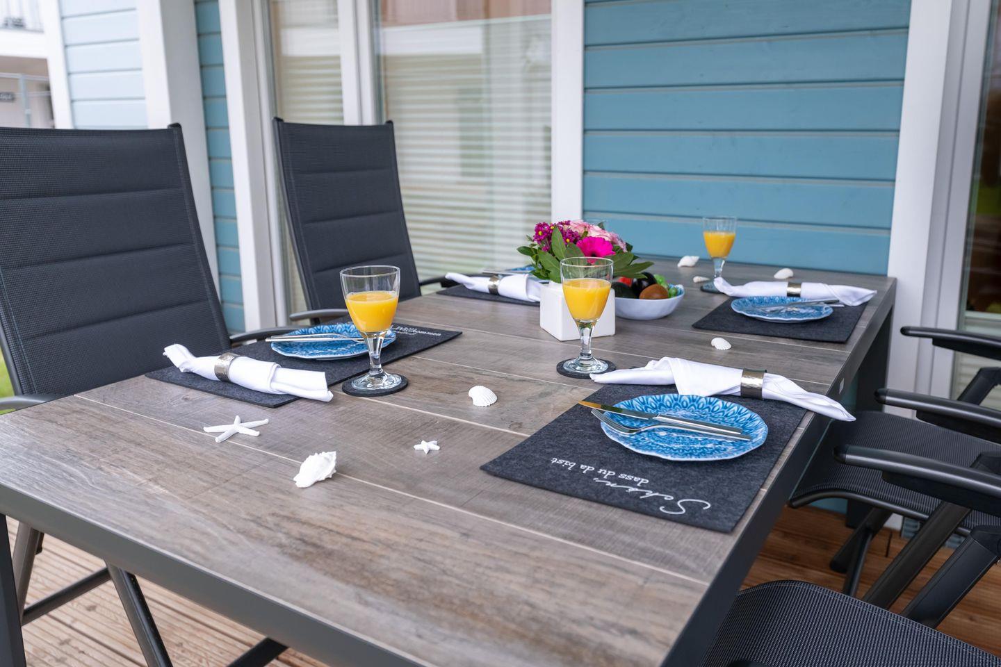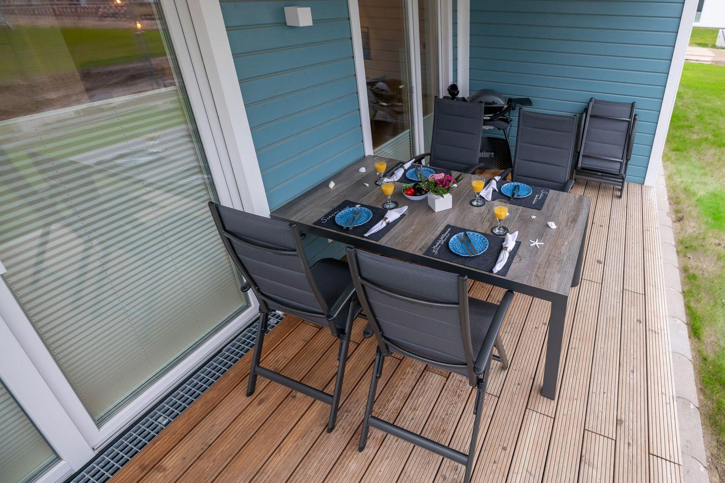 Auf der angrenzenden Terrasse kannst Du den Tag in Ruhe ausklingen lassen und die schönen Sonnenuntergänge genießen. Auch die Grünfläche vor der Terrasse kann genutzt werden.