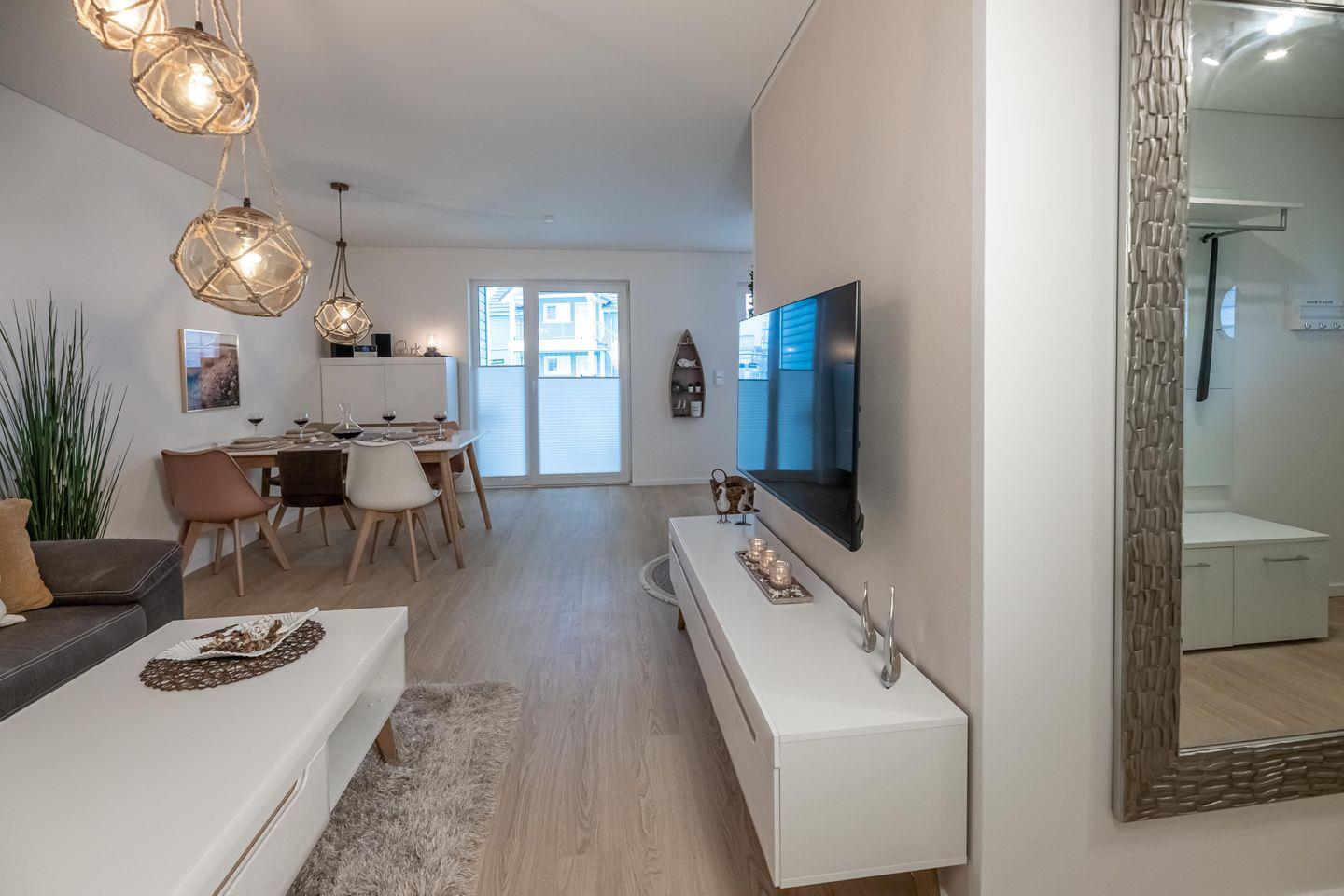 Das Wohnzimmer ist mit einer großzügigen Wohnlandschaft und einem großen Multimedia-Smart-TV ausgestattet. Gemütliche Abende sind garantiert.