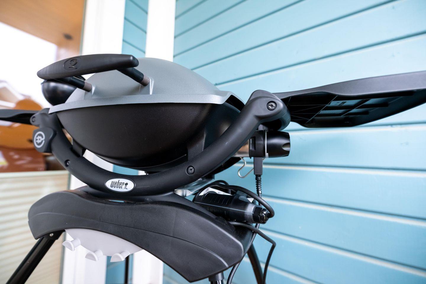 Auch die Terrasse lädt Dich mit einem Tisch und 6 Hochlehner-Stühlen zum Entspannen ein und der hochwertige Weber-Elektrogrill lässt auch Grillfreunde auf Deine Kosten kommen.