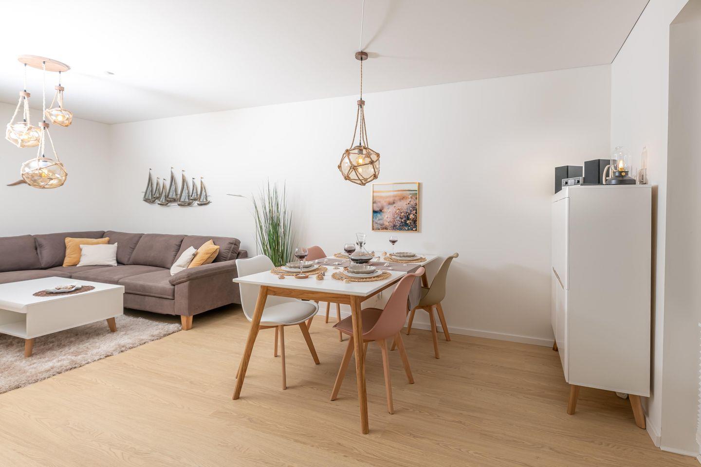 Neben zwei Schlafzimmern, einem hellen und freundlichen Bad mit Infrarot-Sauna, einem sehr ansprechenden Wohn- und Essbereich sowie einer voll ausgestatteten Küche bietet Dir diese im Erdgeschoss gelegene Wohnung eine voll möblierte Terrasse.