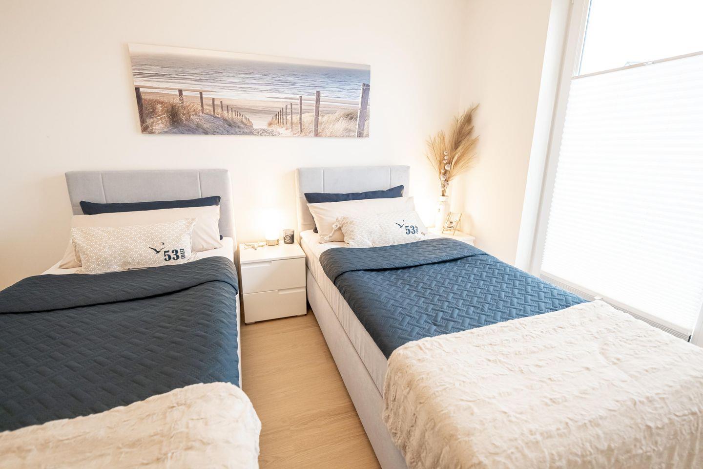 In beiden Schlafzimmern findest Du hochwertige Boxspringbetten. In einem Schlafzimmer ein Doppelbett (180x200cm), in dem anderen zwei Einzelbetten (90x200cm), die Du jederzeit zu einem Doppelbett zusammenschieben kannst.