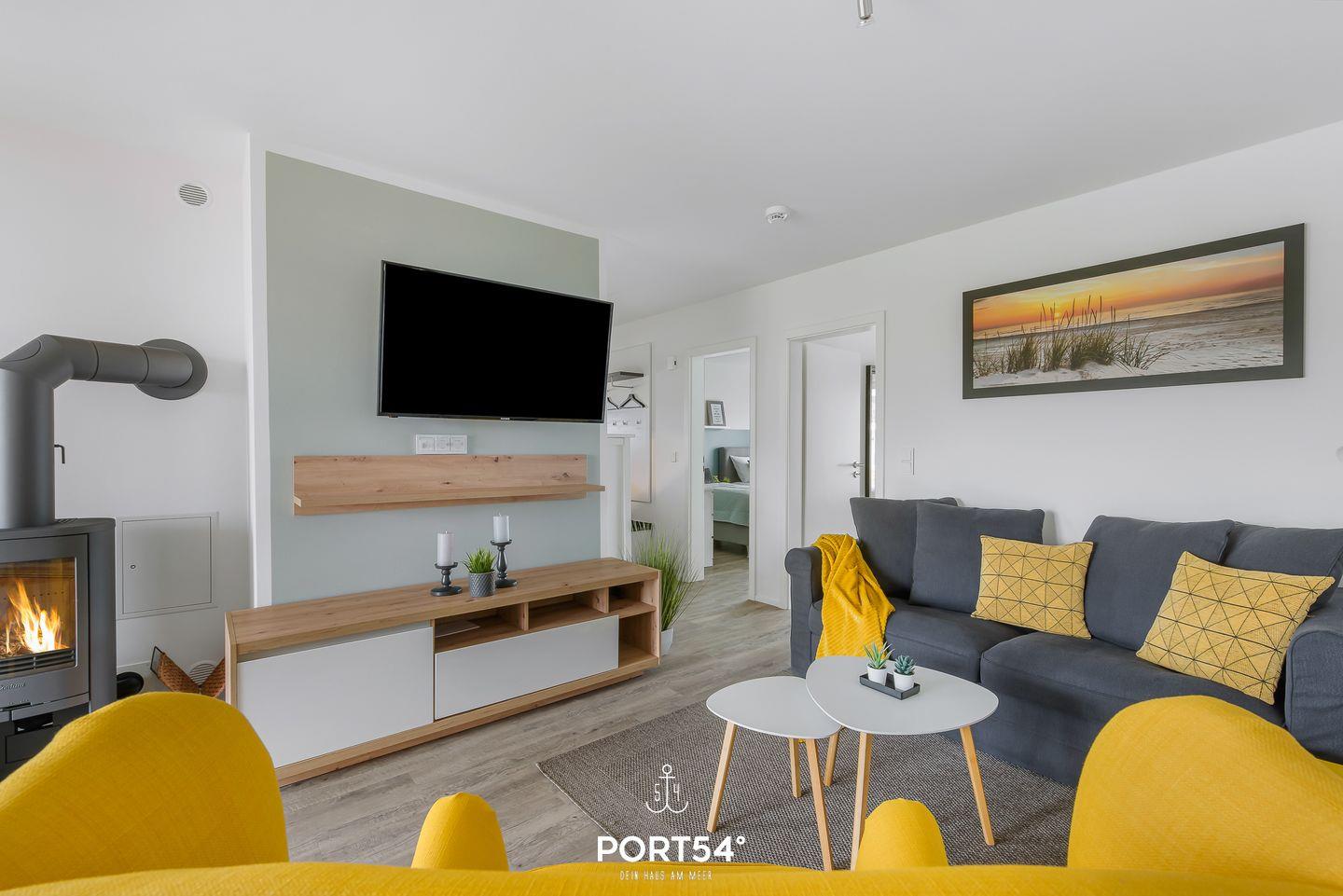 Das helle und einladende Wohnzimmer ist der perfekte Ort, um nach einem aufregenden Tag am Strand zu entspannen. Hier finden Sie auch einen Kaminofen, der an kühleren Tagen für wohlige Wärme sorgt und eine gemütliche Atmosphäre schafft. In der kalten Jahreszeit können Sie sich zusätzlich in der Infrarot-Sauna und in der Whirlwanne erholen.