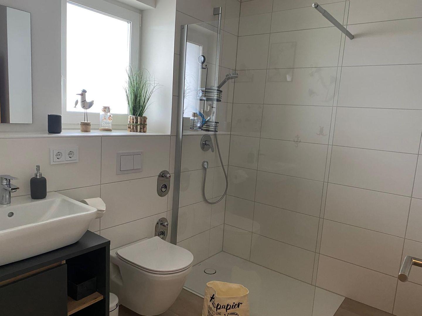 Das Badezimmer lädt nicht nur zur täglichen Erfrischung ein, sondern bietet mit Dusche, Fenster, Spiegel, Haartrockner und Handtuchheizkörper allen Komfort. Ein besonderes Highlight ist die integrierte Infrarotsauna – ideal zum Entspannen nach einem aktiven Urlaubstag.