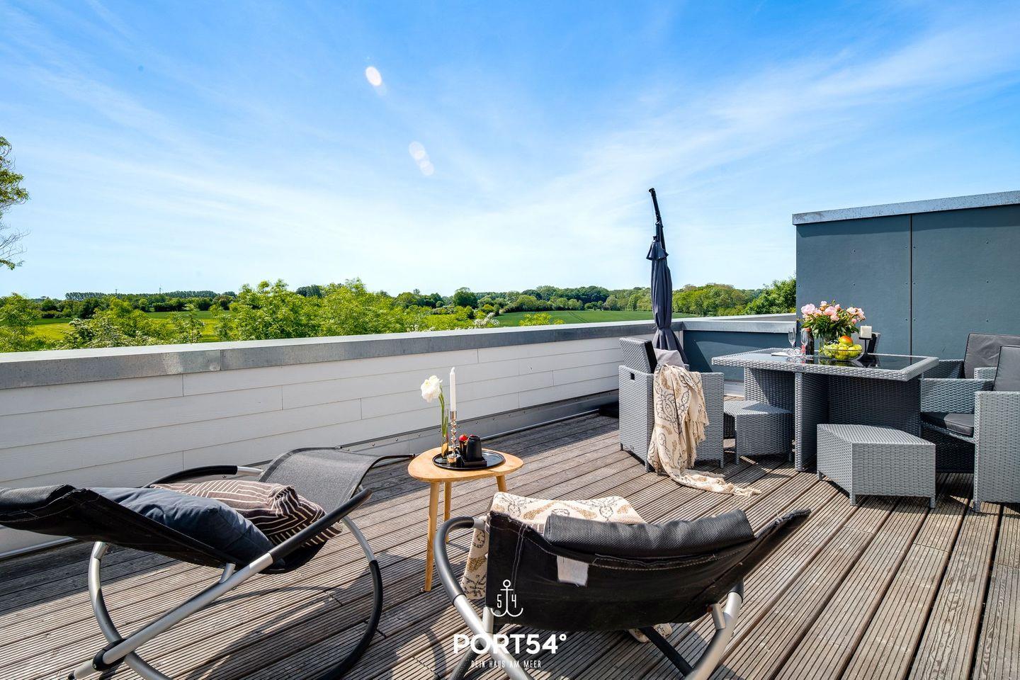 Willkommen in der Ferienwohnung "chill lounge 44"! Im offen gestalteten Wohnzimmer mit Kamin und Zugang zur großzügigen Dachterrasse können Sie es sich auf der großen Couch gemütlich machen. Die Küche ist modern und voll ausgestattet und bietet im angrenzenden Essbereich Platz für bis zu 6 Personen. Das eine Schlafzimmer verfügt über ein Doppelbett (180x200cm), das andere über zwei Einzelbetten (90x200cm). In einem zusätzlichen Raum befindet sich neben gemütlichen Sitzmöglichkeiten mit Schlafmöglichkeit (150x235cm) zudem ein TV. In einem der beiden Badezimmer erwartet Sie neben einer ebenerdigen Dusche auch eine Infrarot-Sauna. Das andere Badezimmer lädt zum Entspannen in der Badewanne ein. Das absolute Highlight der Wohnung ist die 28m² große, möblierte Dachterrasse mit einem atemberaubenden Blick über ein unverbautes Naturschutzgebiet. Hier können Sie entspannen, auf dem Elektro-Grill grillen und den Blick über die weitläufige Natur genießen. Ein eigener PKW-Stellplatz steht Ihnen direkt vor der Unterkunft zur Verfügung.