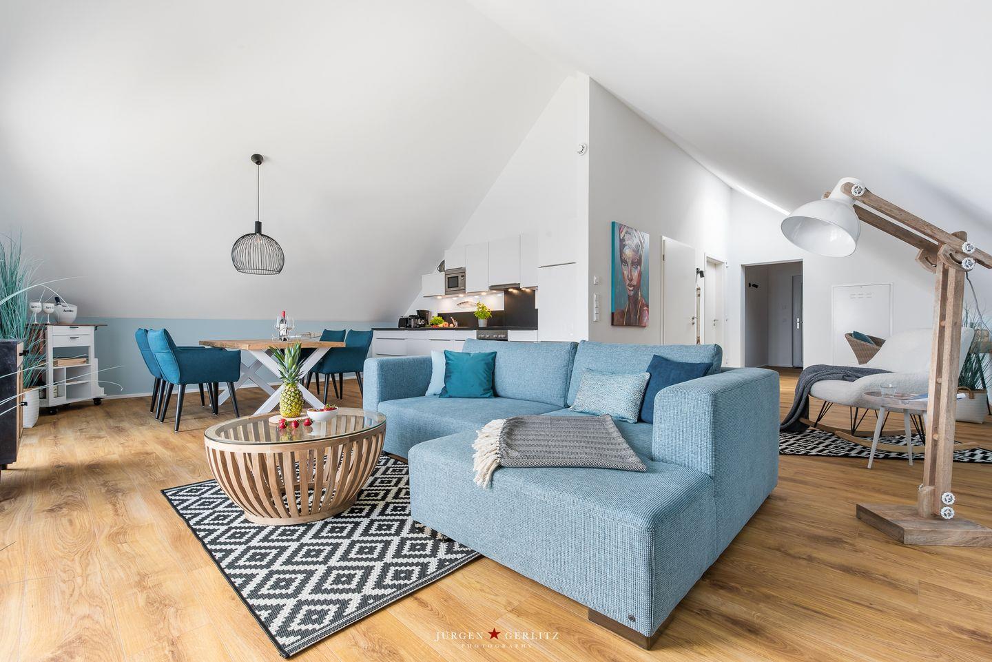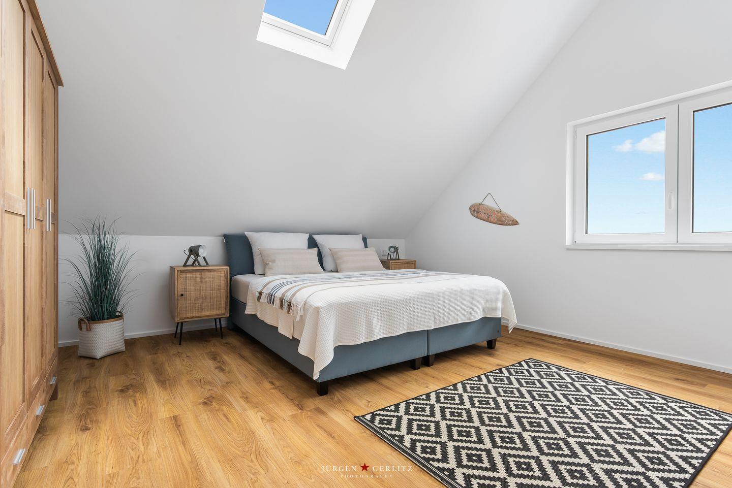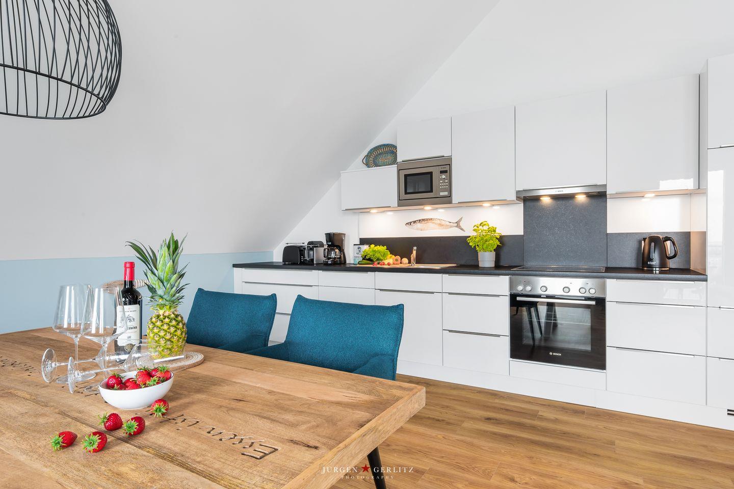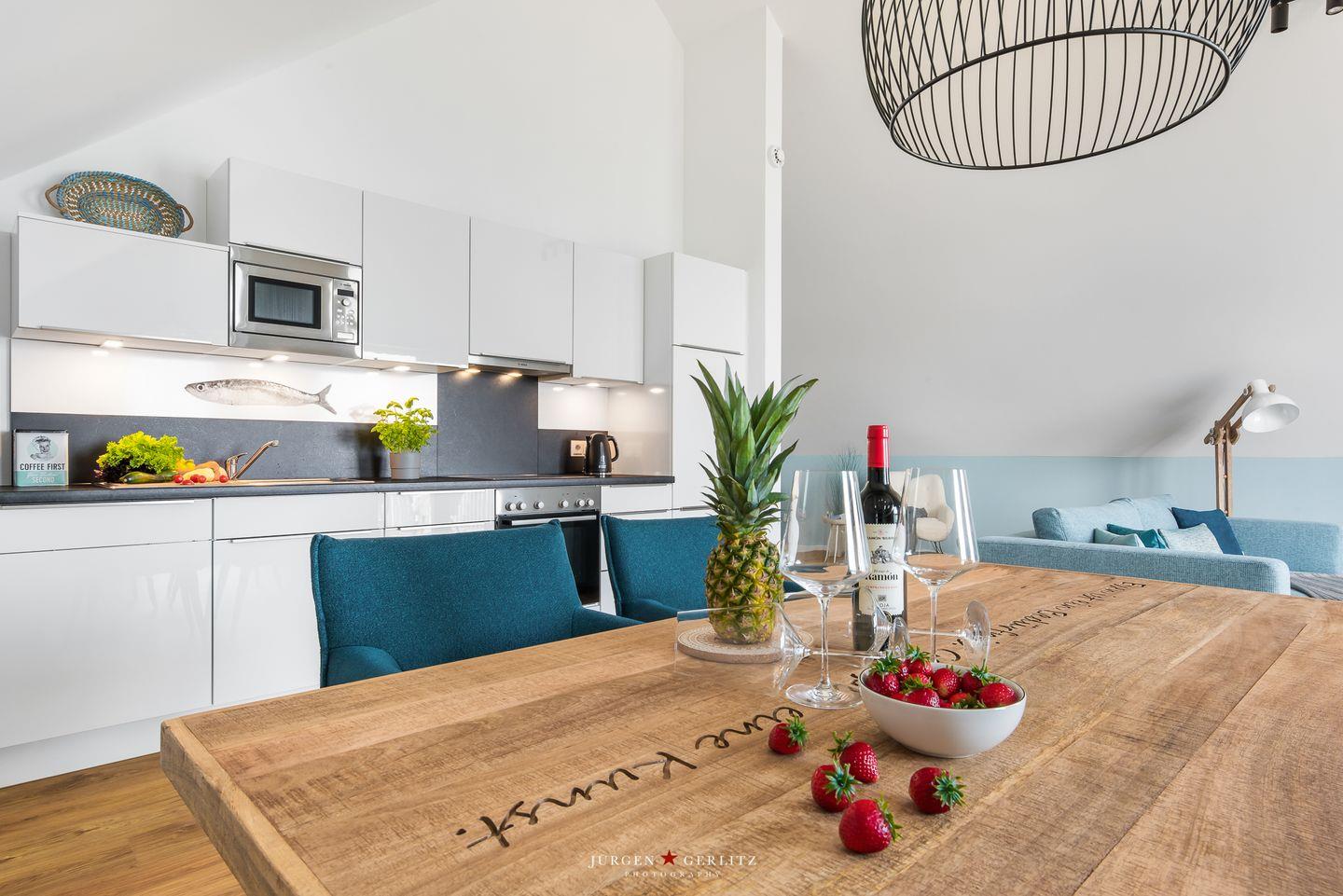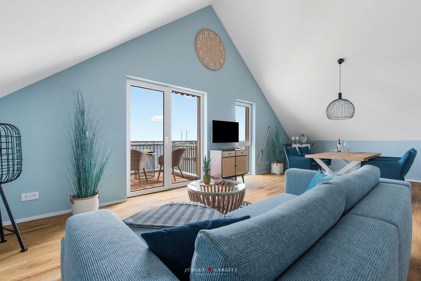 Genießen Sie, in der exklusiven Ferienwohnung "Aloha Lounge" einen unvergesslichen 180-Grad Panorama-Blick über das gesamte Hafenbecken von Olpenitz, den Yachthafen von Maasholm, die ein- und ausfahrenden Schiffe auf der Schlei und die Lotseninsel bis nach Dänemark! Die Aloha Lounge befindet sich im obersten Stock des Klabautermann II direkt an der Hafenpromenade von Olpenitz. Bereits beim Betreten der Wohnung können Sie durch die breite, bodentiefe Fensterfront das Wasser sehen. Der lichtdurchflutete, loftartige Wohn-, Küchen- und Essbereich mit ausgeprägt hohen Decken bietet Ihnen dabei die unterschiedlichsten Perspektiven. So ergeben sich nach den jeweiligen Lichtverhältnissen verschiedene Sitzmöglichkeiten, was die 80m² noch einmal größer erscheinen lässt. Der Balkon schwebt scheinbar über der Hafenpromenade. Whale Watching inklusive! Mit etwas Glück können Sie Schweinswale im Hafenbecken beobachten. Das Wohnzimmer bietet Ihnen ein gemütliches Sofa in Wasserfarben, das gleichzeitig als weitere Schlafgelegenheit (140×200cm) dient. Hier werden Sie mit einem Blick aufs Wasser wach. Ein Flatscreen-TV ist in den Ausblick integriert und lässt sich flexibel in Richtung Sofa oder Essbereich ausrichten. Am großen Esstisch mit bequemen Armlehnstühlen haben 4 Personen Platz. Auch die offene Küche lässt keine Wünsche offen. Neben einem Herd mit Ceranfeld und Dunstabzug, Backofen, Mikrowelle sowie einem Kühlschrank mit Gefrierfach, stehen Ihnen hier auch eine Kaffee- und Nespressomaschine, Wasserkocher und Toaster sowie eine umfangreiche Auswahl an Koch- und Essgeschirr zur Verfügung. Im Schlafzimmer finden Sie ein komfortables Tom Tailor Boxspringbett (180×200cm), großzügigen Stauraum für Ihre Garderobe sowie einen weiteren Flatscreen-TV. Durch das elektrisch zu öffnende Dachflächenfenster können Sie bei Bedarf die kühle Nachtluft hereinströmen lassen. An den Fenstern sind Verdunkelungsplissees angebracht. Die Verdunkelung des Dachflächenfensters ist ebenfalls möglich. Das geräumige Bad ist mit einer ebenerdigen Dusche, Waschbecken, WC und einer Waschmaschine mit integriertem Trockner ausgestattet. Sollten Sie Ihr Home-Office nach Olpenitz verlegen wollen, steht Ihnen im Wohnflur ein Schreibtisch zur Verfügung. Unsere Ferienwohnung ist vollflächig mit Fußbodenheizung ausgestattet. Insgesamt 3 elektrische Dachflächenfenster sorgen für eine gute Belüftung und Temperierung aller Räume. Die "Aloha Lounge" ist daher zu allen Jahreszeiten das perfekte Urlaubsdomizil. "Aloha" ist nicht nur ein Wort, sondern ein Lebensgefühl. Die Hawaiianer verwenden es in vielfältigster Weise als Gruß, als Zeichen der Harmonie und der (Gast-) Freundschaft. In diesem Sinne – Aloha und herzlich willkommen! Das Highlight der Wohnung ist der schöne Balkon, auf dem Sie gemeinsam die farbenreichen Sonnenaufgänge und Sonnenuntergänge hier im Norden genießen können. Vor dem Haus steht Ihnen ein eigener, kostenfreier Parkplatz zur Verfügung. Die Wohnung ist bequem mit dem Fahrstuhl zu erreichen. In dem Gemeinschaftsschuppen können Sie Ihre Fahrräder unterstellen.