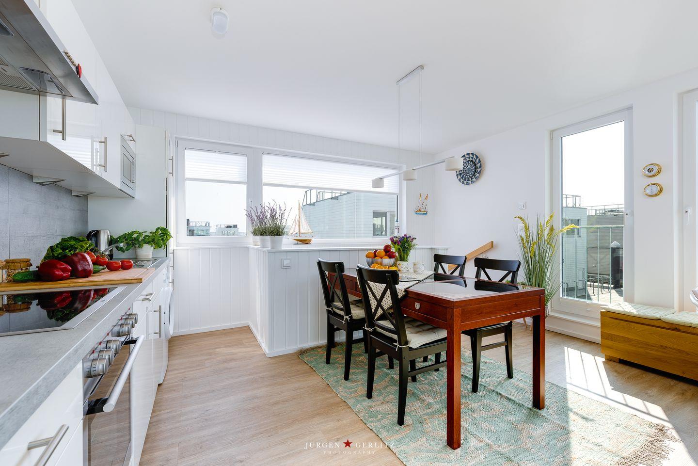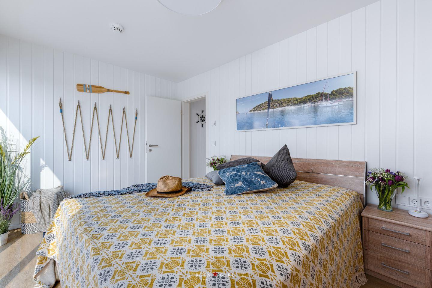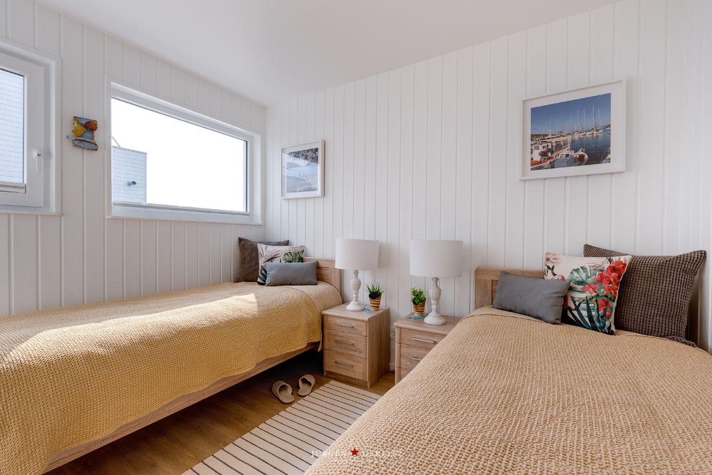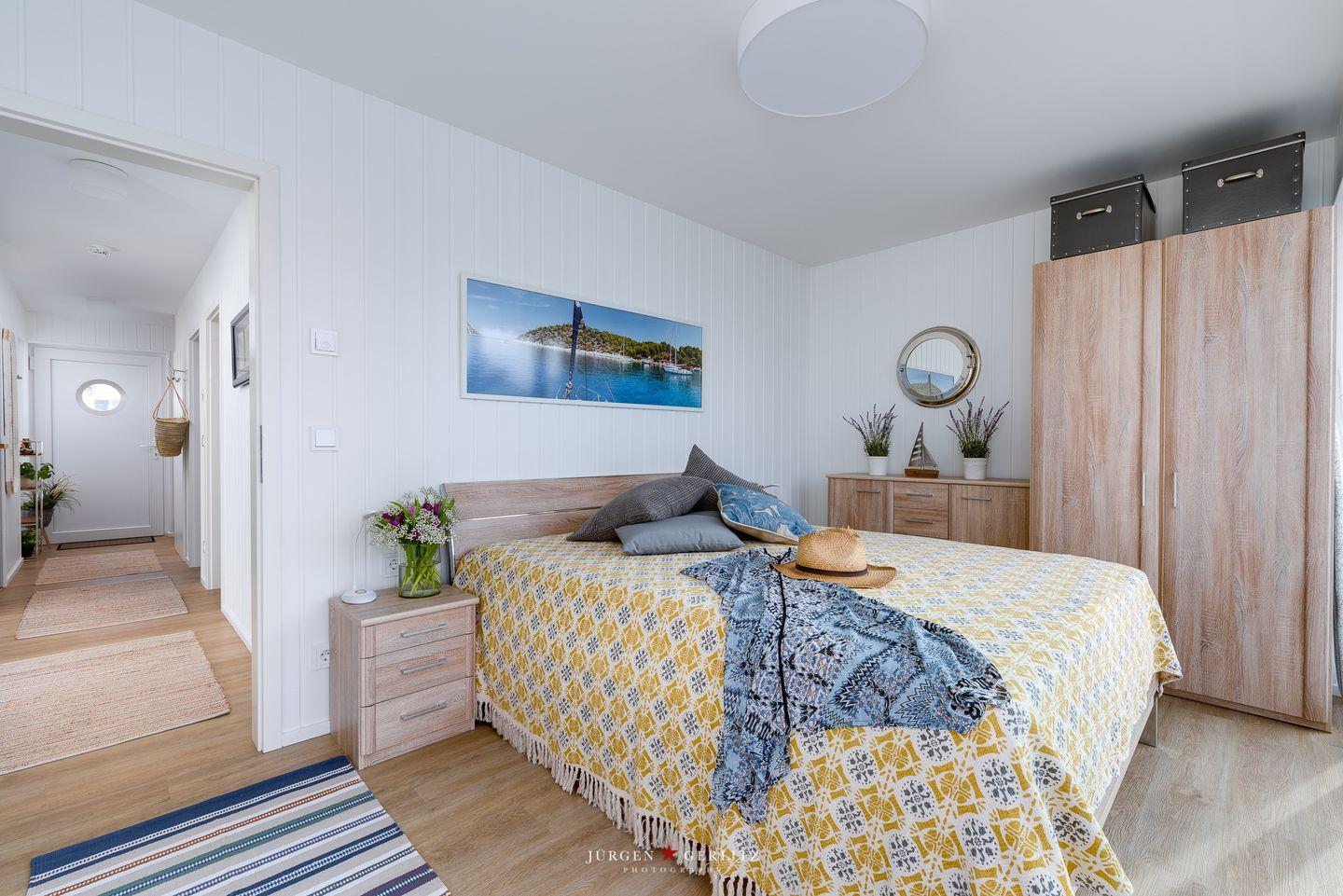 Willkommen an Bord des schwimmenden Traumhauses "Tokai" – Ihre exklusive Oase auf dem Wasser im OstseeResort Olpenitz! Über den Steg erreichen Sie das Ferienhaus, das sich auf 97m² auf 3 Zimmer aufteilt und Ihnen einen Urlaub der Extraklasse bietet. Im Erdgeschoss befinden sich die beiden Schlafzimmer - eines bietet ein gemütliches Doppelbett und in dem anderen Zimmer warten 2 Einzelbetten auf Sie. Lassen Sie sich am Morgen von einem atemberaubenden Blick auf das glitzernde Wasser wecken. Ein Badezimmer mit Dusche und eine finnische Sauna sind ebenfalls im Erdgeschoss vorhanden. Nach einem langen Spaziergang können Sie hier herrlich entspannen und den Alltag hinter sich lassen. Das wahre Highlight erwartet Sie im Obergeschoss – ein lichtdurchfluteter Wohn- und Essbereich mit einer modernen Küchenzeile. Dank bodentiefer Panoramafenster ist dieser Raum hell und einladend. Treten Sie hinaus auf den großzügigen Balkon mit bequemen Gartenmöbeln und lassen Sie sich von der frischen Brise zu einem entspannten Frühstück im Freien einladen. Die Dachterrasse, erreichbar vom Balkon aus, schenkt Ihnen einen traumhaften 360° Blick auf die Schleimündung, die Ostsee und den Hafen des Resorts.