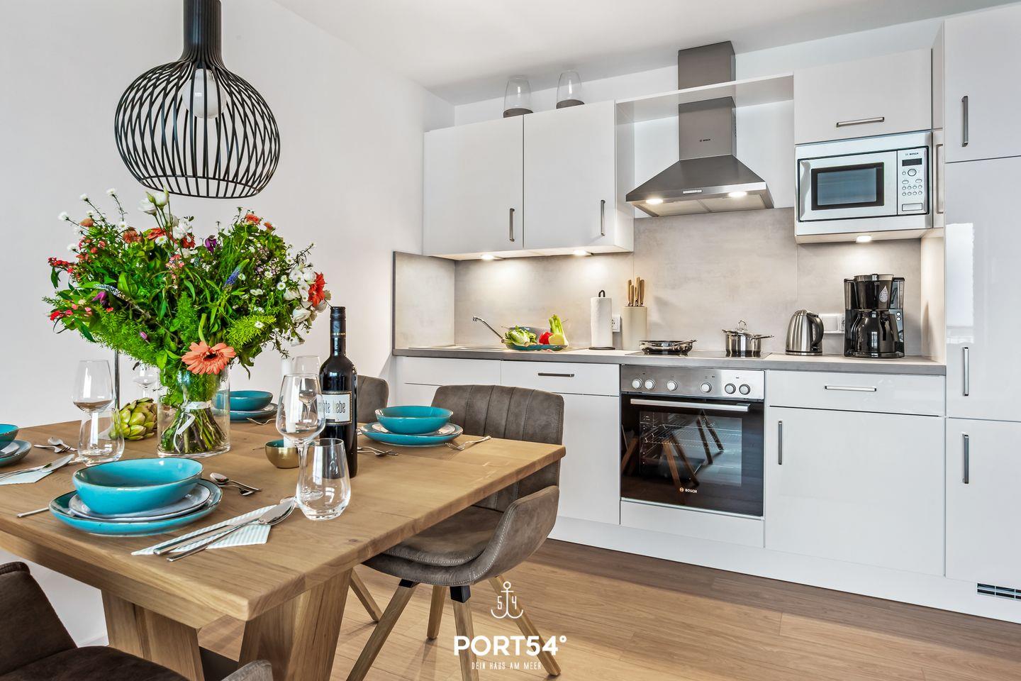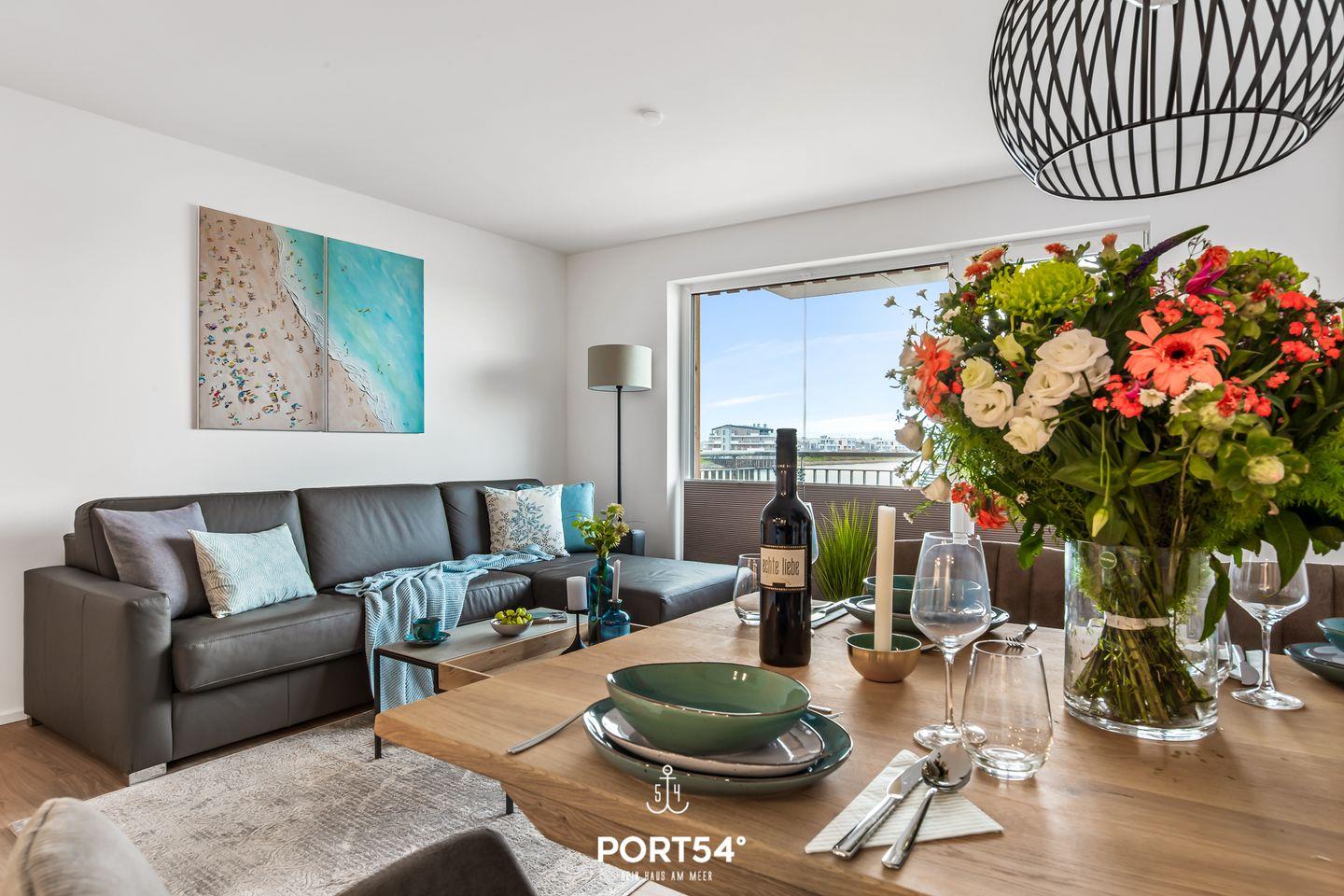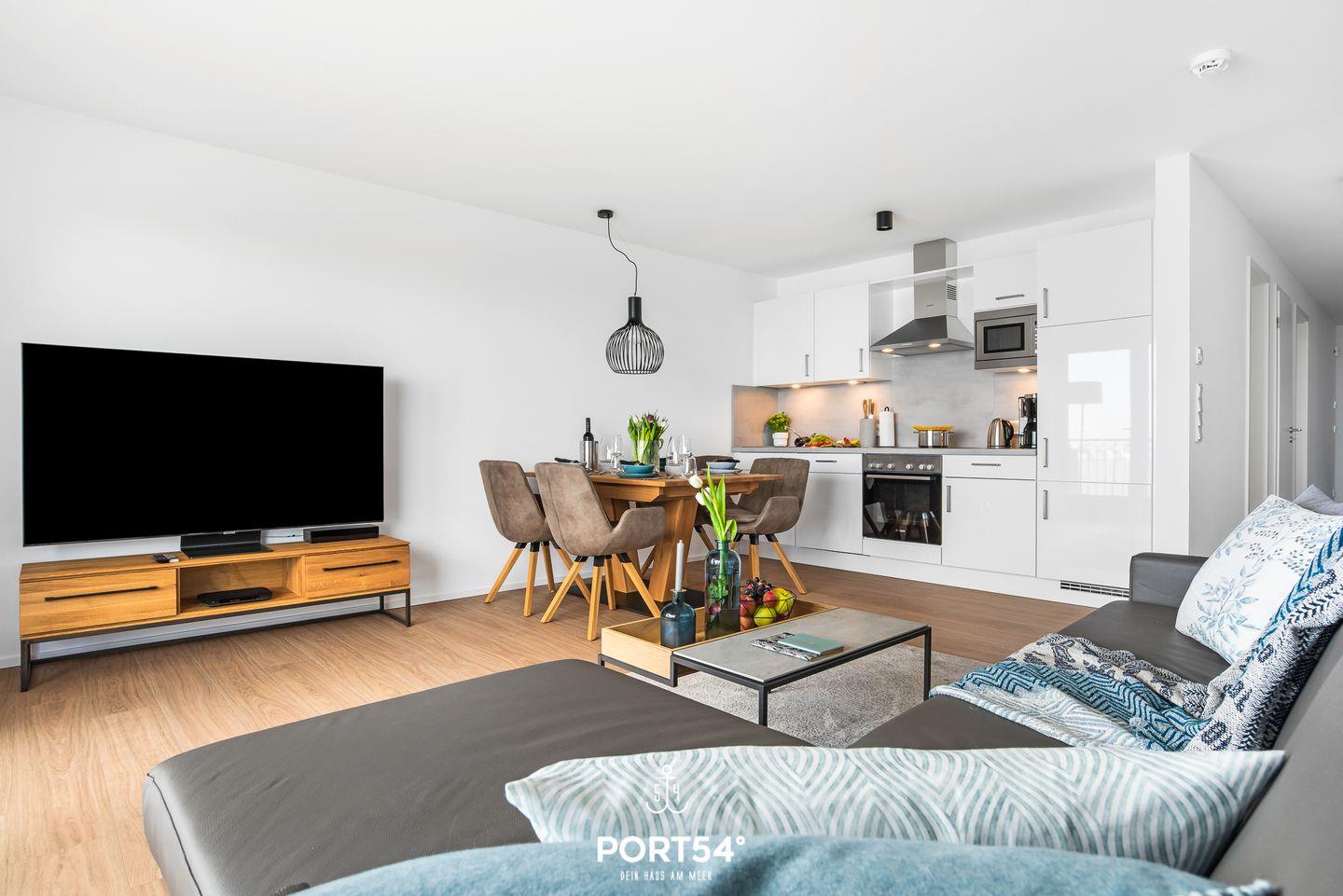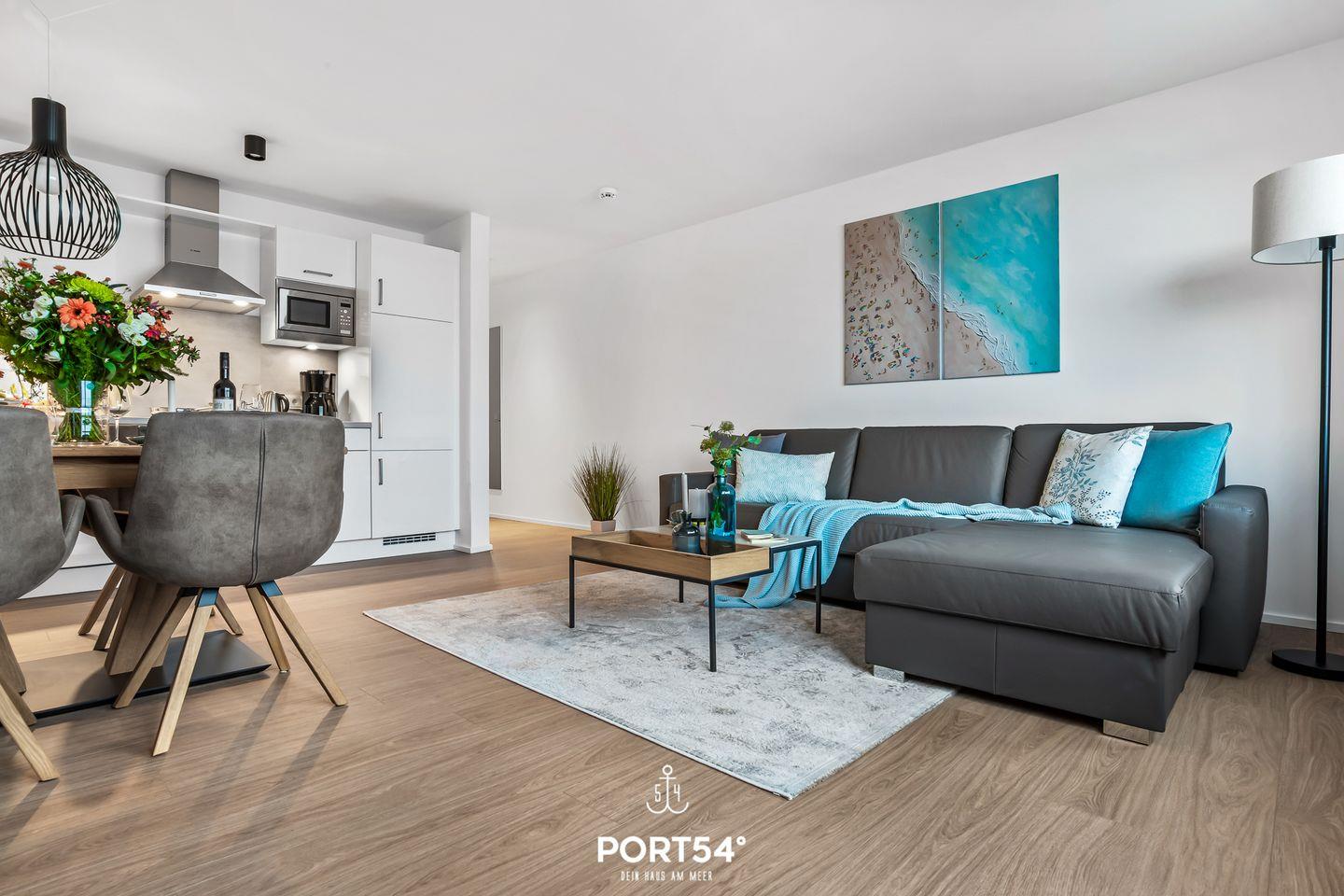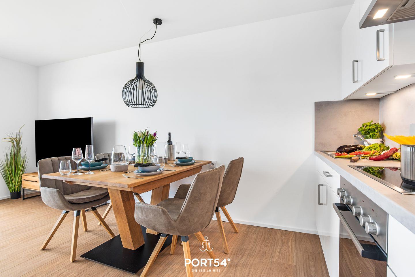 Willkommen in der Ferienwohnung "Hafenflair", wo auf rund 54m² moderner Komfort und hochwertige Ausstattung aufeinandertreffen und Ihnen Urlaub der Extraklasse versprechen! Diese schicke Ferienwohnung im ersten Obergeschoss hält nicht nur ein Schlafzimmer für Sie bereit, sondern auch eine offene, vollausgestattete Küche, ein Badezimmer mit ebenerdiger Dusche und einen gemütlichen Wohnbereich mit einem Ausblick, der Ihnen den Atem rauben wird. Im Schlafzimmer erwartet Sie ein gemütliches Doppelbett (180x200cm) sowie ein Flatscreen-TV, der für entspannte Abende sorgt. Doch das wahre Highlight der Wohnung ist zweifellos der zauberhafte Balkon, auf dem Sie gemeinsam mit Ihren Liebsten farbenreiche Sonnenaufgänge im Norden genießen können. Ihre vierbeinige Familienmitglieder können gegen Aufpreis gerne mitreisen.