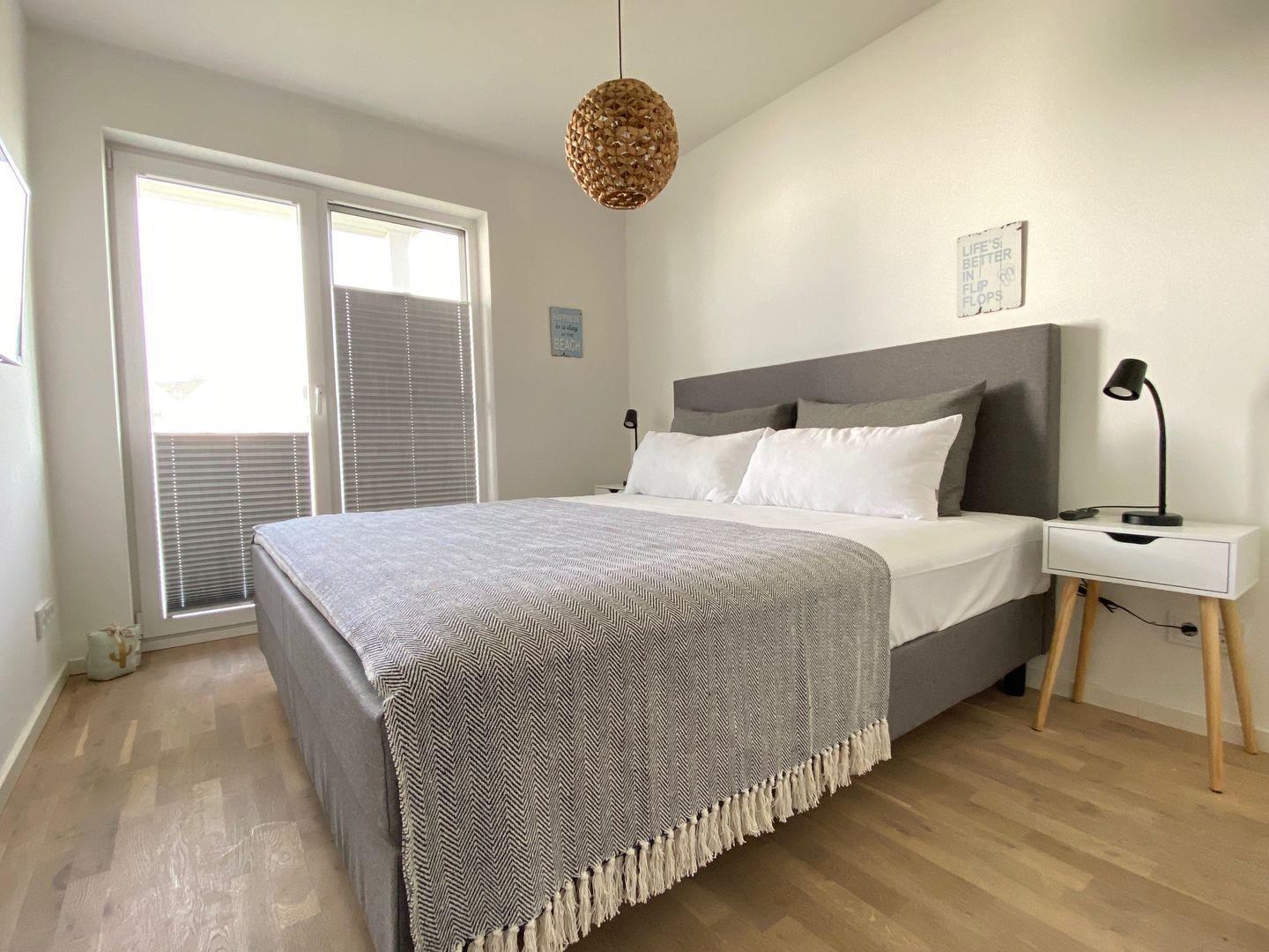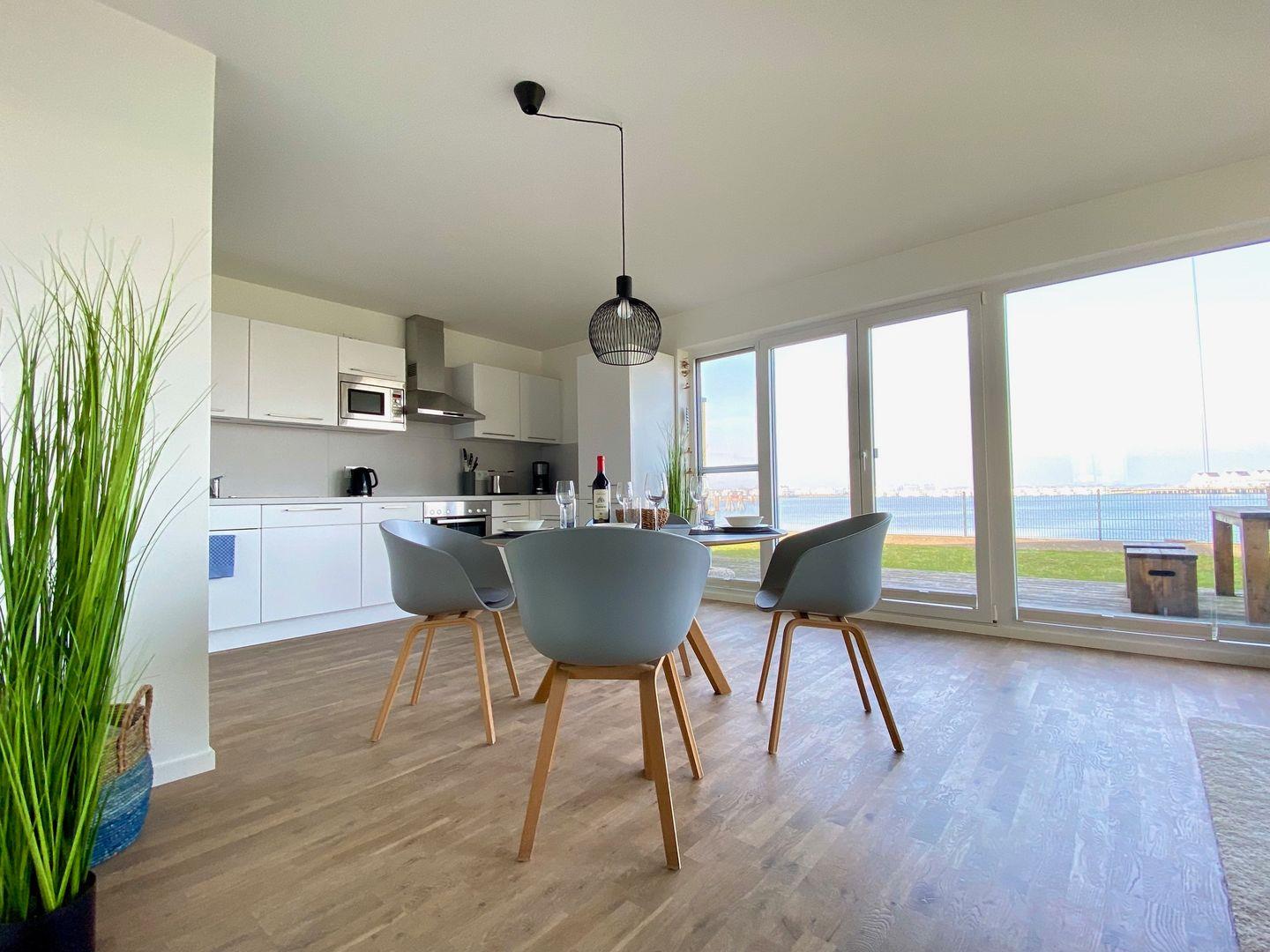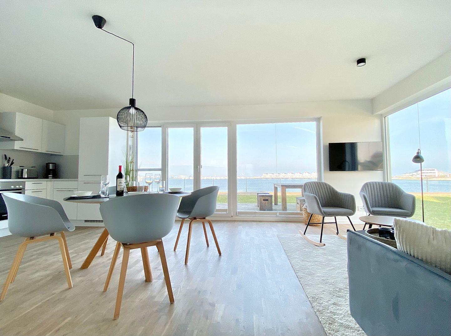 Herzlich willkommen in der traumhaften Ferienwohnung "Pier 21" mit atemberaubendem Meerblick in Olpenitz! Hier erwartet Sie auf großzügigen 83m² ein Urlaubserlebnis der Extraklasse mit einem offenen Wohn- und Essbereich, einer vollausgestatteten Küche, zwei Schlafzimmern, einem luxuriösen Badezimmer und einer einladenden Terrasse. Der Wohnbereich ist ein Rückzugsort, um dem Alltag zu entfliehen und inmitten einer entspannten Atmosphäre zur Ruhe zu kommen. In der vollausgestatteten Küche können Sie nach Lust und Laune kulinarische Meisterwerke zaubern und die köstlichen Mahlzeiten dann entweder am Esstisch oder auf der malerischen Sonnenterrasse genießen, die Ihnen einen atemberaubenden Blick auf das Meer bietet. Für unsere kleinen Gäste stehen ein Kinderreisebett und ein Kinderhochstuhl bereit, damit auch die jüngsten Familienmitglieder einen komfortablen Aufenthalt genießen können. Die beiden Schlafzimmer der Ferienwohnung versprechen erholsamen Schlaf – beide sind mit großzügigen Doppelbetten (180x200cm) ausgestattet, eins davon verfügt über einen Smart-TV. Beide Schlafzimmer sind mit Insektenschutzgittern versehen, um ruhige Nächte zu garantieren. Im Badezimmer erwartet Sie neben einem Handtuchtrockner und einem Föhn, eine luxuriöse Whirlwanne sowie das Highlight – eine Infrarot-Sauna! Hier können Sie nach langen Strandspaziergängen oder aufregenden Ausflügen Ihre Sinne verwöhnen und vollkommen abschalten. Die Terrasse lädt zu gemütlichen Sommerabenden unter freiem Himmel ein, wo Sie die frische Ostseeluft und den Meerblick in vollen Zügen genießen können. Tagsüber bietet sich dieser Ort auch perfekt für entspannte Lesestunden an.