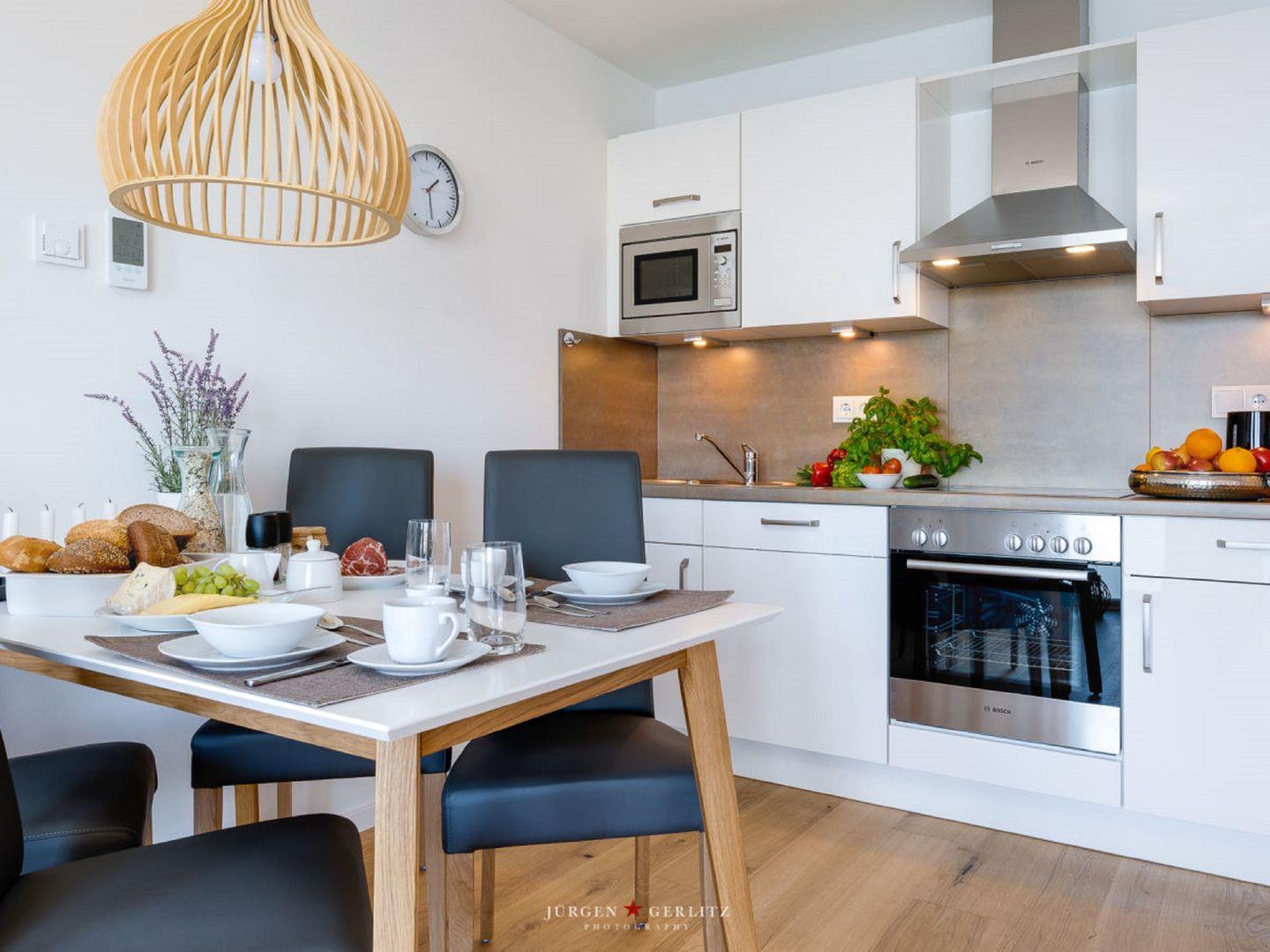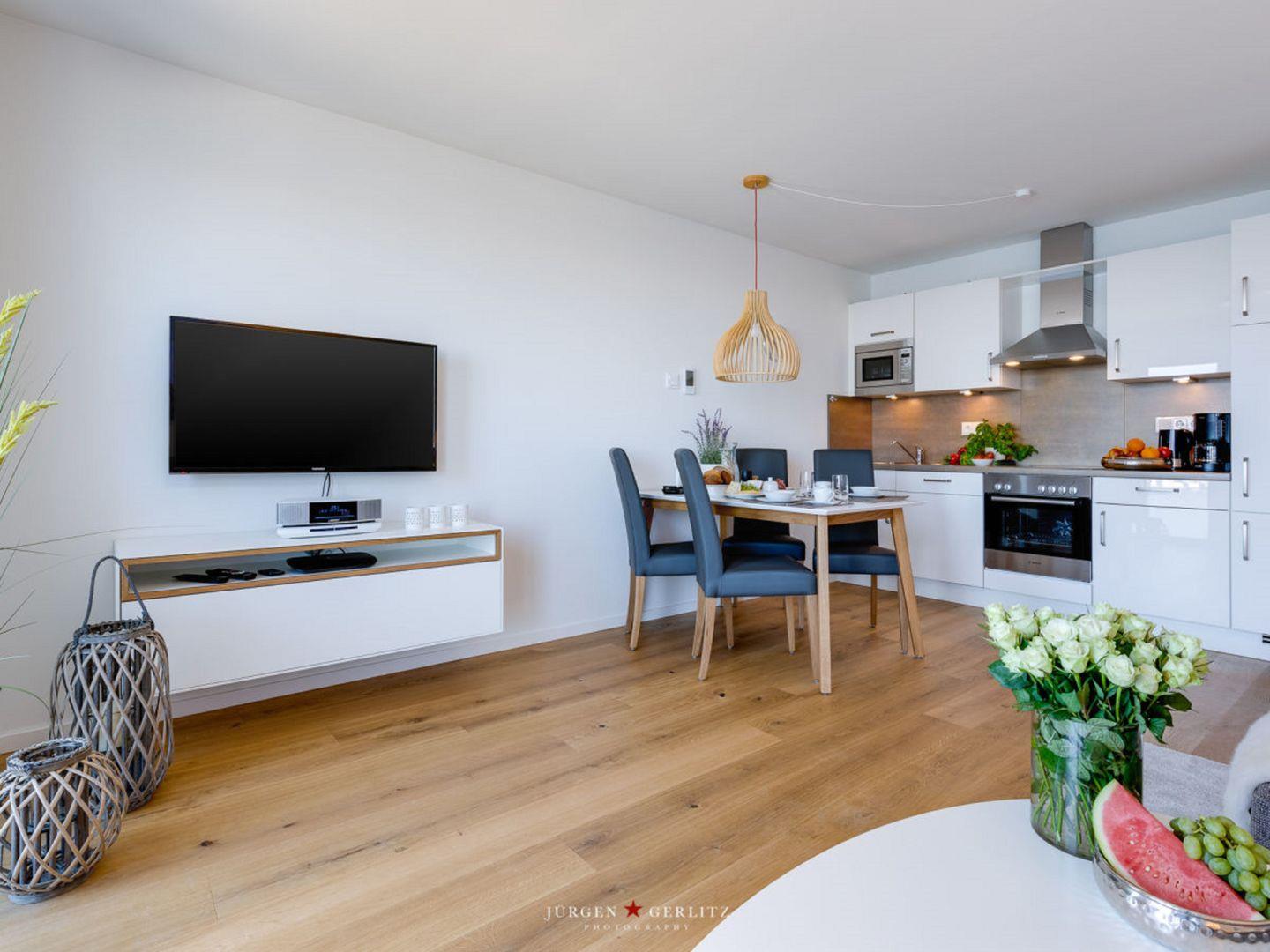 Willkommen in der Ferienwohnung "Knurrhahn"! Dies moderne Wohnung hat einiges zu bieten – einen offenen Wohn-/Essbereich, ein kuscheliges Schlafzimmer, ein modernes Badezimmer und einen Balkon mit einem Wasserblick, der einfach unvergesslich ist! Auf dem Sofa im Wohnbereich können Sie herrlich relaxen, sei es bei spannenden Abenden vor dem Flachbild-TV oder eingekuschelt mit einem guten Buch. Die vollausgestattete Küche lässt Hobbykoch-Herzen höher schlagen - hier können leckere Gerichte zubereitet werden. Auf dem Nord-Ost-Balkon können Sie einen wunderschönen Ausblick auf den Hafen Olpenitz genießen und die Abende bei einem Glas Wein ausklingen lassen. Das gemütliche Schlafzimmer mit TV und Doppelbett (180x200cm) verspricht erholsame Nächte und Entspannung pur. Das Badezimmer punktet mit einer ebenerdigen Dusche.