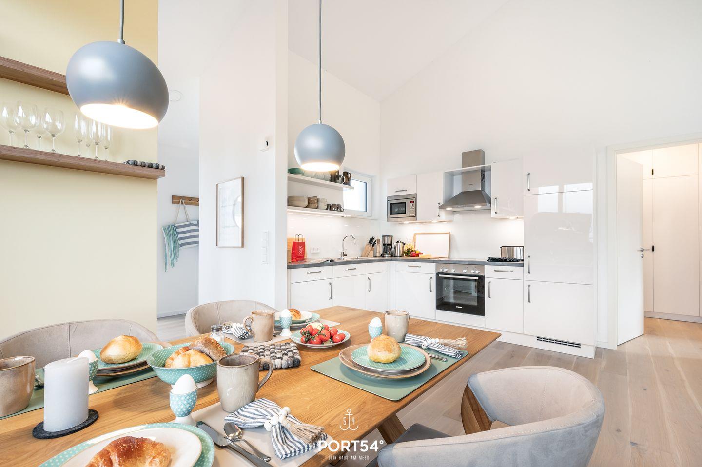 Die voll ausgestattete Küche mit offenem Essbereich lädt Dich zu geselligen Kochabenden ein und lässt keine Wünsche offen.