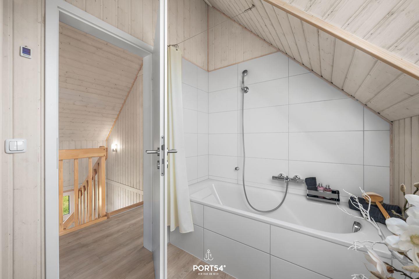 Ein weiteres Wannenbad mit Fenster und Sichtschutz rundet das Obergeschoss ab. Beide Badezimmer sind mit einem Handtuchheizkörper ausgestattet.