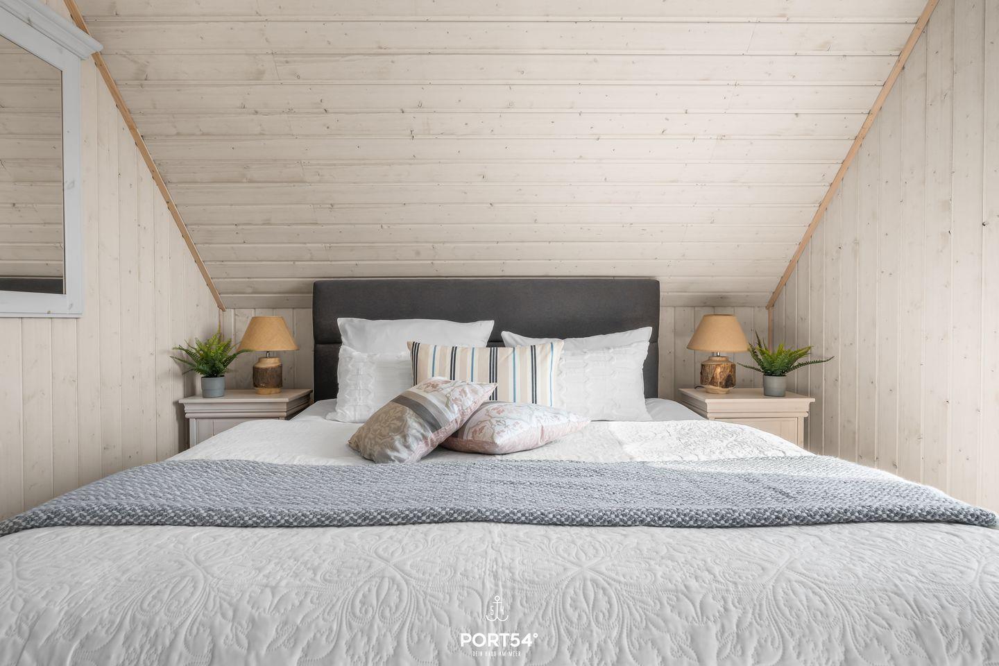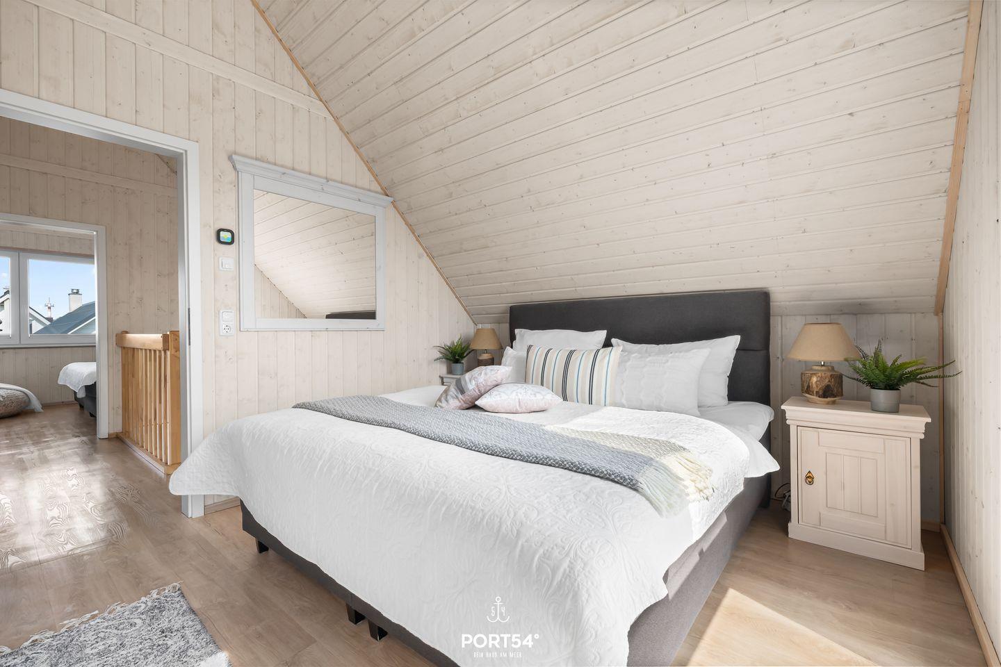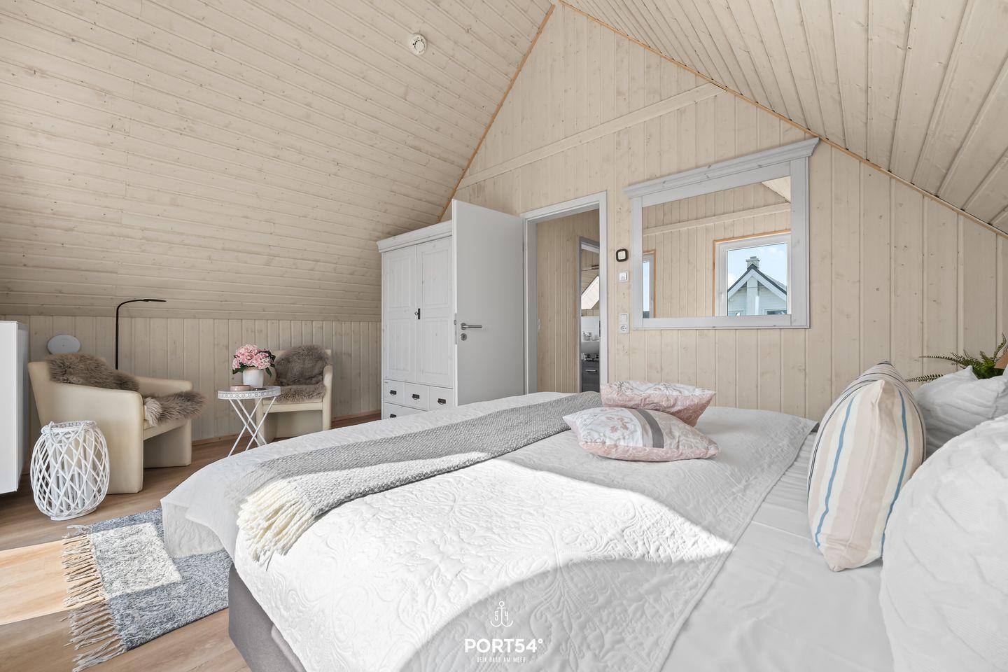 Im Obergeschoss befinden sich die beiden Schlafzimmer, die unter anderem mit Kleiderschränken und Boxspringbetten ausgestattet sind. Ein Schlafzimmer verfügt über ein Doppelbett (180 x 200 cm), das andere über zwei zusammengeschobene Einzelbetten (100 x 200 cm). Ein Kinderhochstuhl sowie ein Kinderreisebett mit Matratze stehen Dir ebenfalls im Haus zur Verfügung.