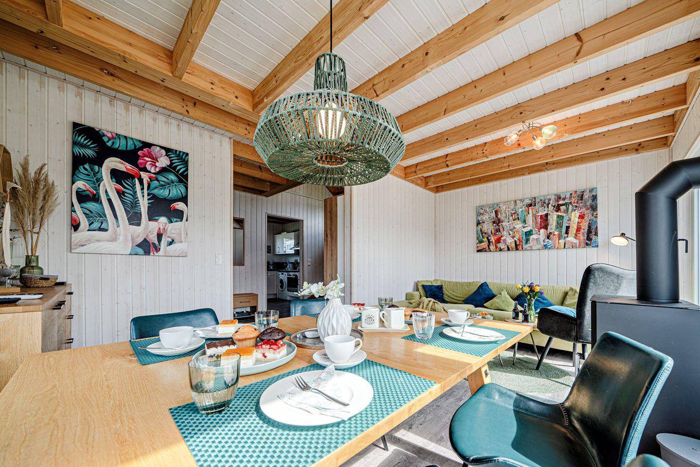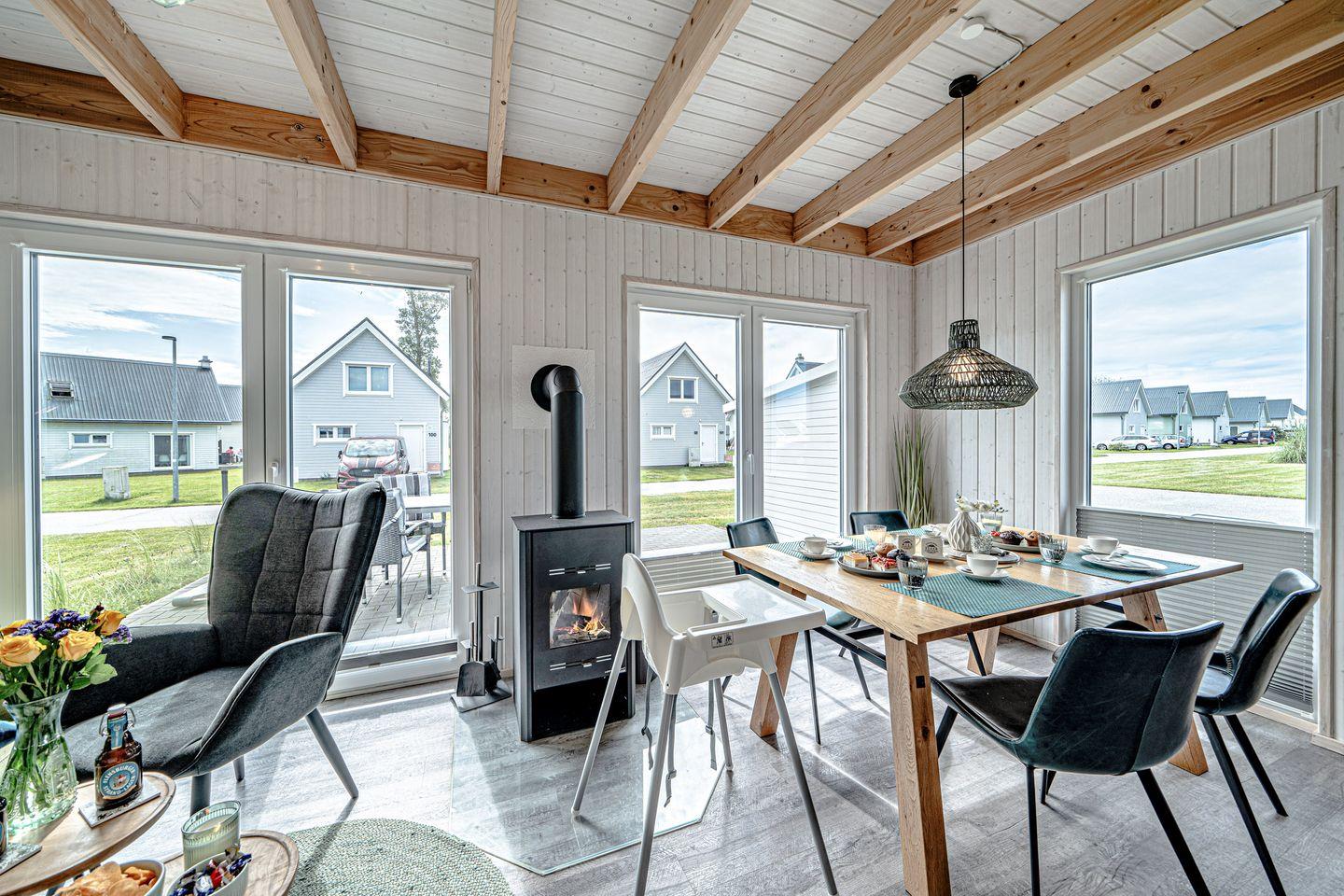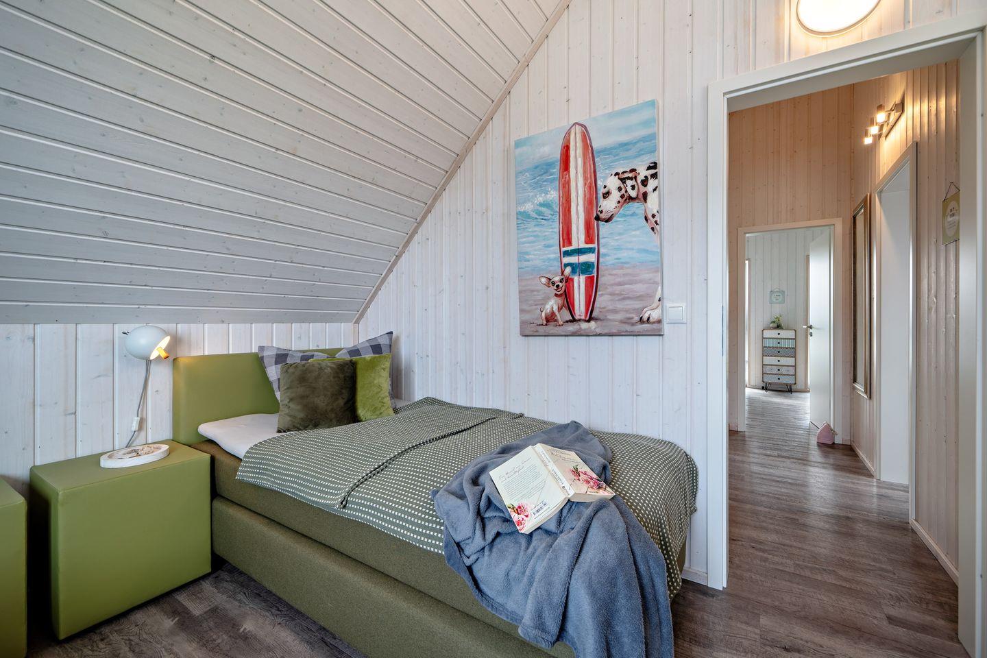 Willkommen im Haus "Küstenkind" in Olpenitz. Das freistehende, 80m² große Haus besticht durch seine Lage im Grünen und der unmittelbaren Nähe zur Ostsee. Das Feriendomizil verfügt über einen offenen Wohn- und Essbereich, eine Küche, zwei Schlafzimmer und zwei Bäder. Die großen Fenster sorgen für ein lichtdurchflutetes, großzügiges Wohngefühl. Nach langen Strandspaziergängen können Sie auf dem gemütlichen Sofa vor dem Kamin entspannen, ein gutes Buch lesen oder Ihre Lieblingsserie auf dem Flachbild-TV schauen. Für die Kleinen steht ein Babybett und ein Kinderhochstuhl bereit. Die voll ausgestattete Küche bietet alles, was Sie für einen geselligen Kochabend mit der Familie benötigen. Im ersten Obergeschoss befinden sich die zwei Schlafzimmer: Das eine ist mit einem Schrank und einem gemütlichen Boxspringbett (180x200cm) ausgestattet, das andere verfügt über zwei Boxspringbetten (je 100x200cm), ebenfalls über einen Schrank und einen Smart-TV. Beide Zimmer bieten Verdunkelungsmöglichkeiten, so dass einem erholsamen Schlaf nichts mehr im Wege steht. Falls sich das Wetter einmal von der schlechten Seite zeigen sollte, können Sie sich die Zeit an einem Kickertisch vertreiben, an der Spielekonsole "daddeln" oder auf Disney Plus einen Film schauen. Ein Badezimmer befindet sich im Erdgeschoss und ist mit einer ebenerdigen Dusche, einer Handtuchheizung und dem Highlight: einer Infrarot-Sauna ausgestattet. Hier können Sie sich an kalten Tagen aufwärmen und entspannen. Das andere Badezimmer im ersten Obergeschoss bietet ebenfalls eine Handtuchheizung, eine gemütliche Badewanne und einen Föhn. An sonnigen Tagen können Sie es sich auf der möblierten Terrasse gemütlich machen. Die Sonnenliegen laden zu erholsamen Urlaubstagen ein und an lauen Sommerabenden können Sie mit der Familie die Tage auf der Terrasse ausklingen lassen. Ihre Fellnase ist nicht nur geduldet, sondern herzlich Willkommen. Für Ihren PKW befindet sich ein Stellplatz vor dem Haus. Im abschließbaren Fahrradschuppen können Sie Ihre mitgebrachten oder ausgeliehenen Fahrräder sicher abstellen. Das Haus ist für 4 Personen ausgestattet.