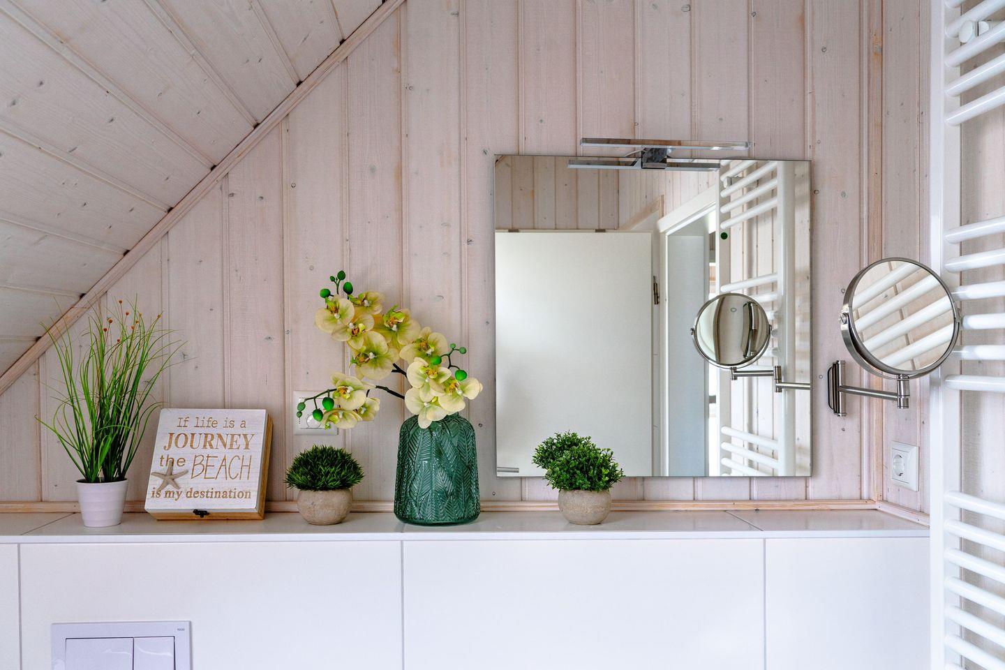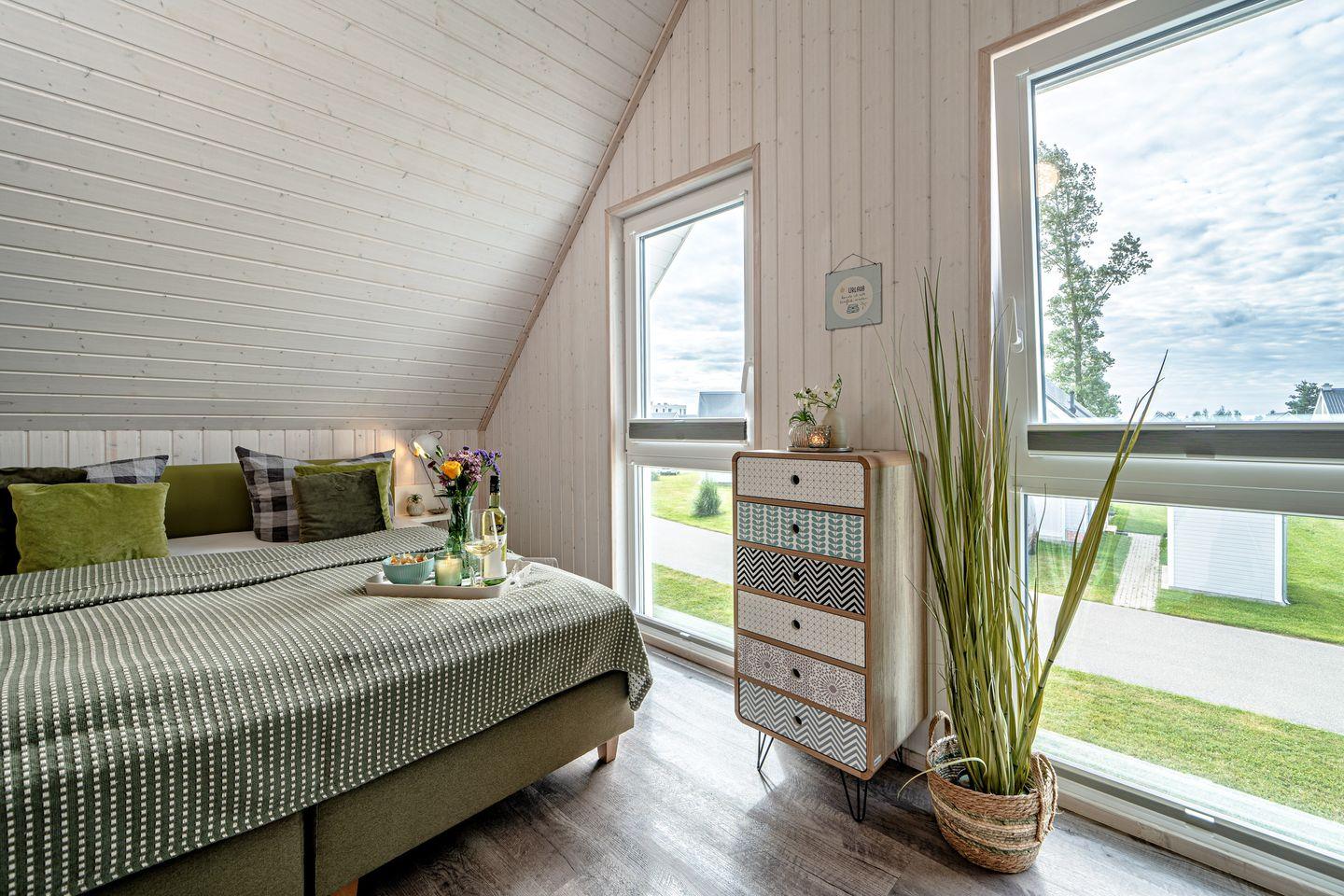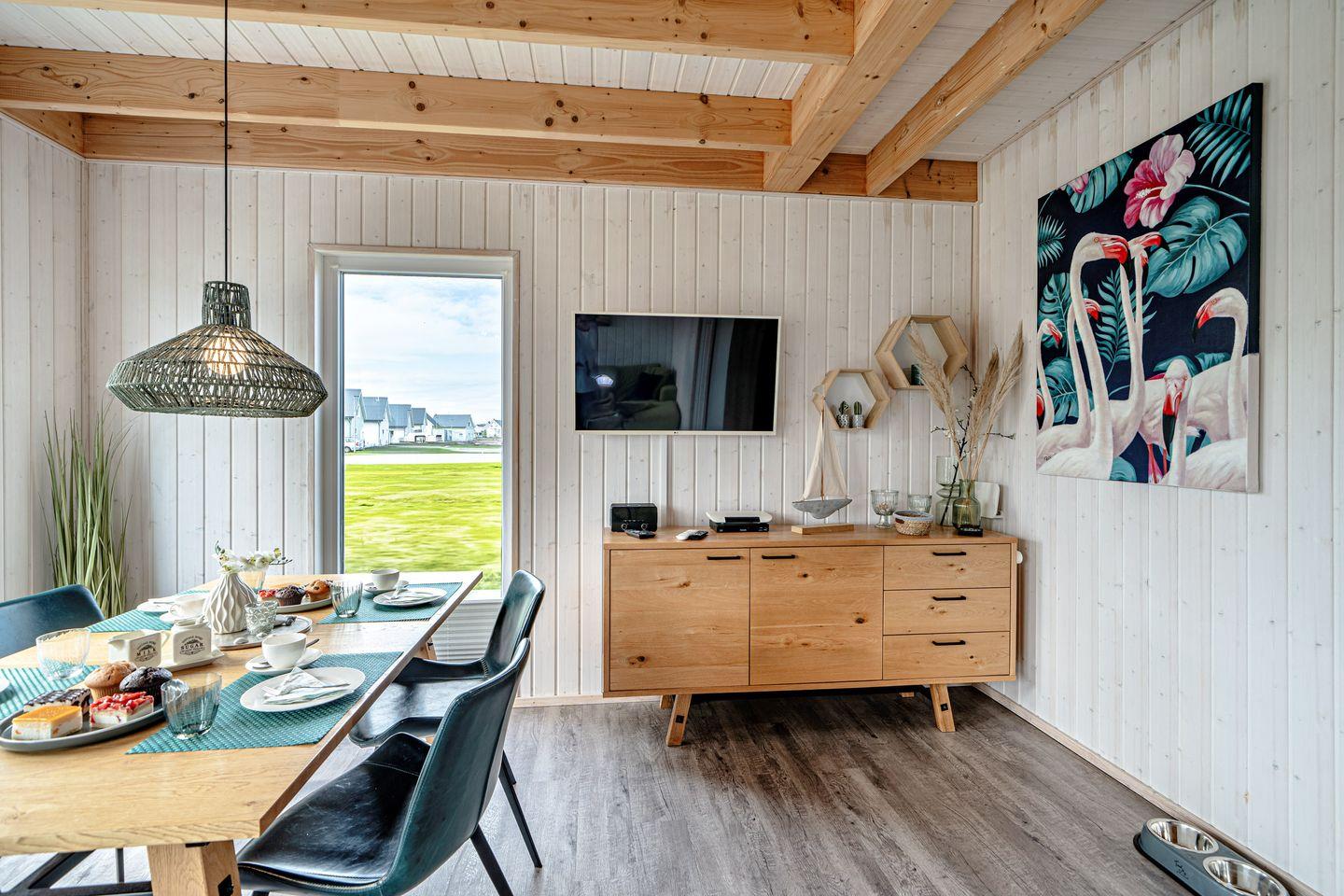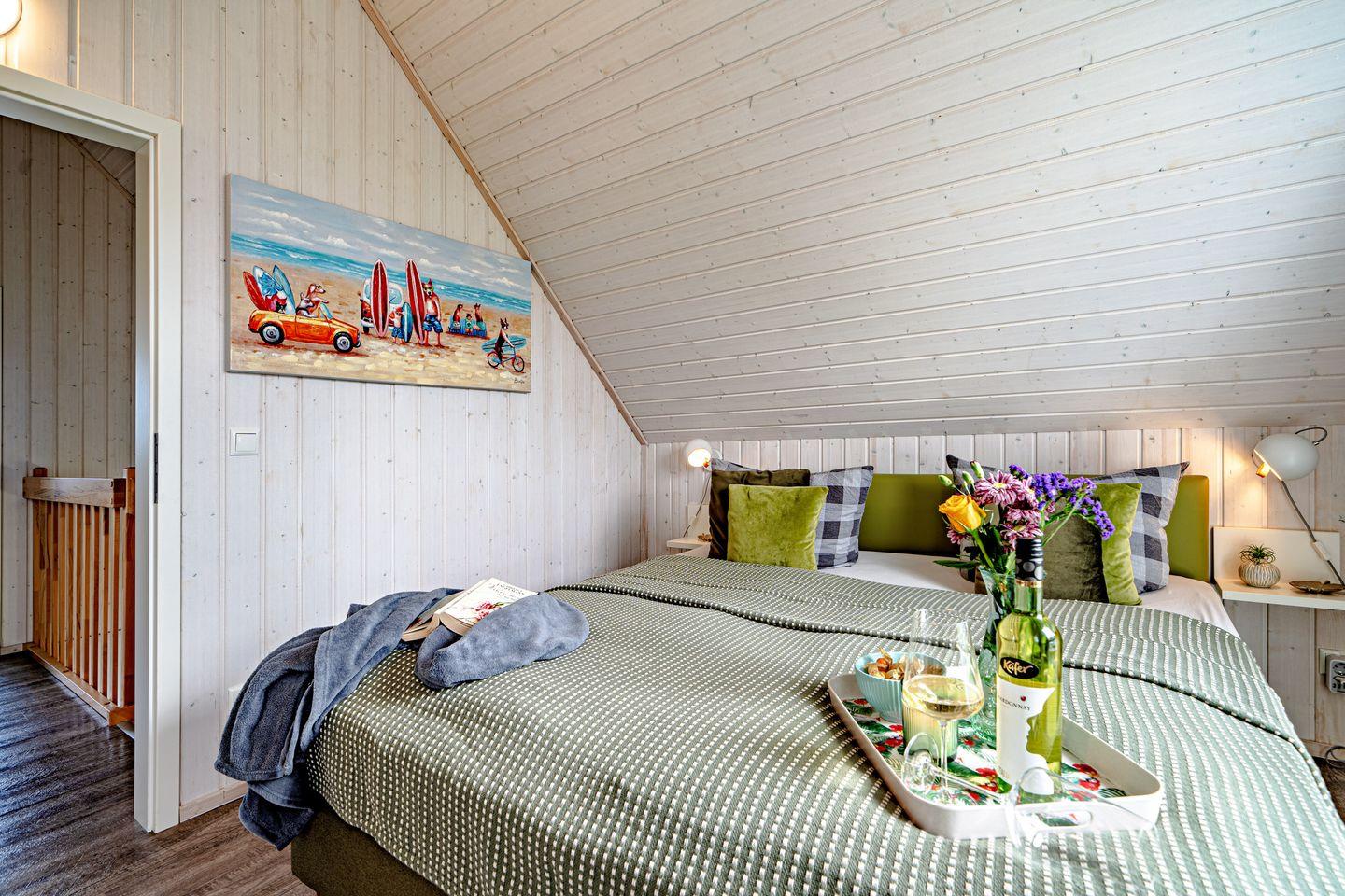Willkommen im Haus "Küstenkind" in Olpenitz. Das freistehende, 80m² große Haus besticht durch seine Lage im Grünen und der unmittelbaren Nähe zur Ostsee. Das Feriendomizil verfügt über einen offenen Wohn- und Essbereich, eine Küche, zwei Schlafzimmer und zwei Bäder. Die großen Fenster sorgen für ein lichtdurchflutetes, großzügiges Wohngefühl. Nach langen Strandspaziergängen können Sie auf dem gemütlichen Sofa vor dem Kamin entspannen, ein gutes Buch lesen oder Ihre Lieblingsserie auf dem Flachbild-TV schauen. Für die Kleinen steht ein Babybett und ein Kinderhochstuhl bereit. Die voll ausgestattete Küche bietet alles, was Sie für einen geselligen Kochabend mit der Familie benötigen. Im ersten Obergeschoss befinden sich die zwei Schlafzimmer: Das eine ist mit einem Schrank und einem gemütlichen Boxspringbett (180x200cm) ausgestattet, das andere verfügt über zwei Boxspringbetten (je 100x200cm), ebenfalls über einen Schrank und einen Smart-TV. Beide Zimmer bieten Verdunkelungsmöglichkeiten, so dass einem erholsamen Schlaf nichts mehr im Wege steht. Falls sich das Wetter einmal von der schlechten Seite zeigen sollte, können Sie sich die Zeit an einem Kickertisch vertreiben, an der Spielekonsole "daddeln" oder auf Disney Plus einen Film schauen. Ein Badezimmer befindet sich im Erdgeschoss und ist mit einer ebenerdigen Dusche, einer Handtuchheizung und dem Highlight: einer Infrarot-Sauna ausgestattet. Hier können Sie sich an kalten Tagen aufwärmen und entspannen. Das andere Badezimmer im ersten Obergeschoss bietet ebenfalls eine Handtuchheizung, eine gemütliche Badewanne und einen Föhn. An sonnigen Tagen können Sie es sich auf der möblierten Terrasse gemütlich machen. Die Sonnenliegen laden zu erholsamen Urlaubstagen ein und an lauen Sommerabenden können Sie mit der Familie die Tage auf der Terrasse ausklingen lassen. Ihre Fellnase ist nicht nur geduldet, sondern herzlich Willkommen. Für Ihren PKW befindet sich ein Stellplatz vor dem Haus. Im abschließbaren Fahrradschuppen können Sie Ihre mitgebrachten oder ausgeliehenen Fahrräder sicher abstellen. Das Haus ist für 4 Personen ausgestattet.