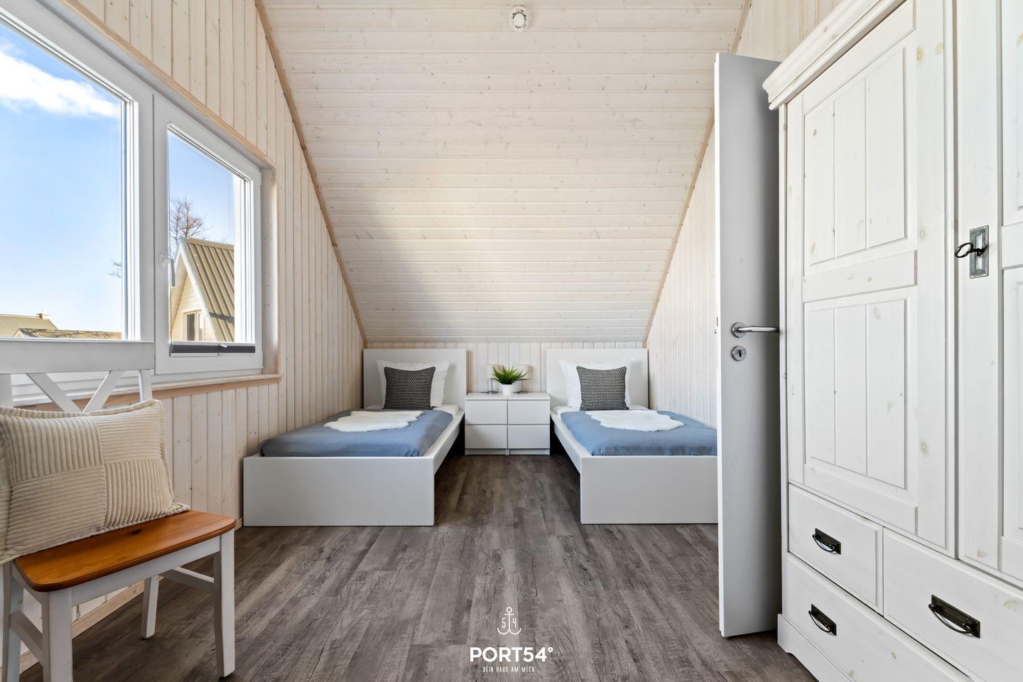 Im Obergeschoss befinden sich die zwei Schlafzimmer. Das eine ist mit einem Doppelbett (180 x 200 cm) ausgestattet, das andere verfügt über zwei Einzelbetten (je 90 x 200 cm). Beide Schlafzimmer sind mit je einem Kleiderschrank, Insektenschutzgitter und Verdunkelungsmöglichkeiten ausgestattet.