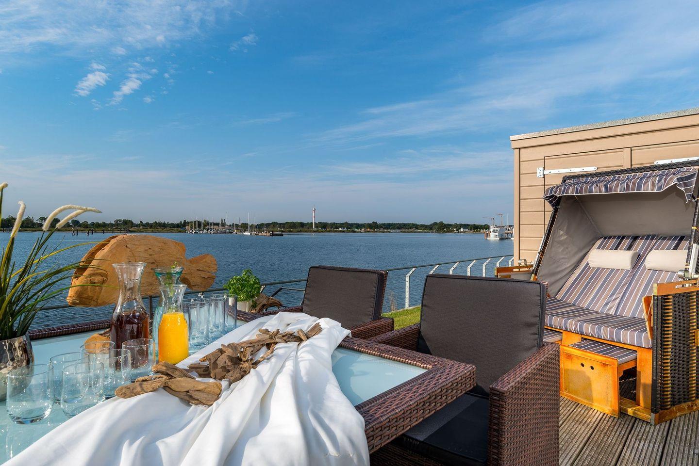 Auf der großen Sonnenterrasse mit Südausrichtung, hochwertigen Loungemöbeln, Strandkorb, Sonnenschirm und Grill können sie vom Alltag ausspannen und den Segelbooten beim Ein- und Auslaufen zusehen. In dieser liebevoll und sehr stilvoll eingerichteten Ferienwohnung kann man den Urlaub in vollen Zügen genießen und sich rundum wohlfühlen.