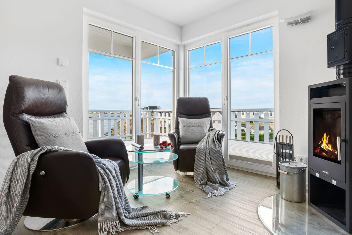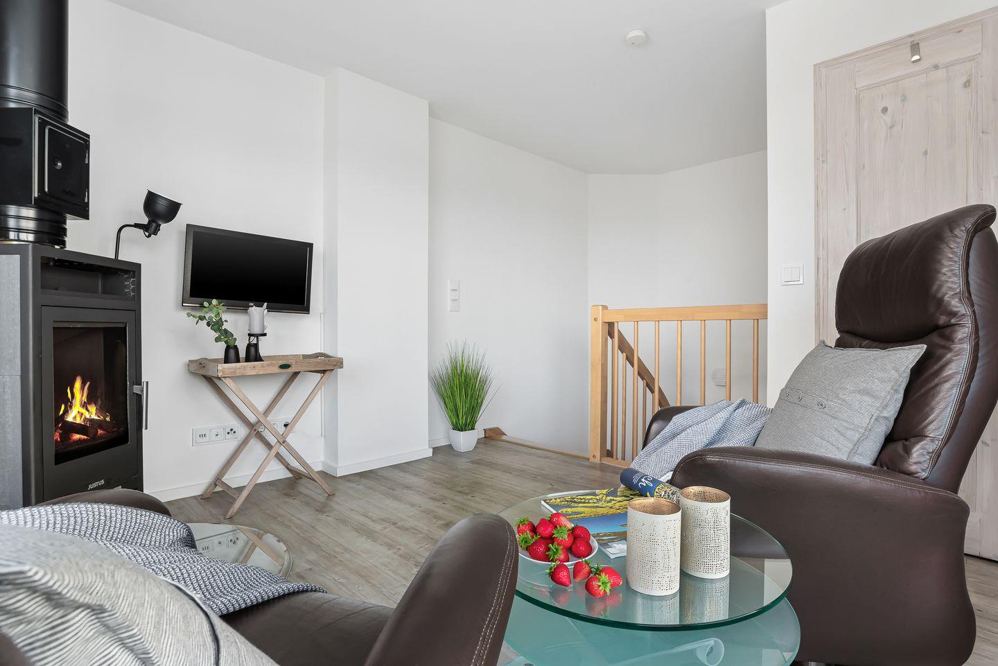 In der dritten Etage bietet ein gemütliches Studio mit zwei bequemen Sesseln, einem Fernseher, einem Kaminofen und einem herrlichen Meerblick den idealen Ort, um den Tag ausklingen zu lassen. Die hauseigene finnische Sauna mit Meerblick und angrenzender Dusche vervollständigen den Traum von einem Wellnessurlaub im Haus am Meer.