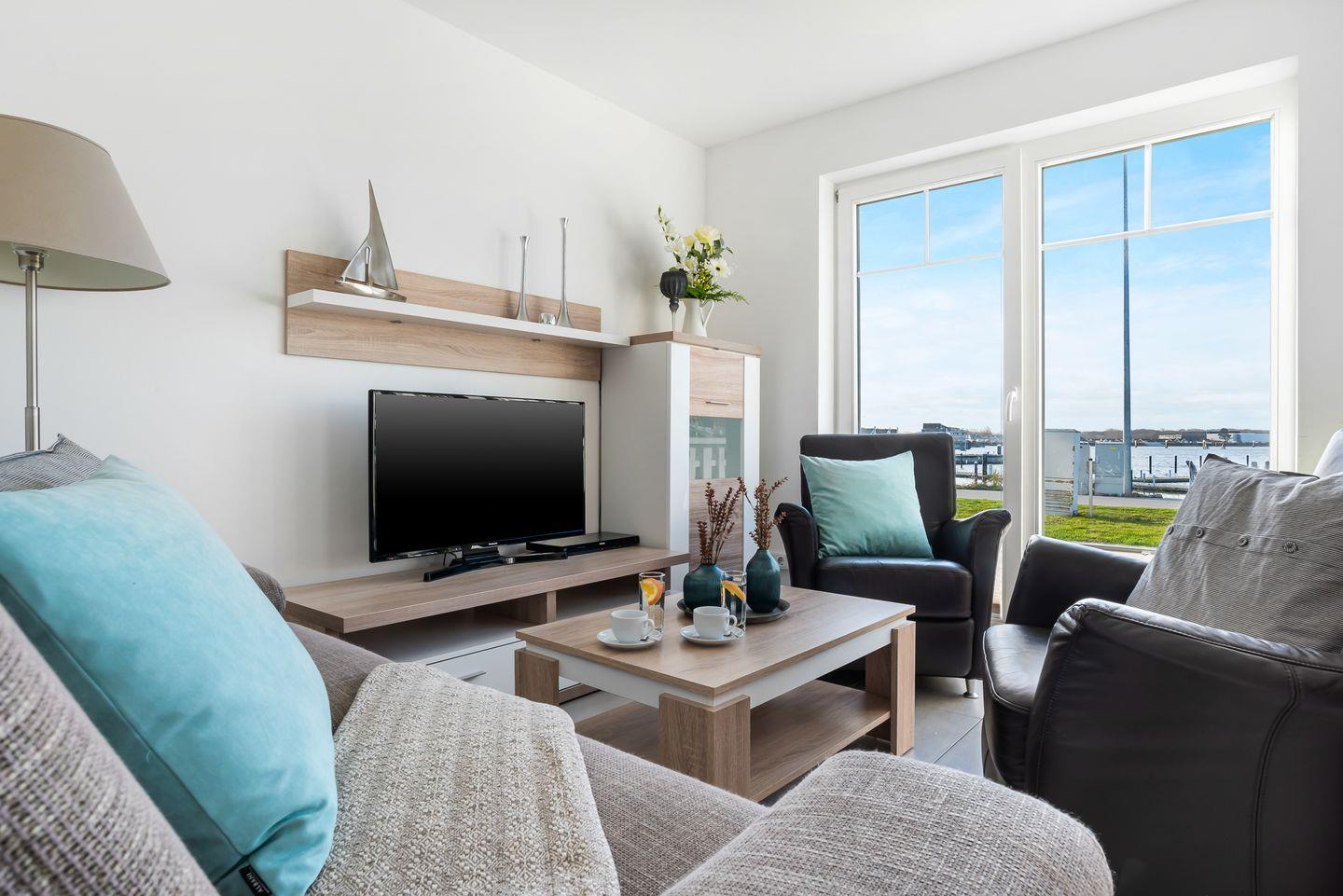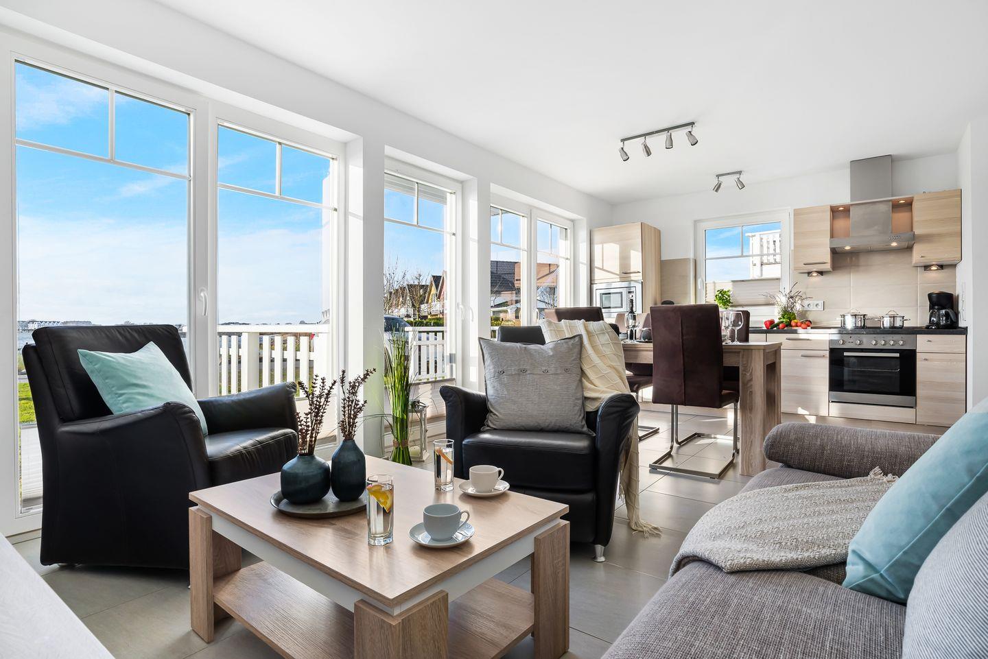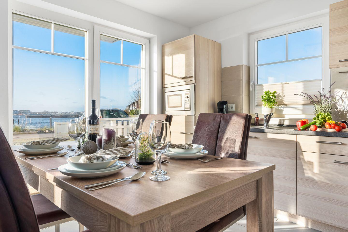 Der helle Wohn- und Essbereich des Ferienhauses "Beach House" befindet sich im Erdgeschoss und dient als zentraler Ort für einen entspannten Aufenthalt mit Familie oder Freunden. Die integrierte, voll ausgestattete Küche bietet hohen Komfort. Bodentiefe Fenster zur Sonnenseite ermöglichen einen direkten Zugang zur angrenzenden Sonnenterrasse mit Blick auf den Segel- und Sportboothafen des Resorts. Ein Gäste-WC trägt im Erdgeschoss zusätzlich zum Komfort bei.