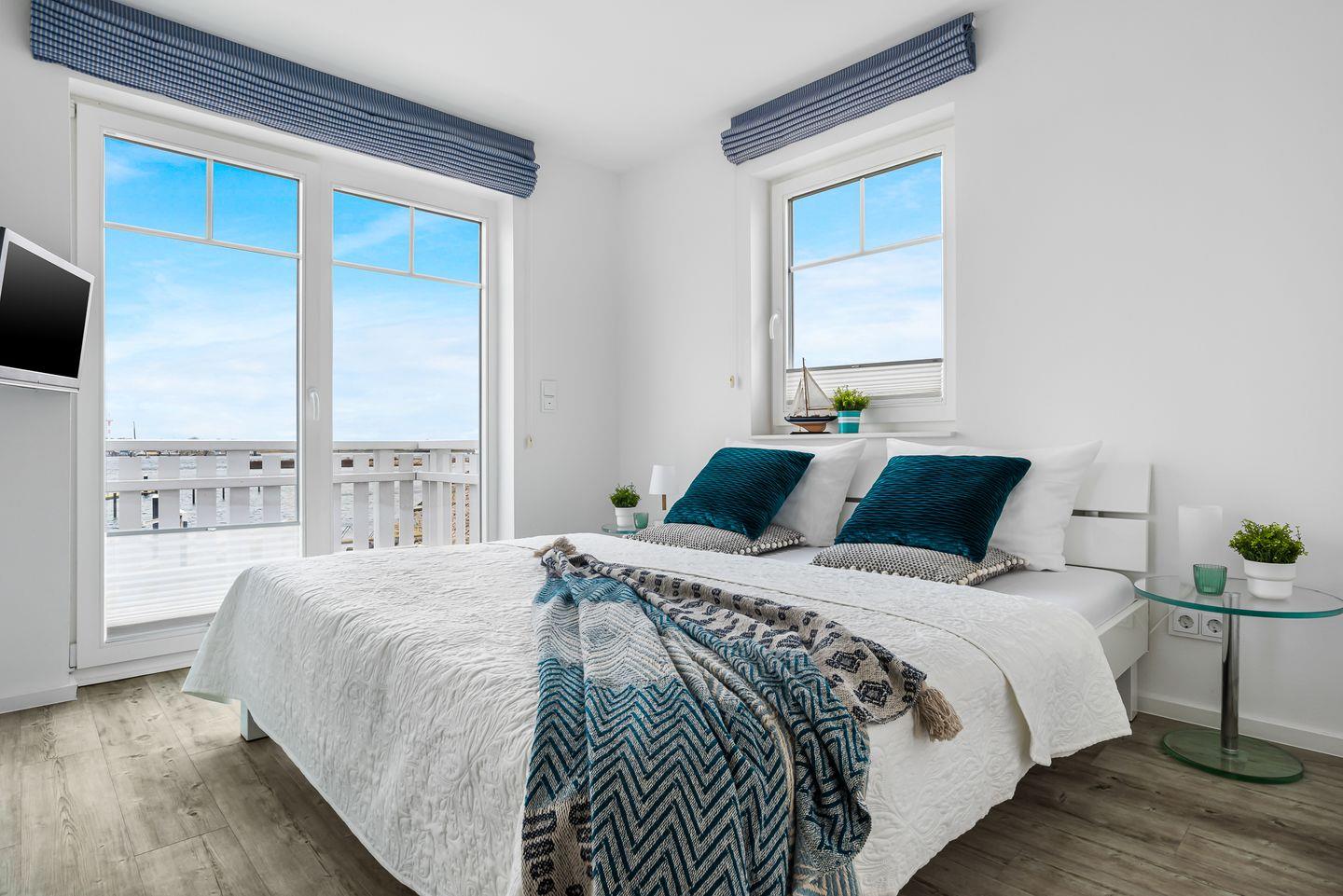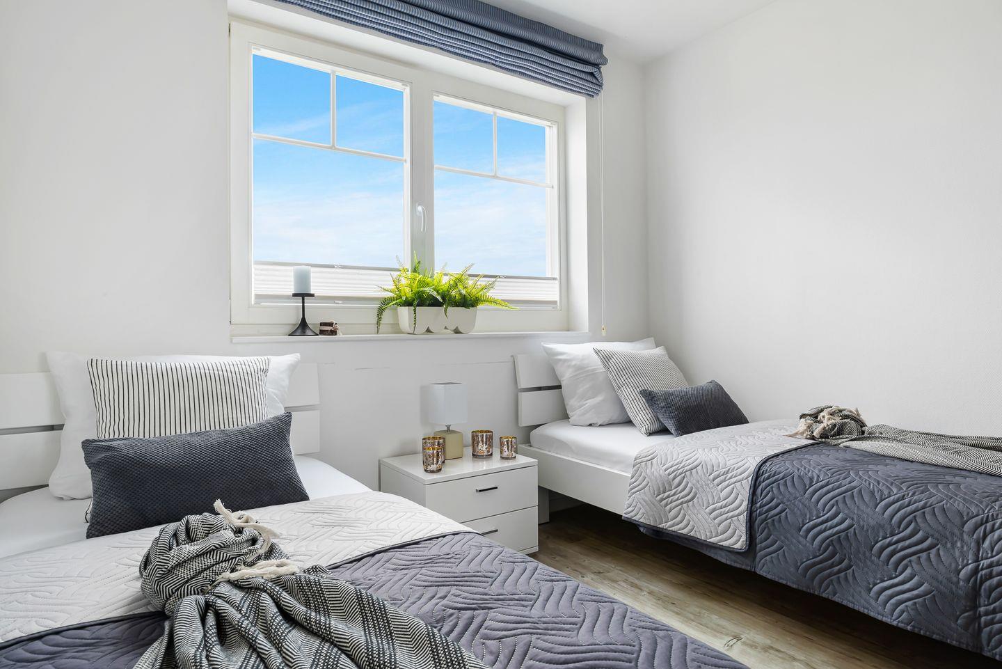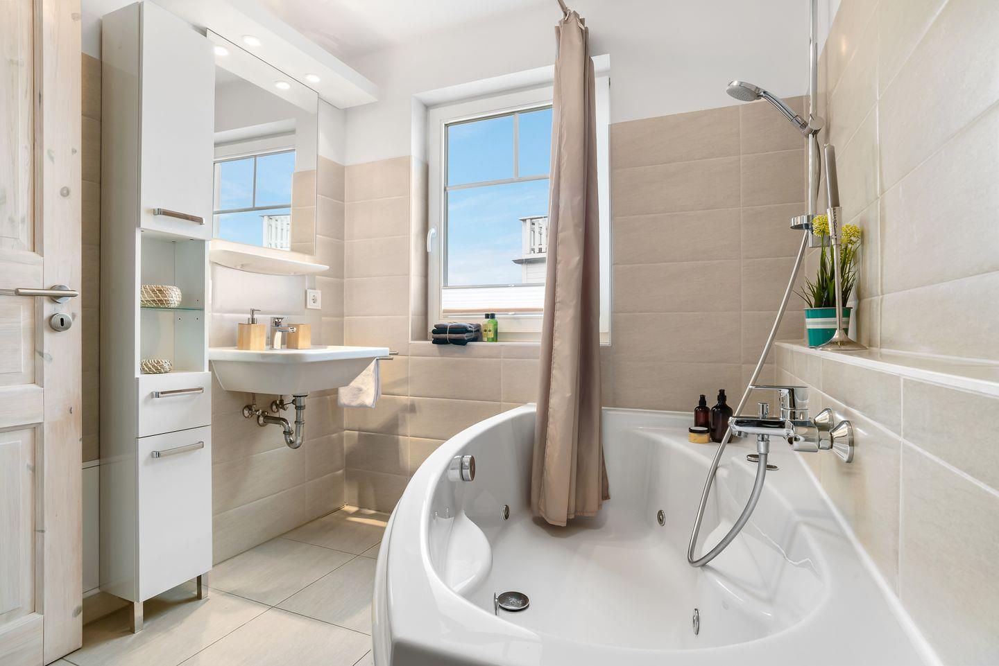 Eine Treppe führt in das erste Obergeschoss, in dem sich zwei freundliche Schlafzimmer und das Badezimmer befinden. Das Hauptschlafzimmer verfügt über ein bequemes Doppelbett, einen Fernseher und einen eigenen Südbalkon. Das zweite Schlafzimmer ist mit zwei Einzelbetten ausgestattet, die eine angenehme Nachtruhe versprechen. Das angrenzende Badezimmer mit großer Whirlpool-Badewanne lädt auch bei ungünstigem Wetter zu entspannenden Stunden im Beach House ein.